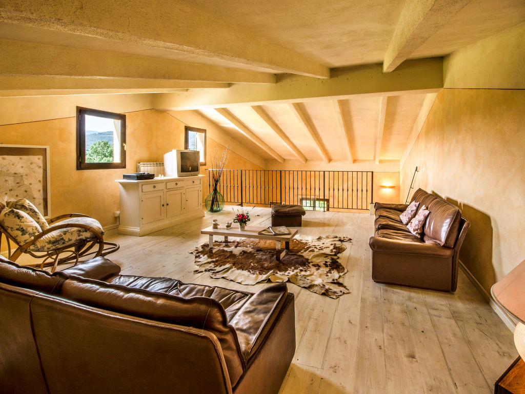 15-Zimmer-Haus 400 bis 540 m2 auf 3 Stockwerken. Rustikal und geschmackvoll eingerichtet: Wohn-/Esszimmer mit Esstisch, Sat-TV, Stereoanlage und DVD. Ausgang zum Garten, Pergola. 3 Zimmer, jedes Zimmer mit 2 Betten (80 cm). 1 Zimmer mit 1 franz. Bett (160 cm), Dusche/WC. Offenes Wohn-/Esszimmer mit Esstisch und Küchenblock. Küche (Backofen, Geschirrspüler, 5 Flammen, Toaster, Wasserkocher, Tiefkühler, elektrische Kaffeemaschine) mit Esstisch. 2 Duschen/WC. G-Heizung. Obergeschoss: Wohnzimmer. 1 Zimmer mit 1 franz. Bett (160 cm), Dusche/WC. 1 Zimmer mit 1 franz. Bett (160 cm), Bad/WC. Verbundenes Zimmer mit 1 franz. Bett (160 cm), Dusche/WC. Offen 1 Zimmer mit 2 Betten (80 cm). Verbundenes Zimmer mit 1 franz. Bett (160 cm), Dusche/WC. Offen 1 Zimmer mit 2 Betten (80 cm). 2. Obergeschoss: offenes Wohnzimmer. 1 Zimmer mit 1 franz. Bett (160 cm), Bad/WC. Holzböden. 2 Terrassen 40 m2, Gartensitzplatz. Terrassenmöbel, Gartengrill. Panoramasicht. Zur Verfügung: Waschmaschine, Bügeleisen. Internet (Wireless LAN, gratis). Bitte beachten: Nichtraucher-Unterkunft. Maximal 3 Haustiere/Hunde erlaubt. Keine interne Verbindung zwischen den separaten Wohneinheiten.