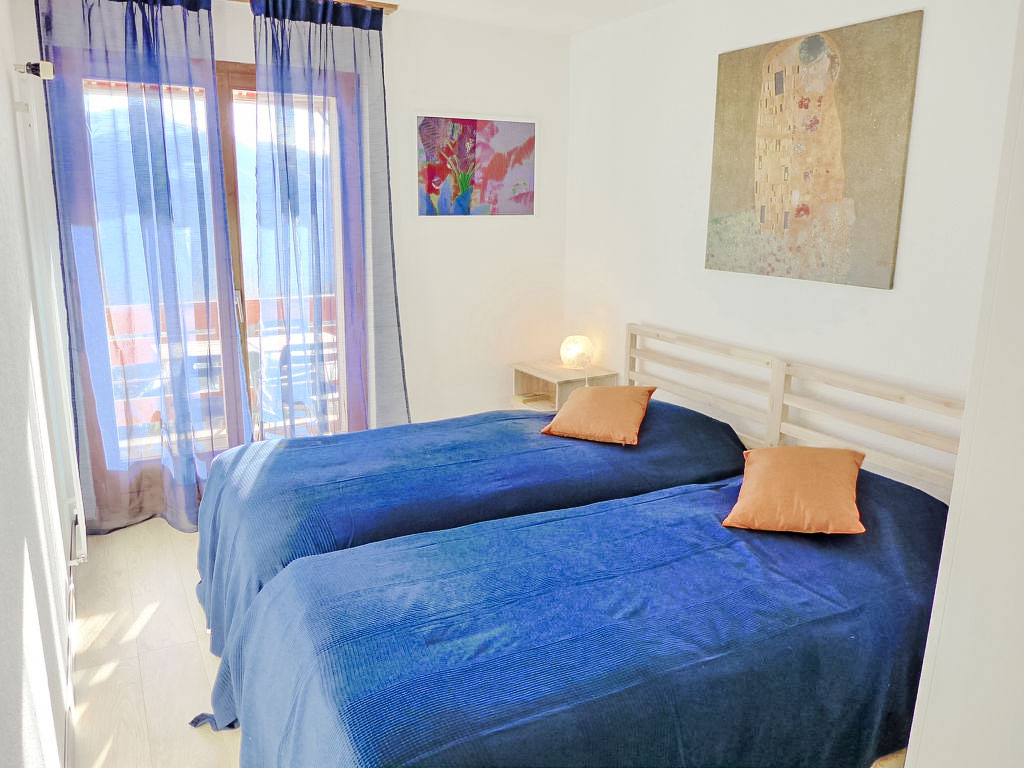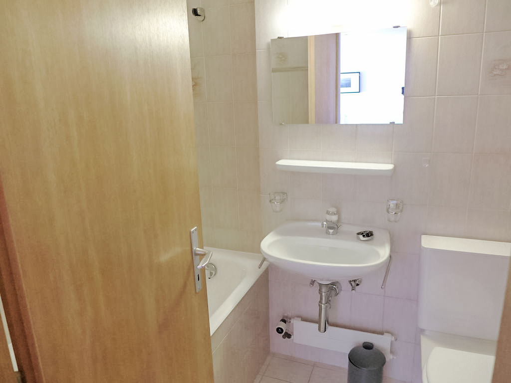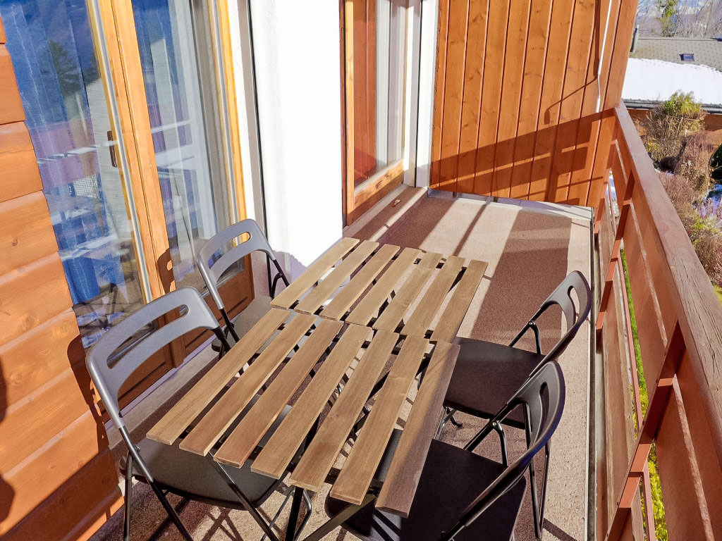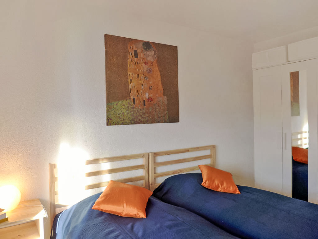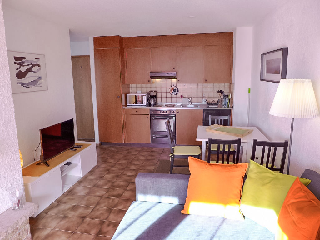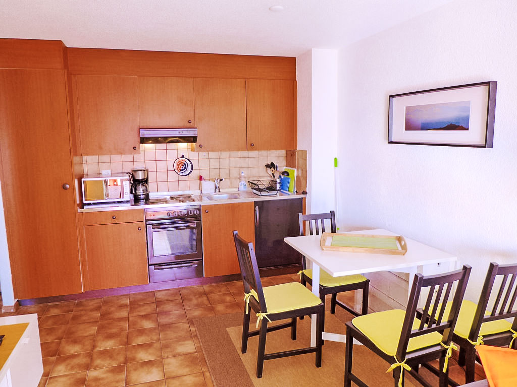 2-Zimmer-Wohnung 40 m2 im 1. Stock. Objekt geeignet für 2 Erwachsene + 2 Kinder. Komfortabel und schön eingerichtet: Wohn-/Esszimmer mit 1 Diwanbett (140 cm, Länge 200 cm), offenem Kamin und Kabel-TV. Ausgang zum Balkon, Richtung Süden. 1 Zimmer mit 2 Betten (90 cm, Länge 200 cm). Ausgang zum Balkon, Richtung Süden. Kochnische (3 Kochplatten, Backofen, Toaster, Wasserkocher, Mikrowelle, elektrische Kaffeemaschine, Racletteofen, Fondue Set (Käse)). Bad/WC. Grosser Balkon 12 m2. Balkonmöbel. Zur Verfügung: Bügeleisen, Haartrockner. Internet (Wireless LAN). Parkplatz Nr. 22 (überdacht), Höhe 205 cm, Breite 205 cm.