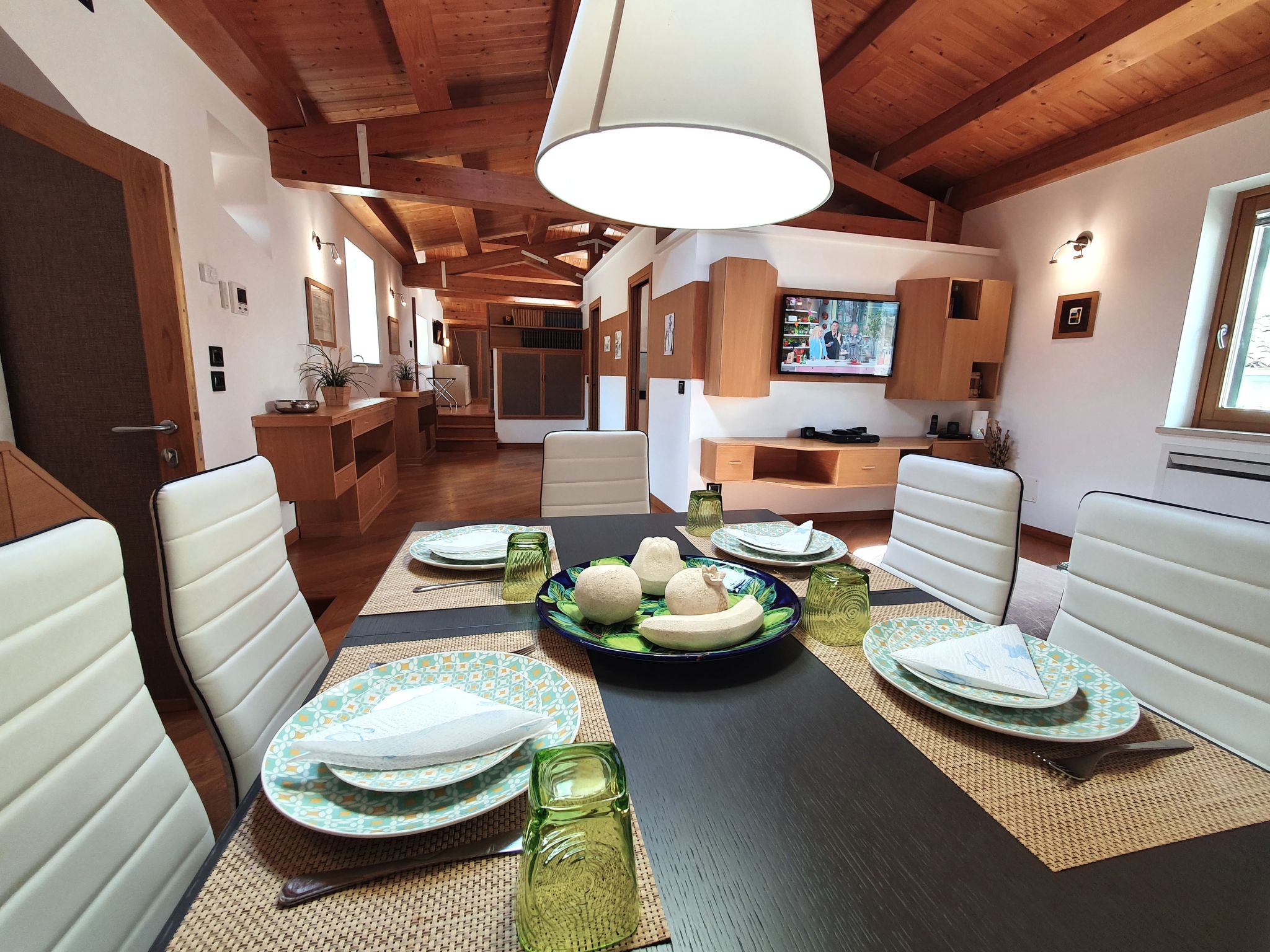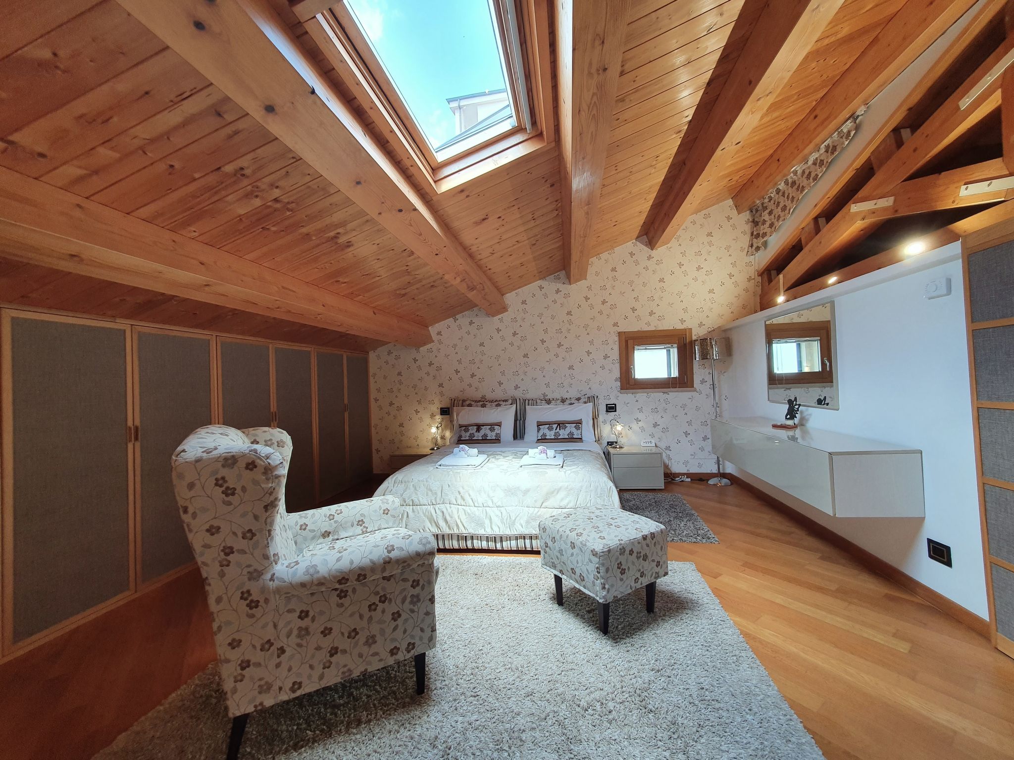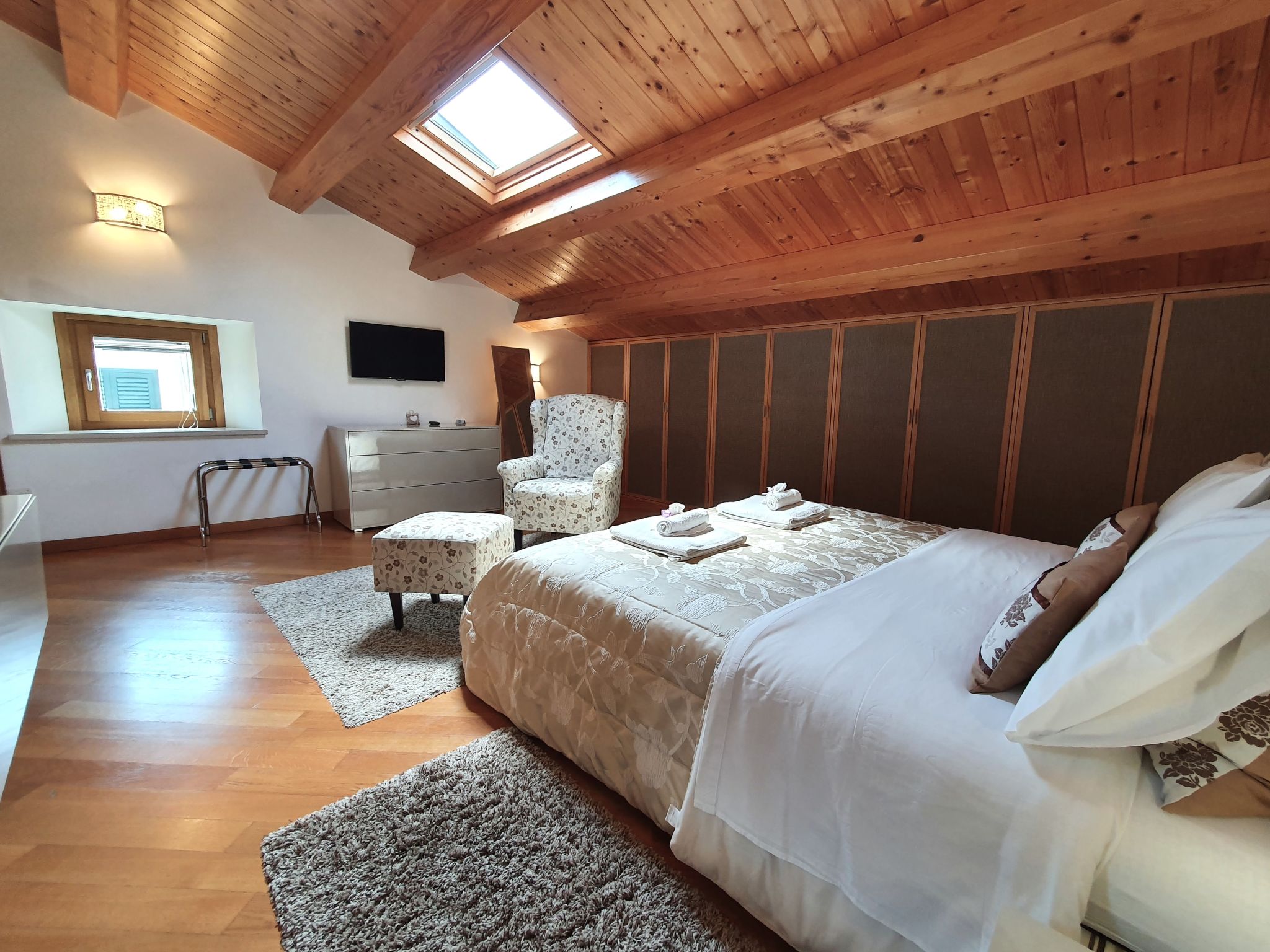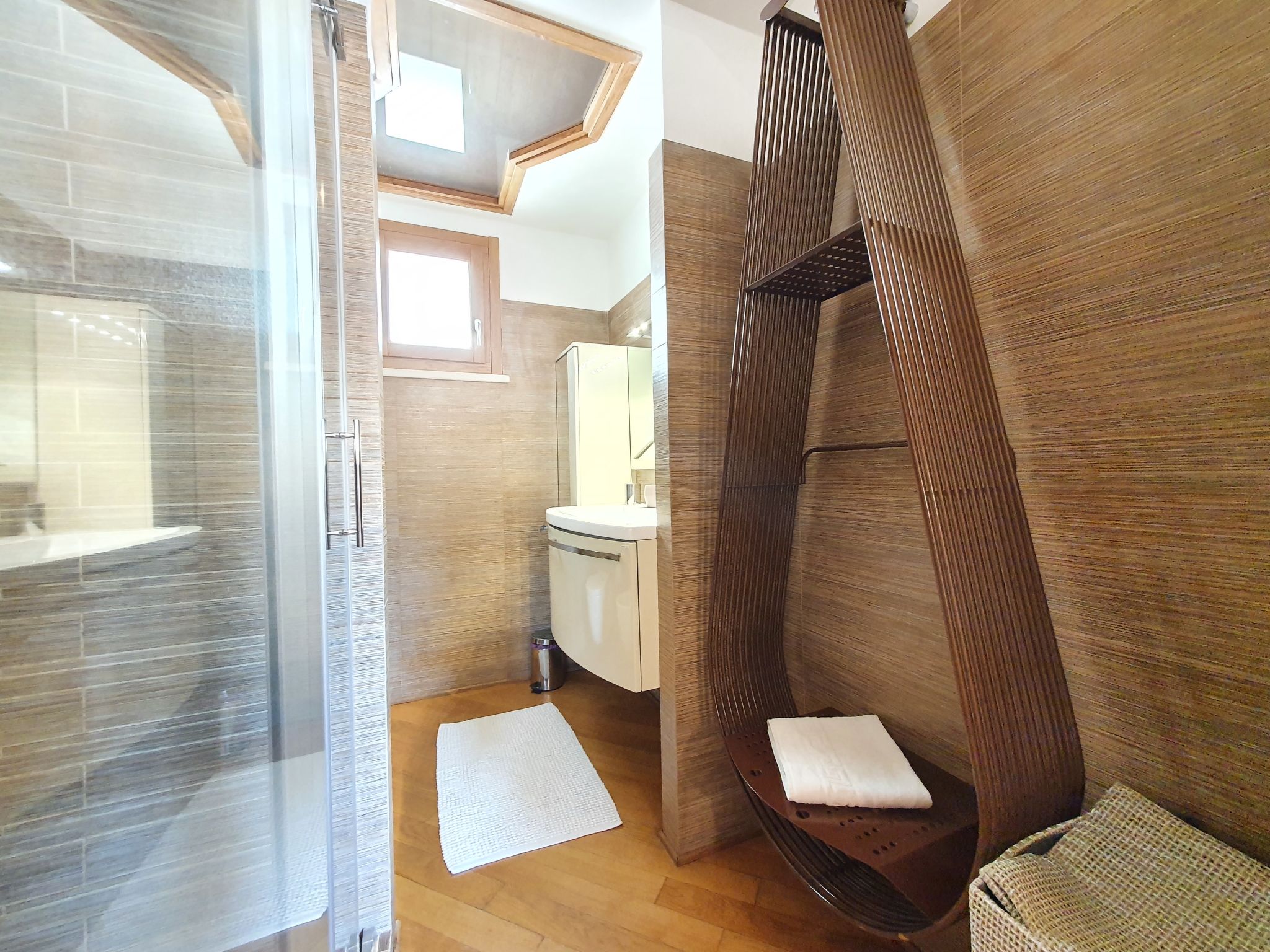 2-Zimmer-Wohnung 88 m2 im 2. Stock. Luxuriös und mit viel Holz eingerichtet: abgeschrägtes Wohn-/Esszimmer, Deckenhöhe 300 - 360 cm mit 1 Doppeldiwanbett und Sat-TV (Flachbildschirm), Stereoanlage, DVD und Klimaanlage. 1 abgeschrägtes, offenes Doppelzimmer, Deckenhöhe 165 - 315 cm mit TV (Flachbildschirm), Klimaanlage. Küche (4 Kochplatten, Backofen, Geschirrspüler, Mikrowelle, Tiefkühler, elektrische Kaffeemaschine) mit Esstisch, TV (Flachbildschirm). Dusche/Bidet/WC. Heizung, Klimaanlage (extra). Heizung nur verfügbar von 01.12. bis 31.03. Parkettböden. Zur Verfügung: Waschmaschine, Wäschetrockner, Telefon, Bügeleisen, Kinderhochstuhl, Babybett bis 2 Jahre (extra), Haartrockner. Internet (Wireless LAN, gratis). Bitte beachten: Nichtraucher-Haus. Kein Fahrstuhl.
