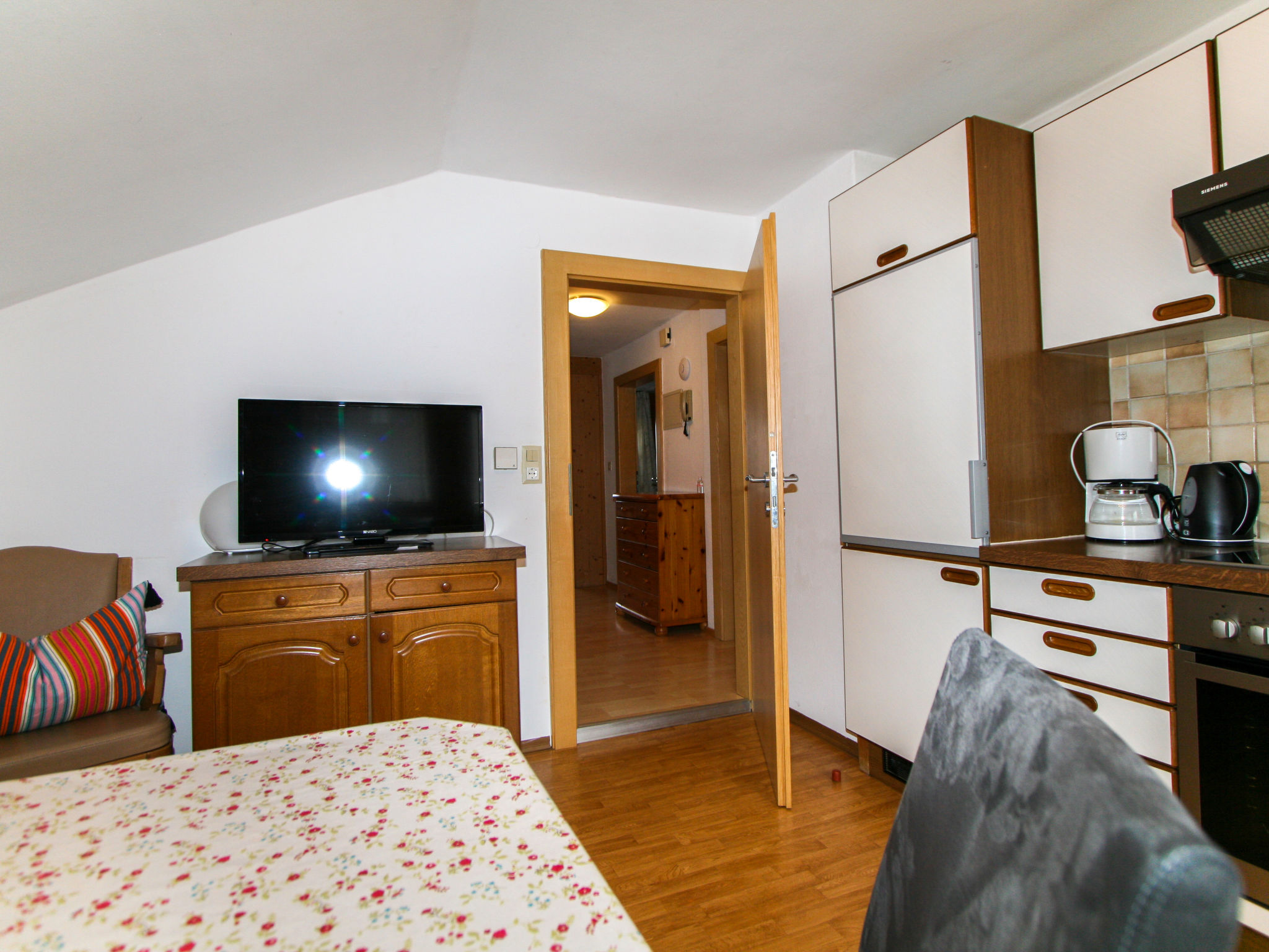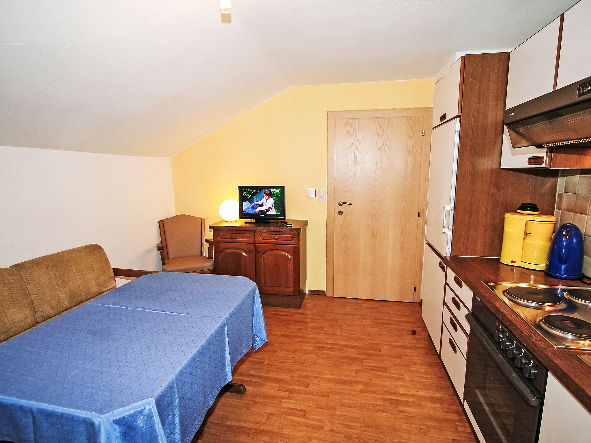 3-Zimmer-Wohnung 50 m2, im Dachgeschoss. Gemütlich eingerichtet: Eingang. 1 Doppelzimmer. Ausgang zum Balkon. 1 Doppelzimmer. Wohnküche (4 Kochplatten, Backofen, Geschirrspüler, Wasserkocher, Tiefkühler, elektrische Kaffeemaschine) mit Essecke und Sat-TV (Flachbildschirm). Ausgang zum Balkon. Dusche, sep. WC. 2 Balkone. Terrassenmöbel. Schöne Sicht auf die Berge und die Ortschaft. Zur Verfügung: Internet (Wireless LAN, extra). 1 Haustier/Hund erlaubt.