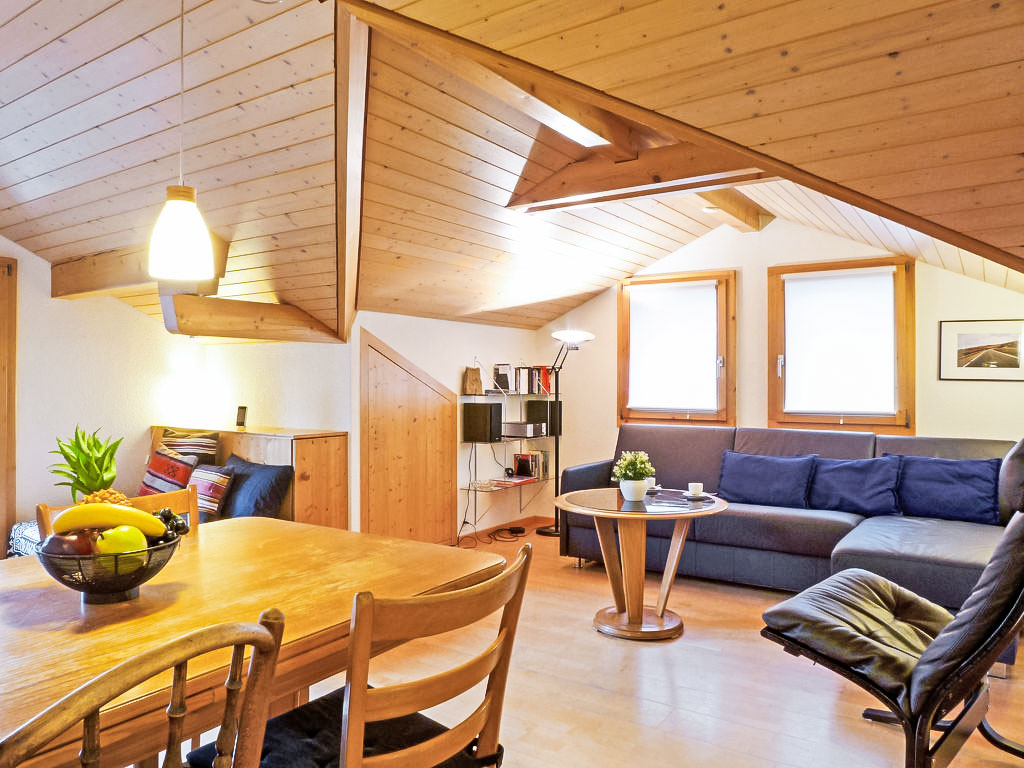 2-Zimmer-Wohnung 50 m2, im Dachgeschoss. Abgeschrägt, geschmackvoll und gemütlich eingerichtet: Wohn-/Esszimmer mit 1 Diwanbett (160 cm, Länge 200 cm), 1 Schlafmöglichkeit (1 x 90 cm, Länge 200 cm), Kabel-TV, Radio und CD. 1 Zimmer mit 1 franz. Bett (1 x 160 cm, Länge 200 cm). Kleine, offene Küche (Backofen, 4 Glaskeramikherd Platten, Toaster, Wasserkocher, elektrische Kaffeemaschine, Kapseln für die Kaffeemaschine (Nespresso) extra, Fondue Set (Käse)). Bad/Dusche/WC. 2 kleine Balkone. Balkonmöbel. Sehr schöne Sicht auf die Berge und das Tal. Zur Verfügung: Bügeleisen, Haartrockner. Internet (Wireless LAN, gratis). Bitte beachten: Nichtraucher-Unterkunft.