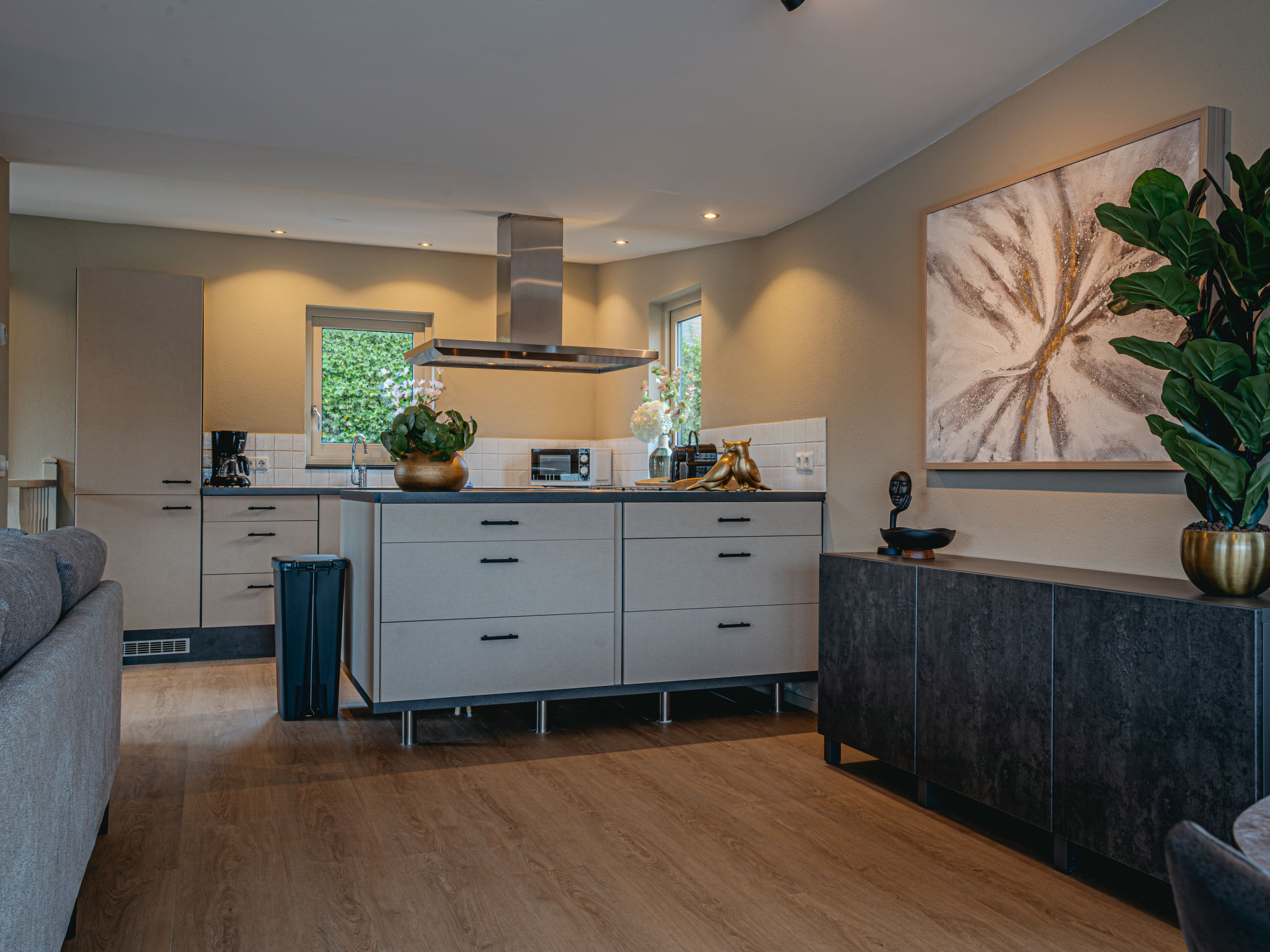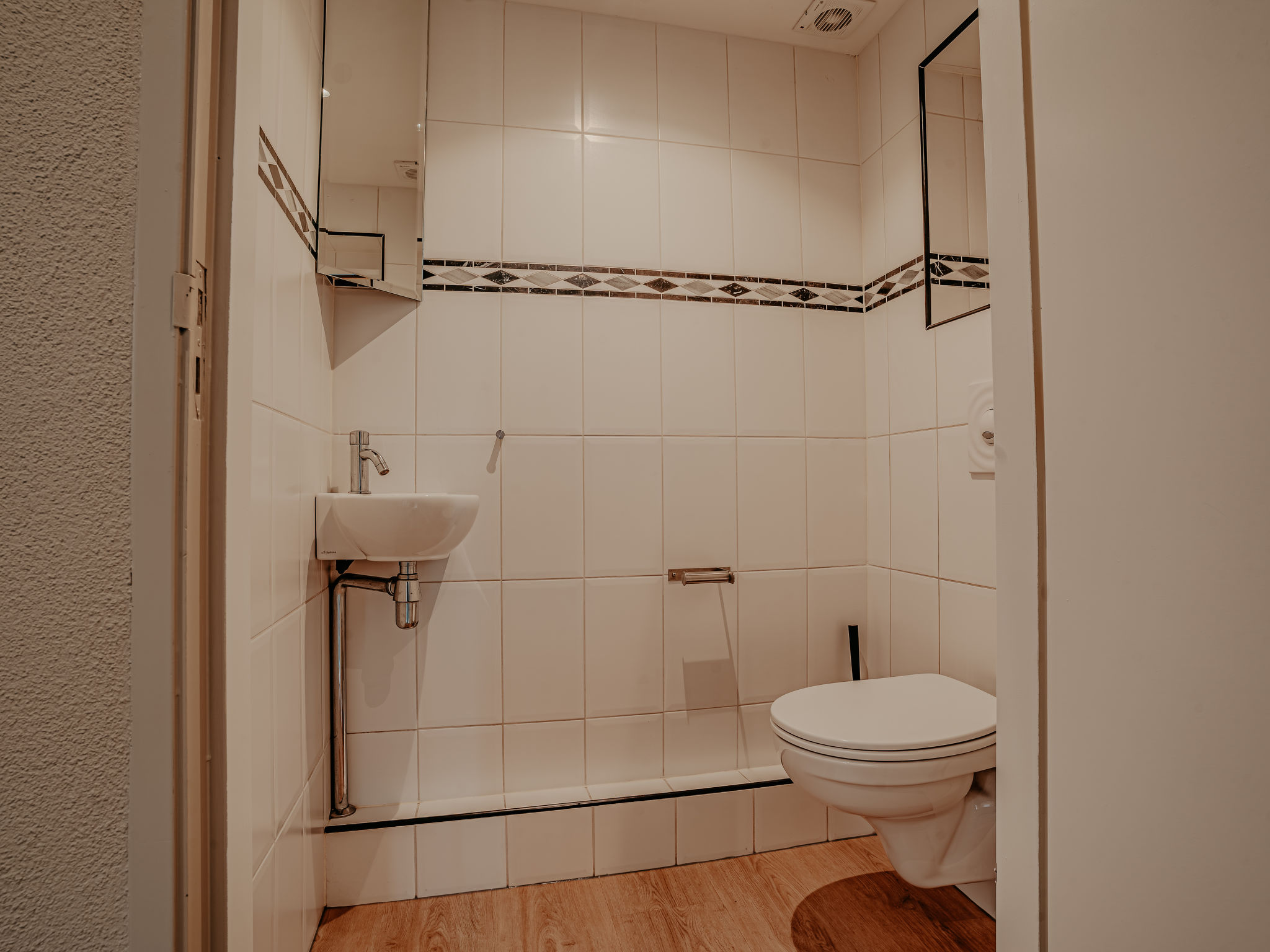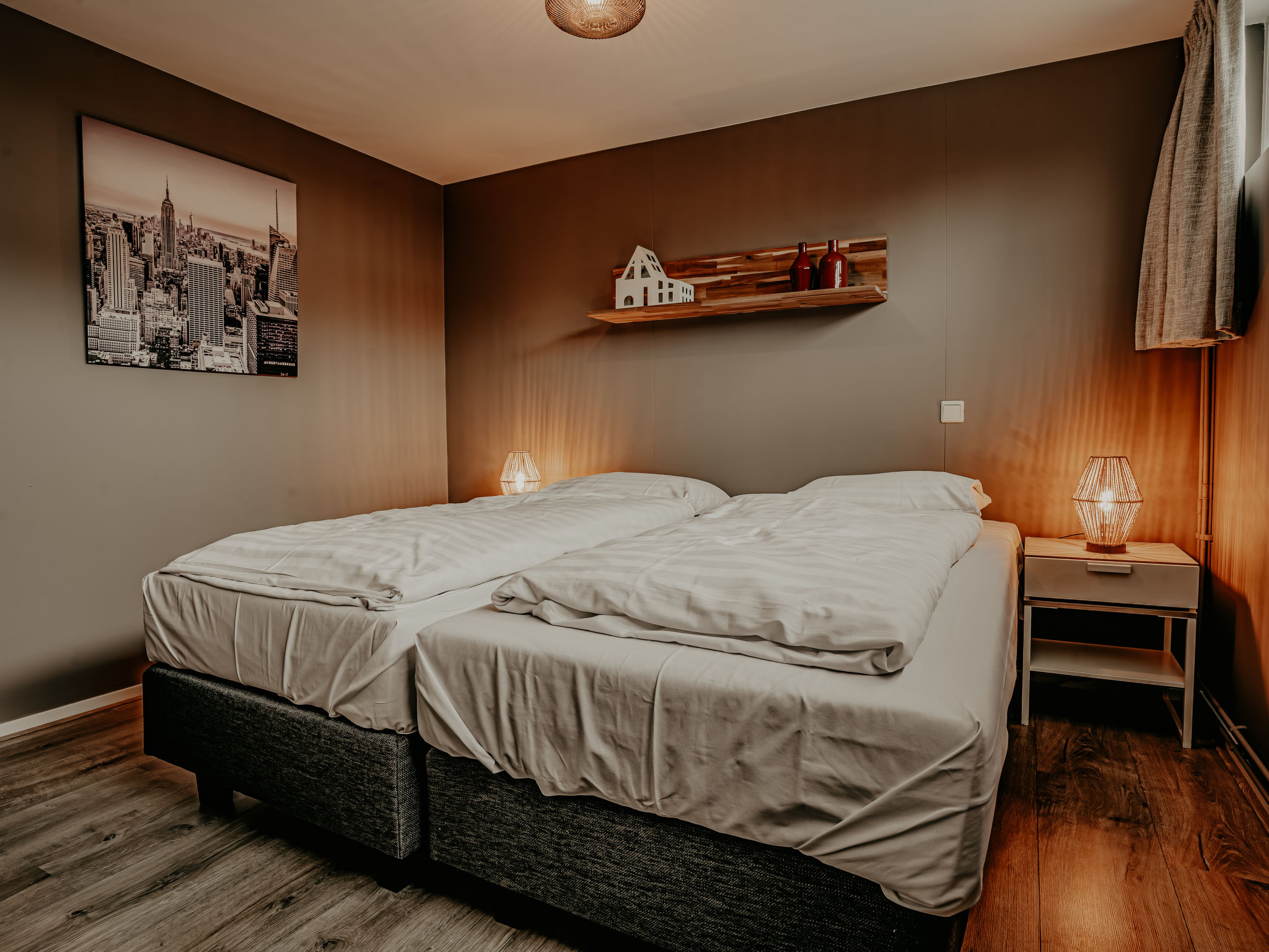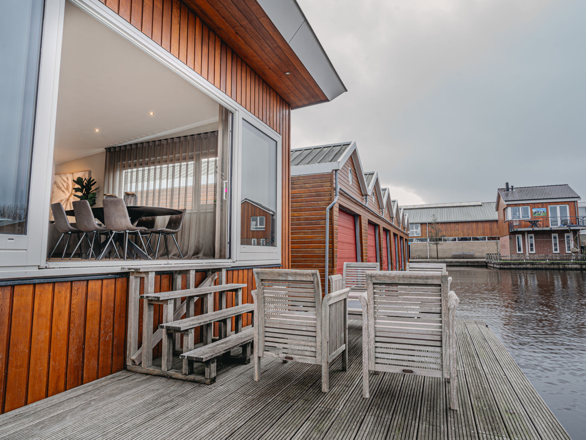 "De Woude", 4-Zimmer-Haus 110 m2 auf 2 Stockwerken. Zweckmässig eingerichtet: Eingang mit sep. WC. Offenes Wohn-/Esszimmer mit Esstisch, TV, Radio, CD und DVD. Grosse, offene Küche (4 Kochplatten, Geschirrspüler, Wasserkocher, elektrische Kaffeemaschine, Kombinationsmikrowelle). Unteres Geschoss: 3 Zimmer, jedes Zimmer mit 2 Betten. Dusche/WC. 2 Terrassen. Terrassenmöbel. Zur Verfügung: Waschmaschine, Wäschetrockner. Internet (Wireless LAN, gratis). Bitte beachten: Nichtraucher-Haus. Maximal 2 Haustiere/Hunde erlaubt. Rauchmelder.