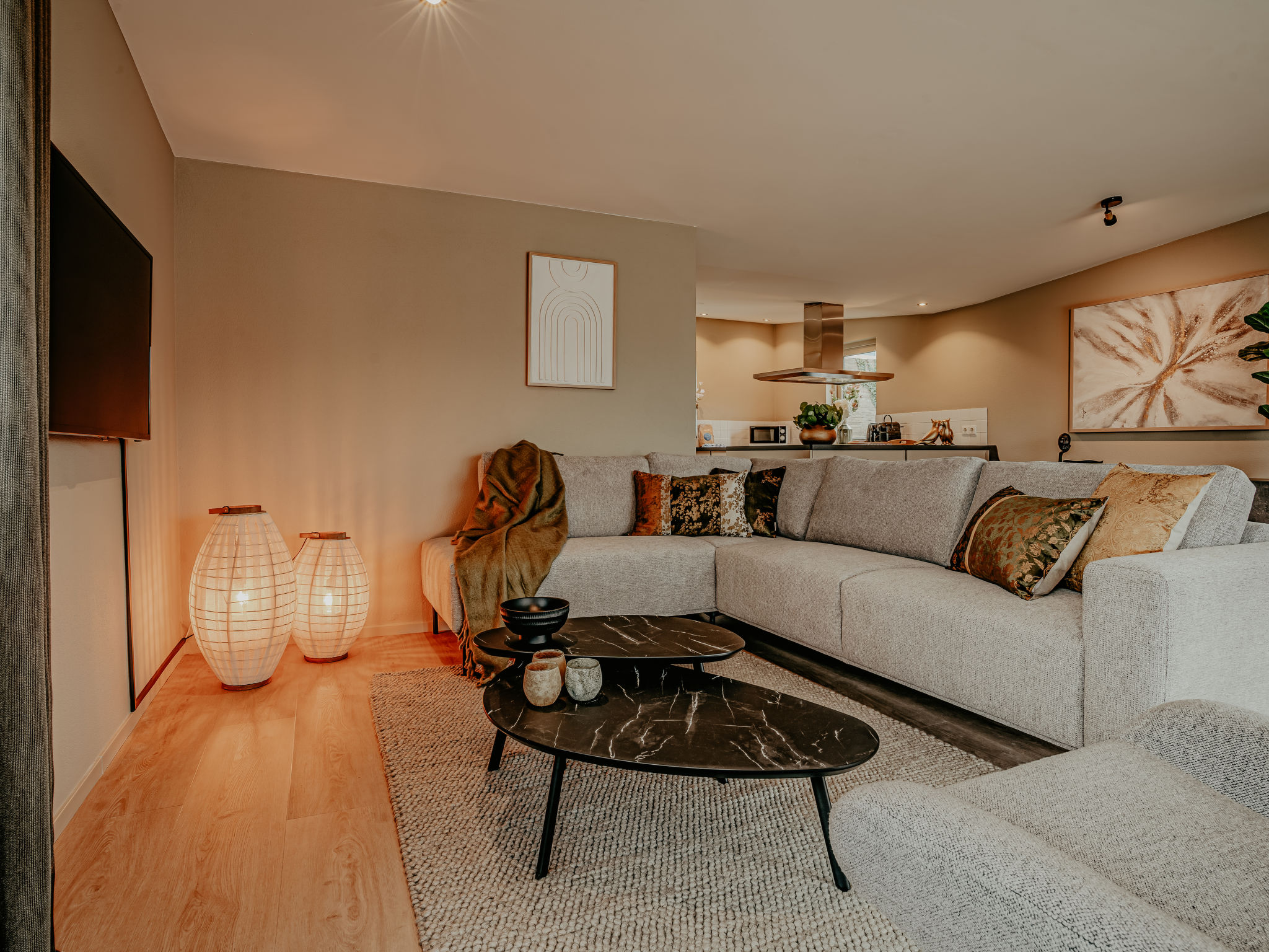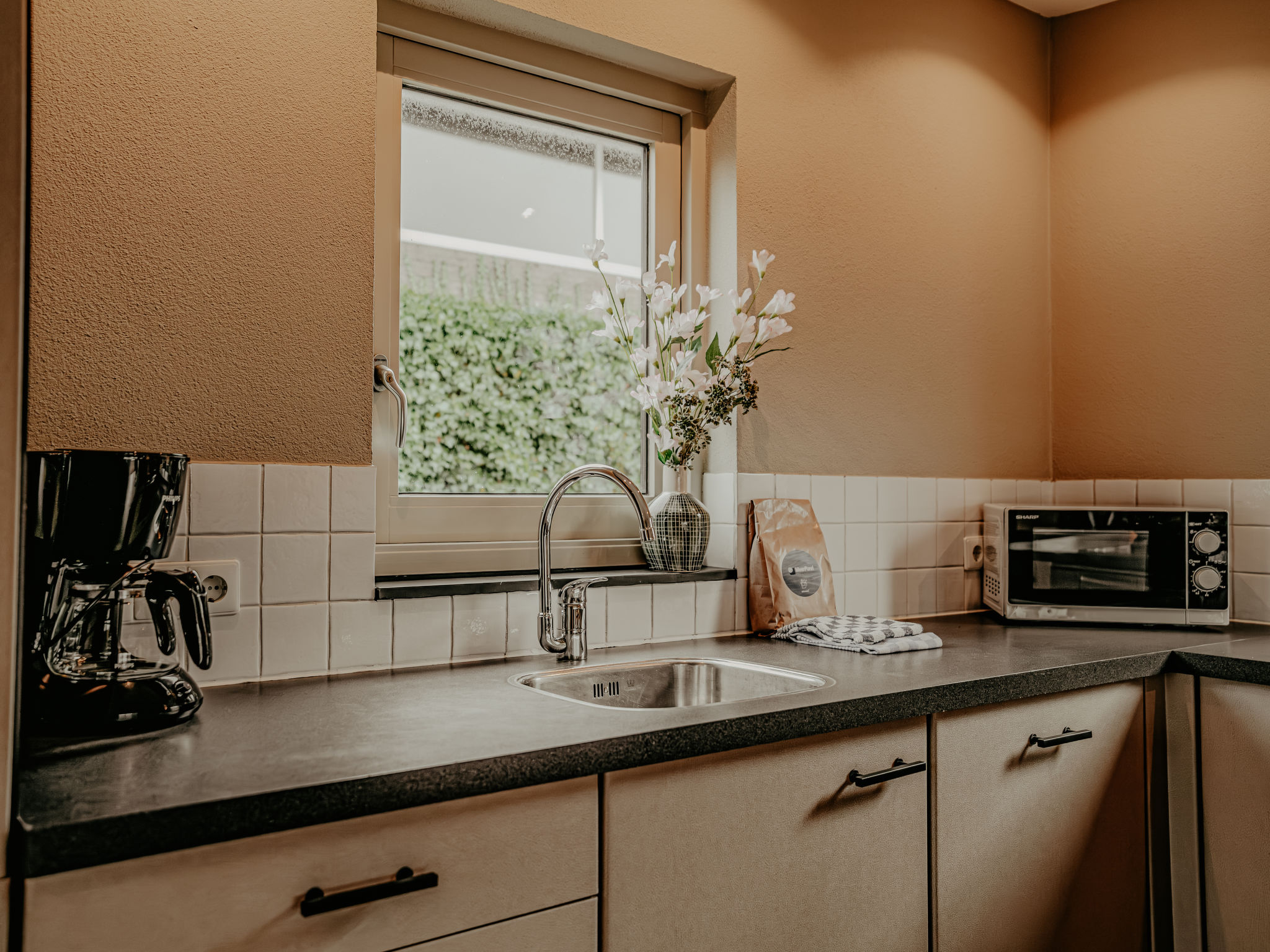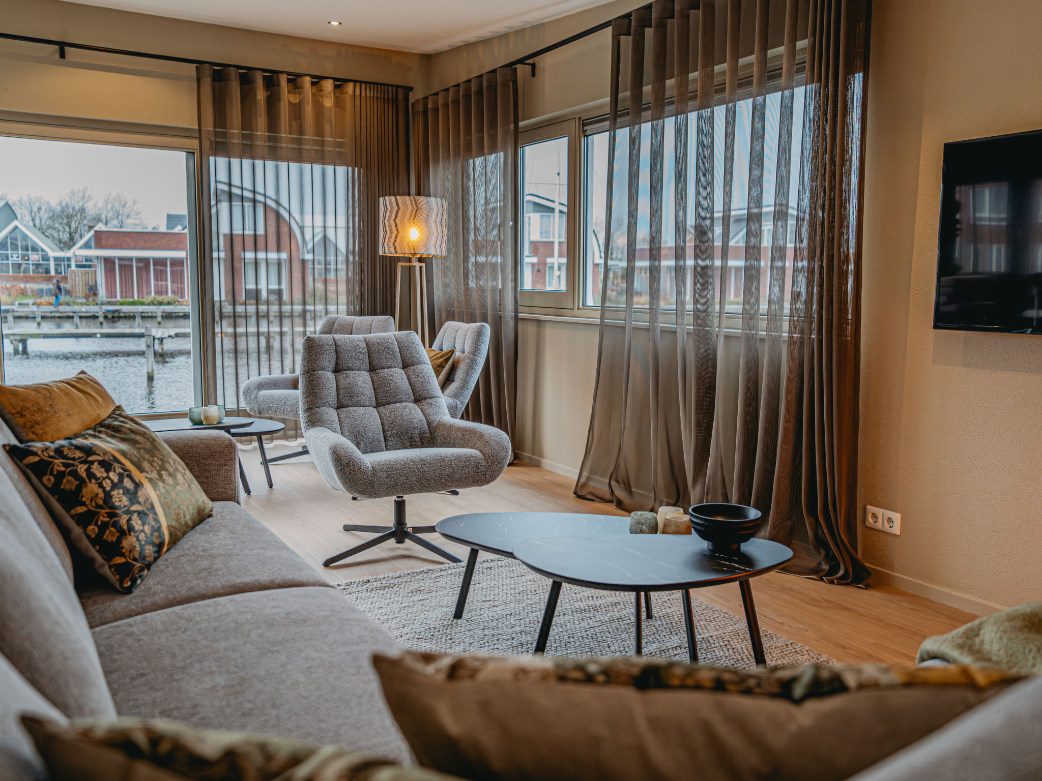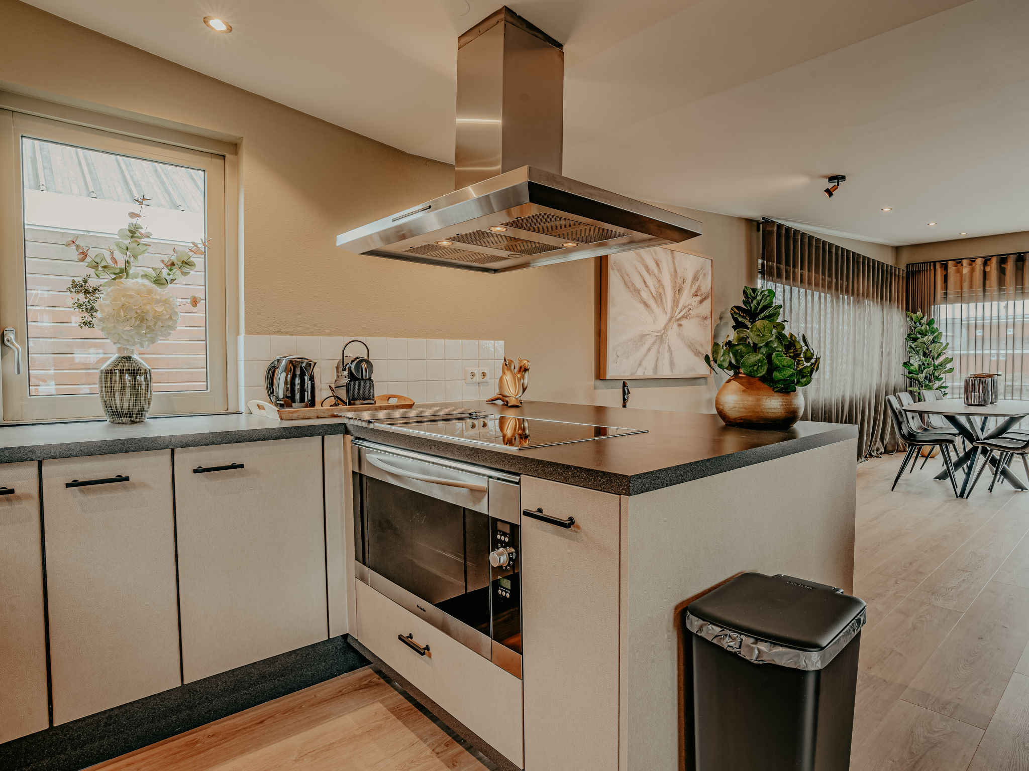 "De Woude", 4-Zimmer-Haus 110 m2 auf 2 Stockwerken. Zweckmässig eingerichtet: Eingang mit sep. WC. Offenes Wohn-/Esszimmer mit Esstisch, TV, Radio, CD und DVD. Grosse, offene Küche (4 Kochplatten, Geschirrspüler, Wasserkocher, elektrische Kaffeemaschine, Kombinationsmikrowelle). Unteres Geschoss: 3 Zimmer, jedes Zimmer mit 2 Betten. Dusche/WC. 2 Terrassen. Terrassenmöbel. Zur Verfügung: Waschmaschine, Wäschetrockner. Internet (Wireless LAN, gratis). Bitte beachten: Nichtraucher-Haus. Maximal 2 Haustiere/Hunde erlaubt. Rauchmelder.