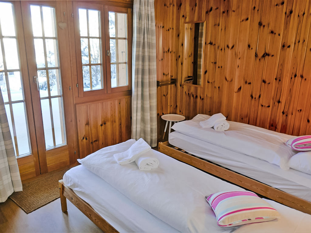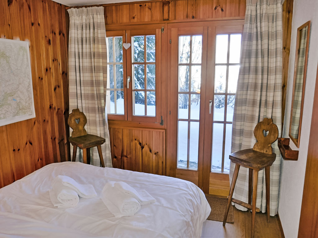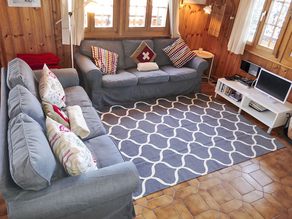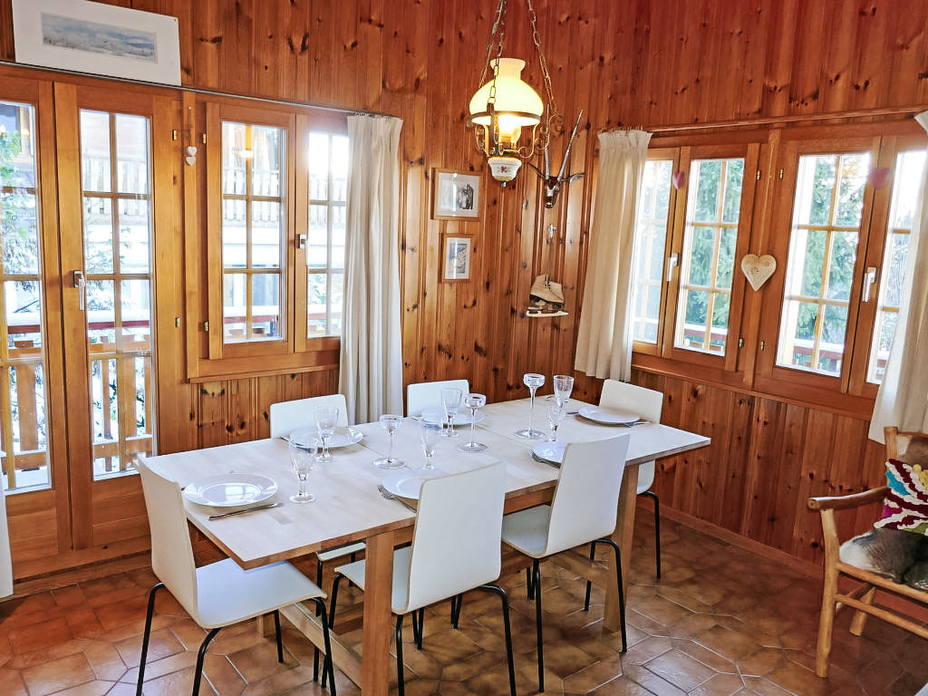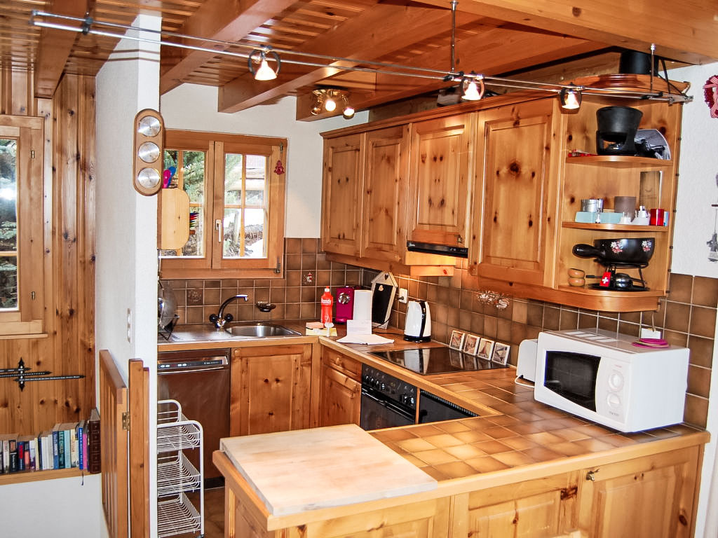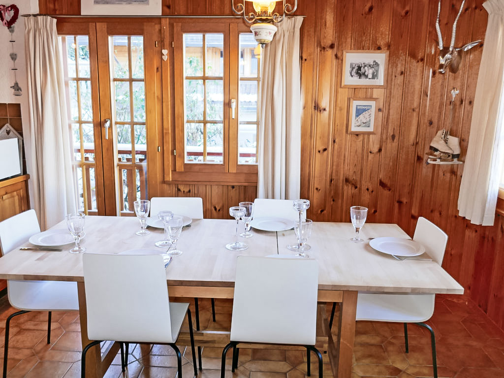 "Les Muguets", 4-Zimmer-Chalet 110 m2 auf 2 Stockwerken. Komfortabel eingerichtet: Wohn-/Esszimmer mit Kabel-TV, CD und DVD. Ausgang zum Balkon. Offene Küche (4 Kochplatten, Backofen, Geschirrspüler, 4 Glaskeramikherd Platten, Mikrowelle, elektrische Kaffeemaschine, Kapseln für die Kaffeemaschine (Nespresso) extra, Racletteofen, Fondue Set (Chinoise, Käse)). Sep. WC. Ölheizung. Unteres Geschoss: 1 Zimmer mit 1 franz. Bett (160 cm, Länge 200 cm). Ausgang zum Garten, Richtung Norden. 1 Zimmer mit 2 Betten. Ausgang zum Garten, Richtung Norden. 1 kleines Zimmer mit 2 Betten. Bad/WC. Balkon 10 m2, Nordlage und Westlage, Gartensitzplatz, Südlage, Rasen 15 m2. Terrassenmöbel, Gartengrill. Sicht auf die Berge und das Tal. Zur Verfügung: Waschmaschine, Kinderhochstuhl, Babybett. Internet (Wireless LAN, gratis). Garage, Höhe 200 cm, Breite 240 cm. Bitte beachten: Nichtraucher-Unterkunft, Parkplatz nur für kleine Wagen.