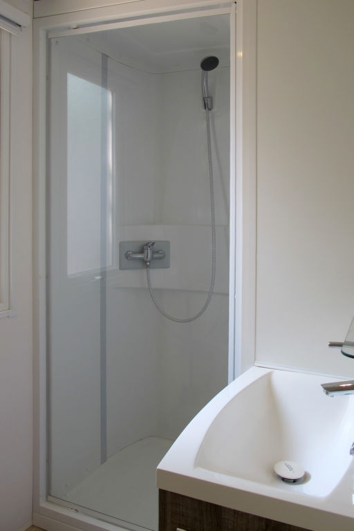 "Happy Premium", 4-Zimmer-Mobilheim 30 m2. Komfortabel eingerichtet: Wohn-/Schlafzimmer mit 1 Diwanbett, Esstisch, E-Heizung und Klimaanlage. 1 Zimmer mit 1 franz. Bett (140 cm). 2 Zimmer, jedes Zimmer mit 2 Betten (70 cm). Offene Küche (4 Kochplatten, Mikrowelle, Tiefkühler, elektrische Kaffeemaschine). Dusche/WC. Terrasse teilweise überdacht. Terrassenmöbel, Elektrogrill (mobil), Liegestühle (2). Zur Verfügung: Fliegengitter. Bitte beachten: Nichtraucher-Unterkunft.