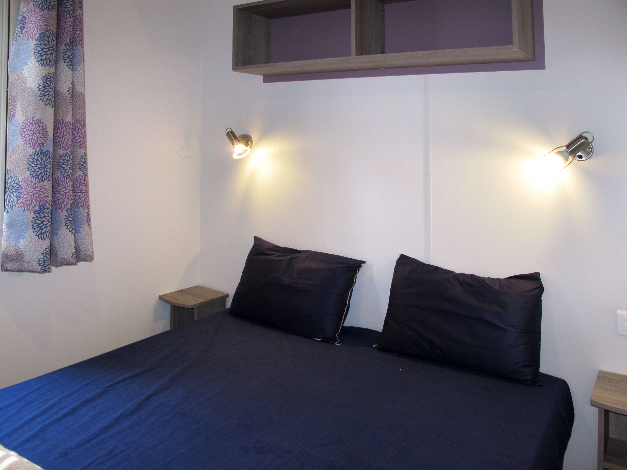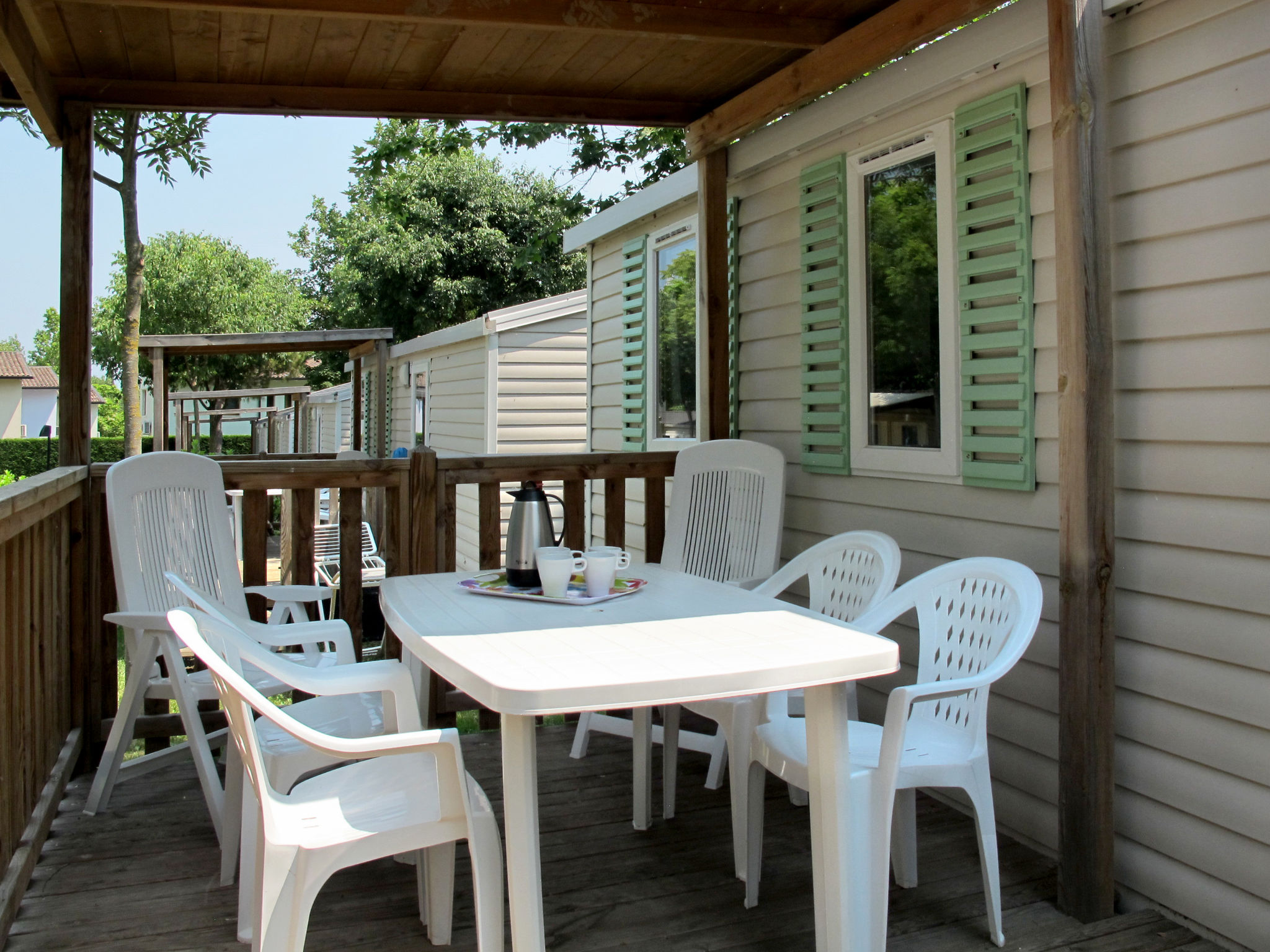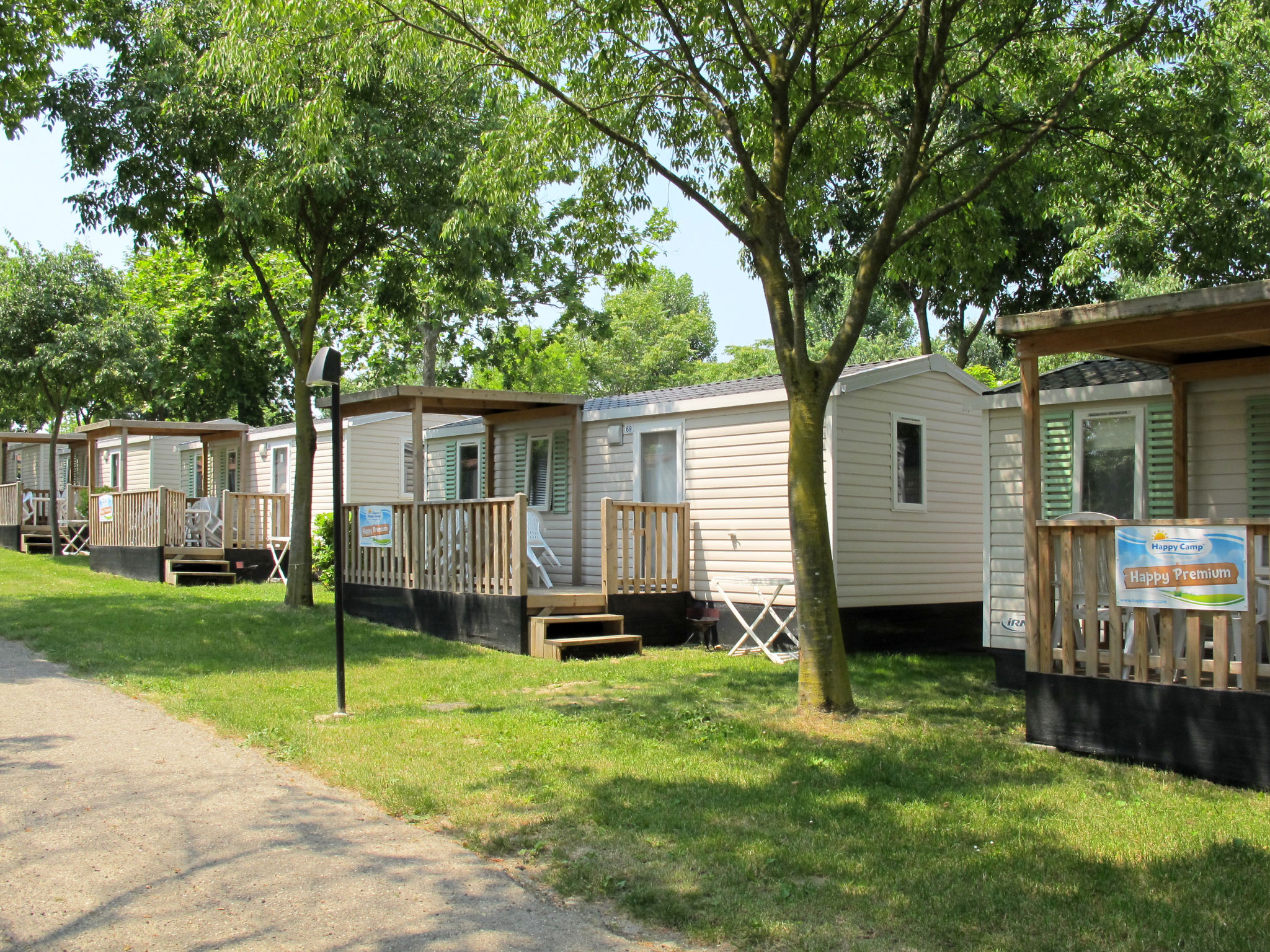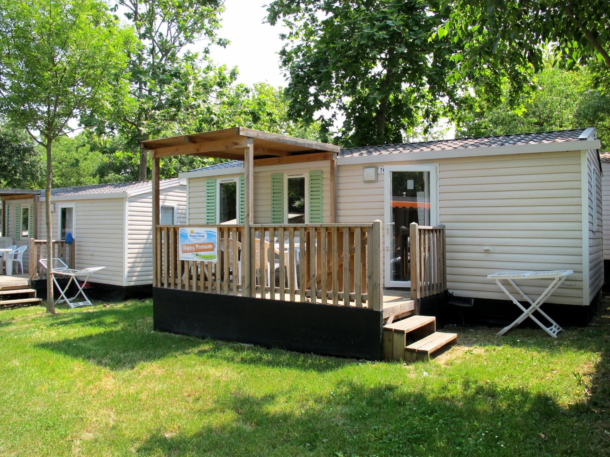 "Happy Premium", 4-Zimmer-Mobilheim 30 m2. Komfortabel eingerichtet: Wohn-/Schlafzimmer mit 1 Diwanbett, Esstisch, E-Heizung und Klimaanlage. 1 Zimmer mit 1 franz. Bett (140 cm). 2 Zimmer, jedes Zimmer mit 2 Betten (70 cm). Offene Küche (4 Kochplatten, Mikrowelle, Tiefkühler, elektrische Kaffeemaschine). Dusche/WC. Terrasse teilweise überdacht. Terrassenmöbel, Elektrogrill (mobil), Liegestühle (2). Zur Verfügung: Fliegengitter. Bitte beachten: Nichtraucher-Unterkunft.