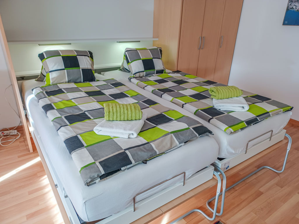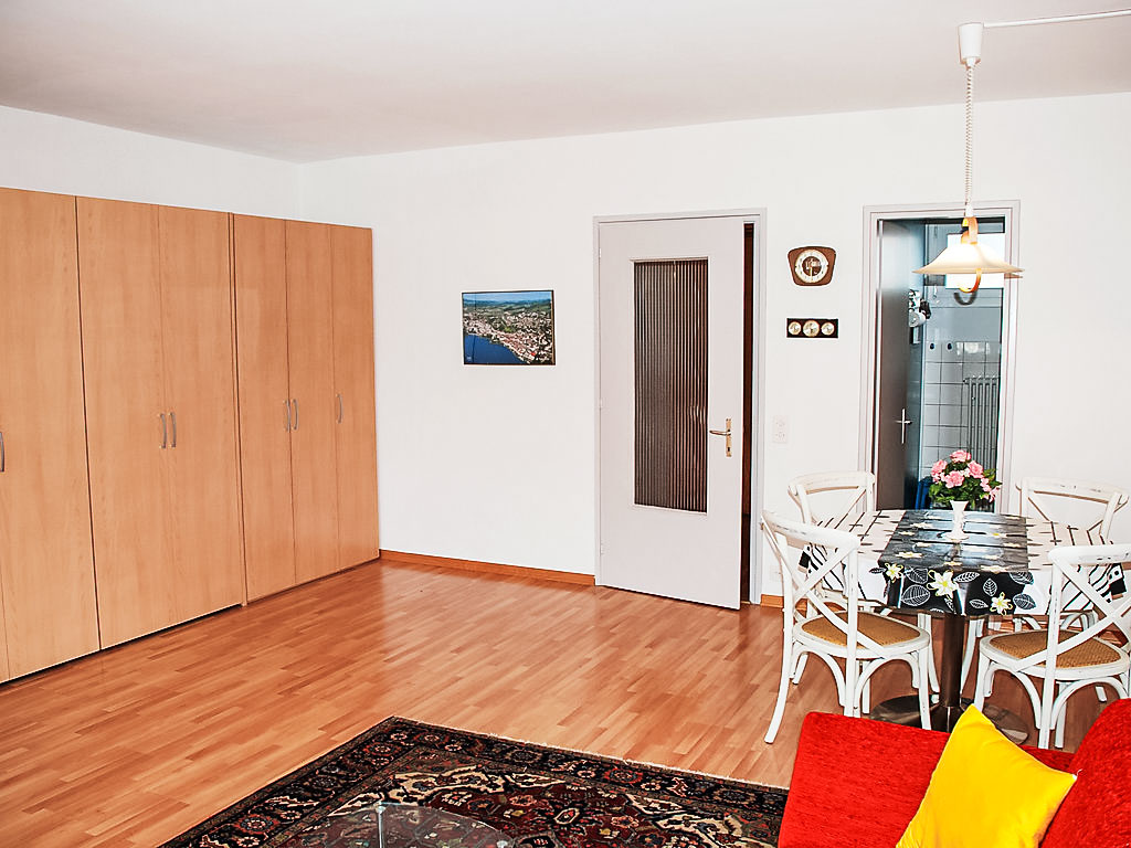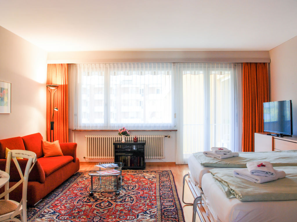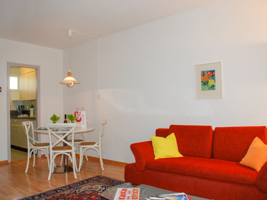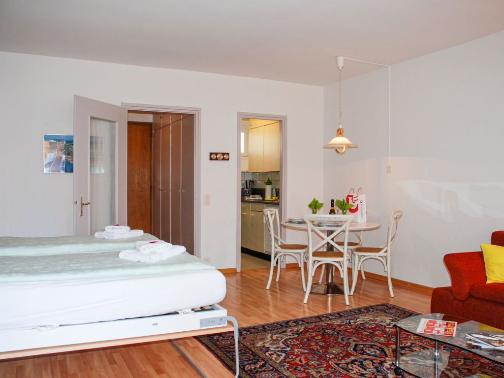 1-Zimmer-Wohnung 45 m2 im 4. Stock, Südwestlage. Geräumig und hell, komfortabel und modern eingerichtet: offenes Wohn-/Esszimmer mit 2 Wandschrankbetten (90 cm, Länge 200 cm), Esstisch, Kabel-TV, Flachbildschirm, Radio und CD. Ausgang zum Balkon. Kleine Küche (2 Glaskeramikherd Platten, elektrische Kaffeemaschine, Fondue Set (Käse)). Dusche/WC. Balkon, Westlage und Nordlage. Balkonmöbel. Seitliche Sicht auf den See, die Berge und die Landschaft. Zur Verfügung: Haartrockner. Internet (Wireless LAN). Bitte beachten: für Kleinkinder nicht geeignet nicht geeignet für Kinder unter 14 Jahren. Nichtraucher-Unterkunft.