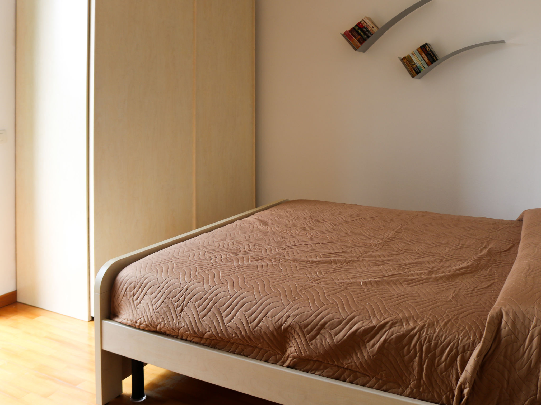 3-Zimmer-Wohnung, Obergeschoss, ca. 55 m². Separater Zugang über Außentreppe in Wohn-/Schlafraum mit Doppelbettcouch, Essplatz, Küchenzeile (4 Flammen, Kühl-/Gefrierkombination) und Balkonausgang. Schlafzimmer mit franz. Bett (1,60 m breit) und Ausgang auf weiteren Balkon. Schlafzimmer mit Etagenbett. Dusche/WC.