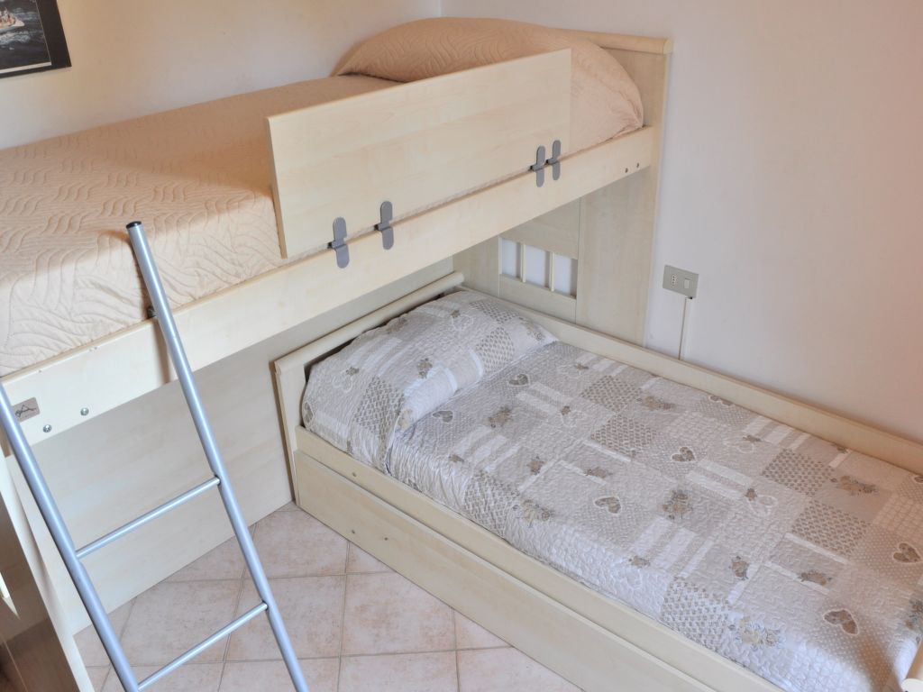 3-Zimmer-Wohnung, 1. Etage, ca. 55 m². Wohnraum mit Sitzcouch, Essplatz, Küchenzeile (4 Flammen, Kühlschrank), Balkonausgang (Seeblick). Doppelzimmer. Schlafzimmer mit Etagenbett und Ausziehbett. Dusche/WC. CIR:M0230430587