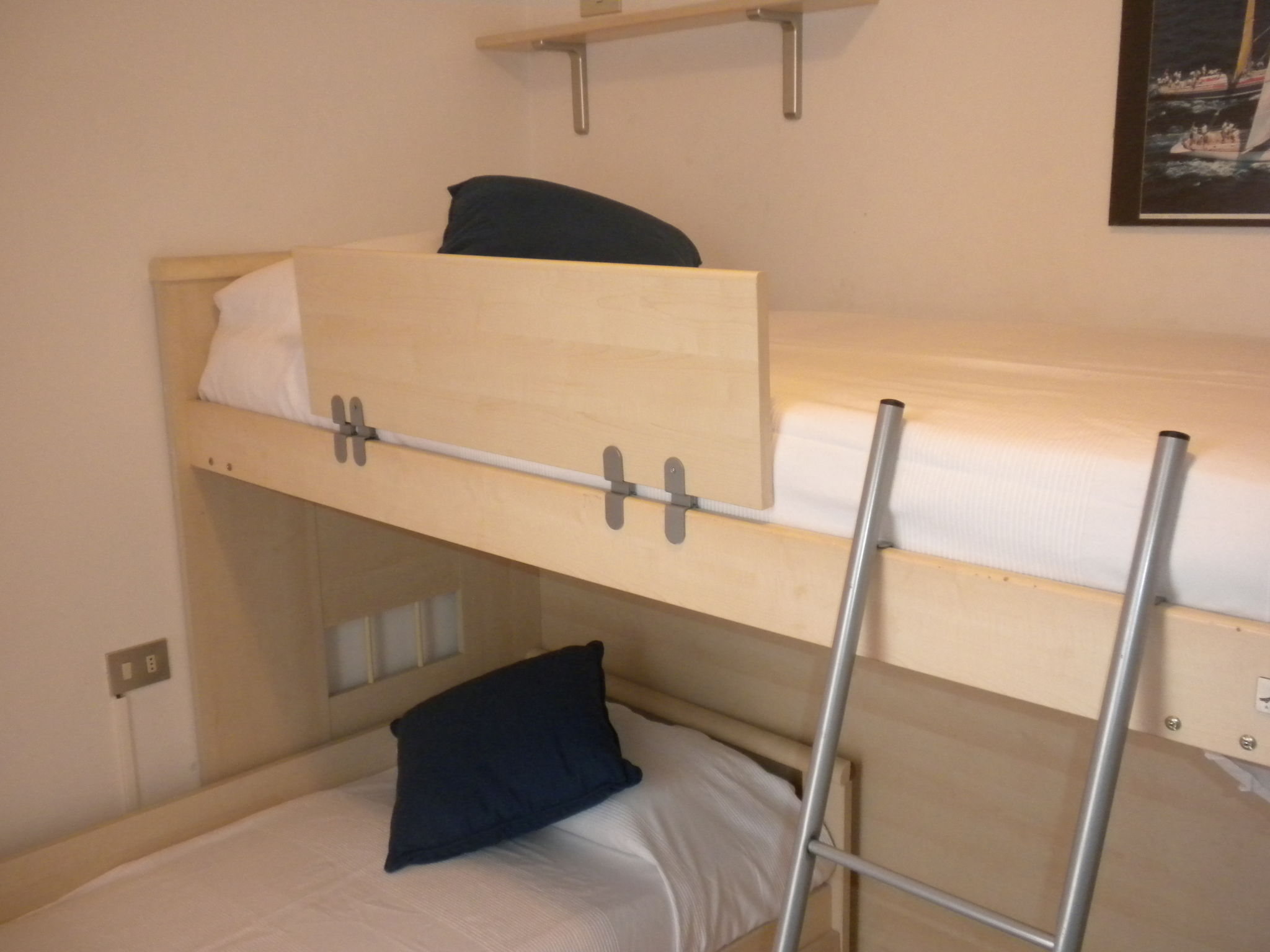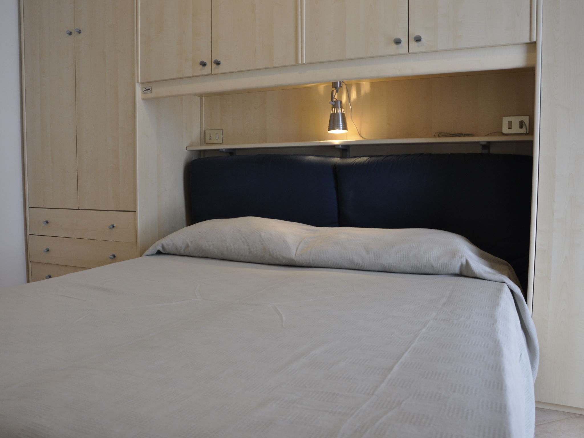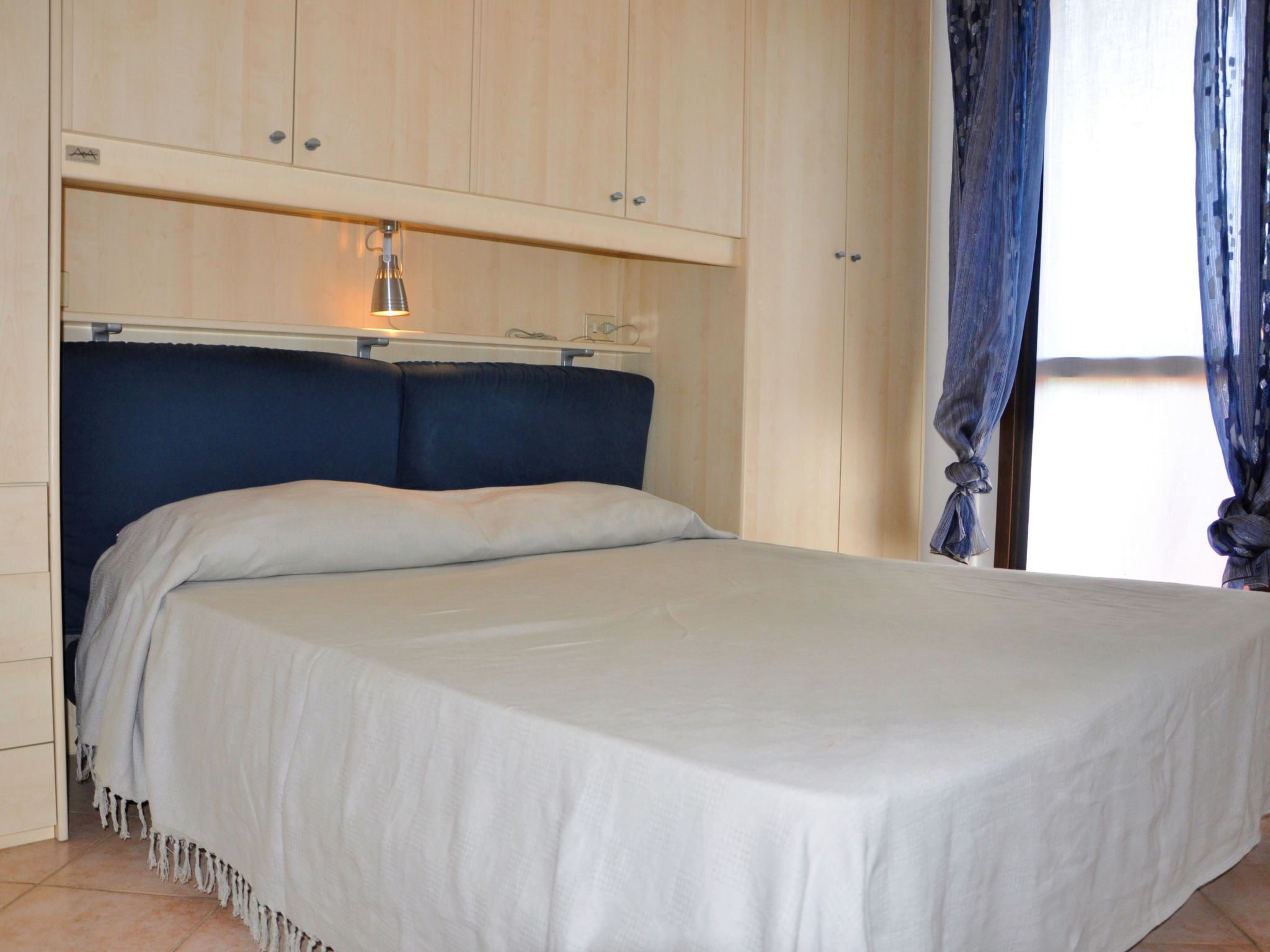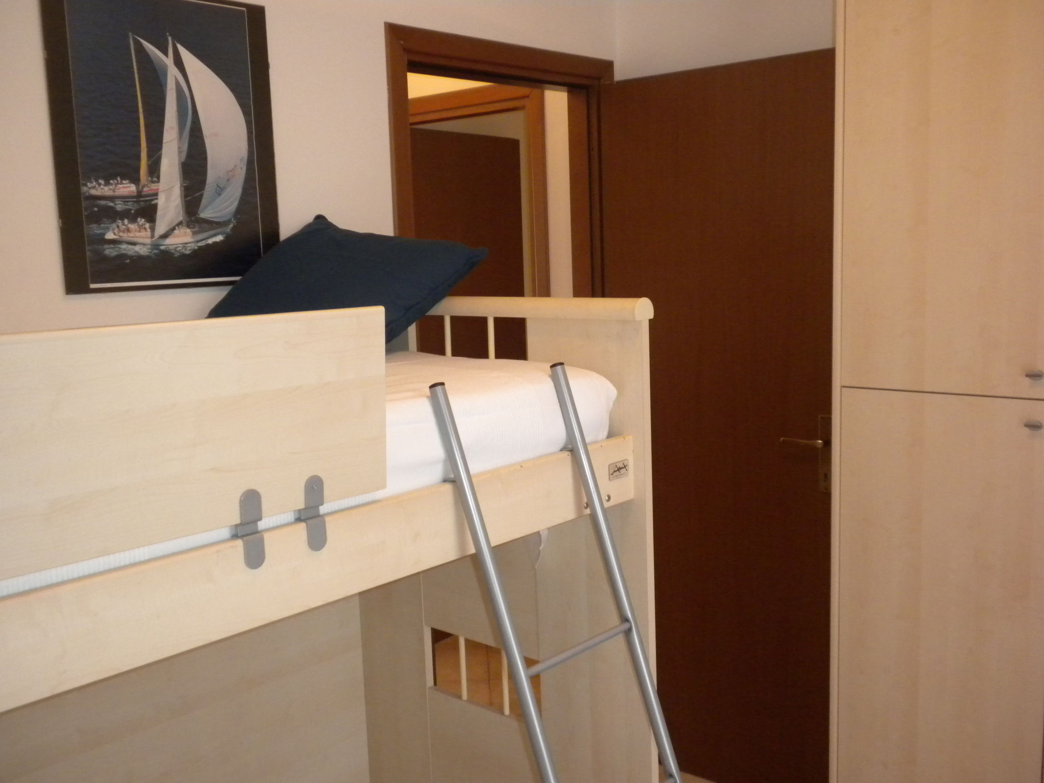 3-Zimmer-Wohnung, 1. Etage, ca. 55 m². Wohnraum mit Sitzcouch, Essplatz, Küchenzeile (4 Flammen, Kühlschrank), Balkonausgang (Seeblick). Doppelzimmer. Schlafzimmer mit Etagenbett und Ausziehbett. Dusche/WC. CIR:M0230430588