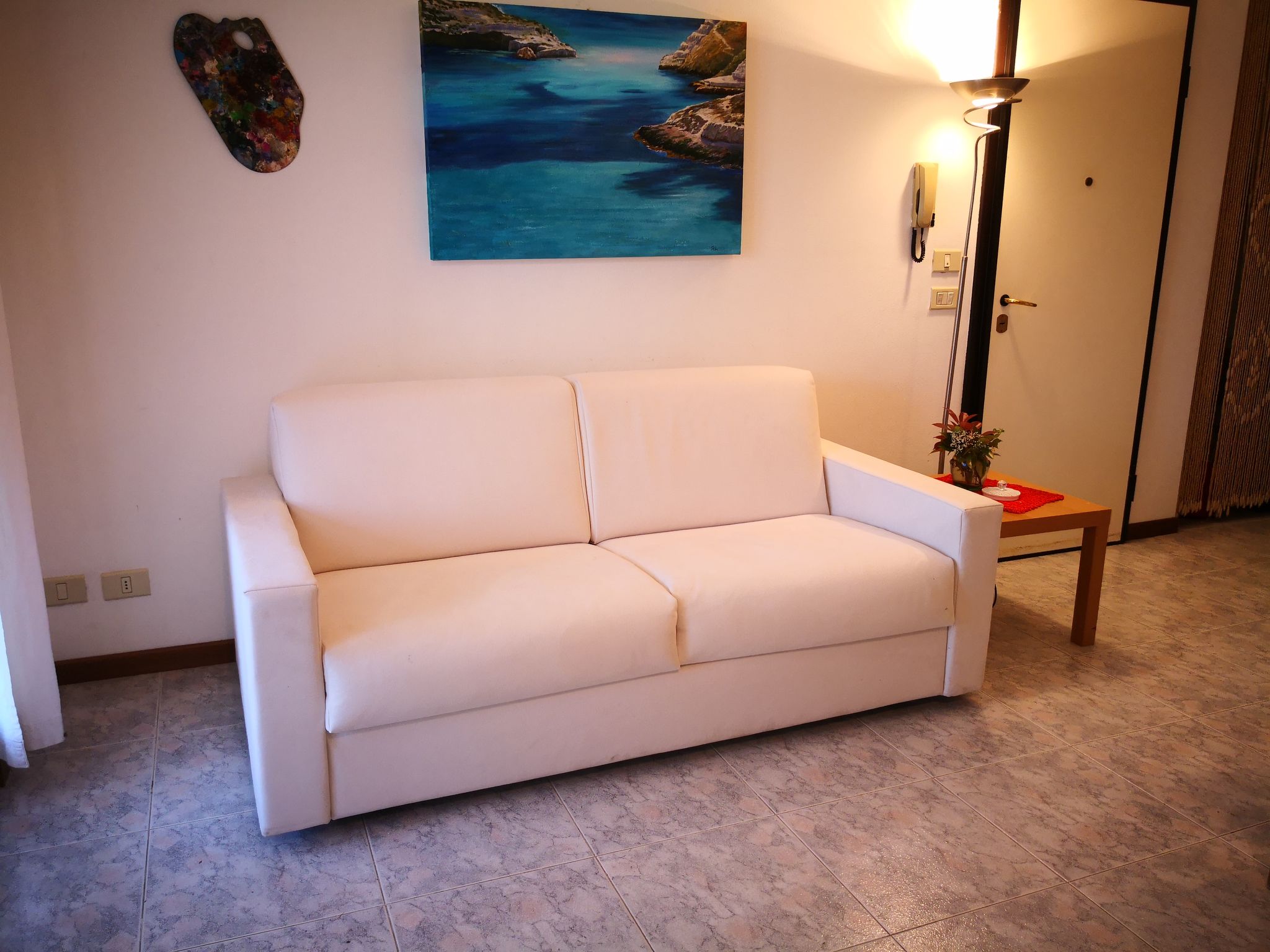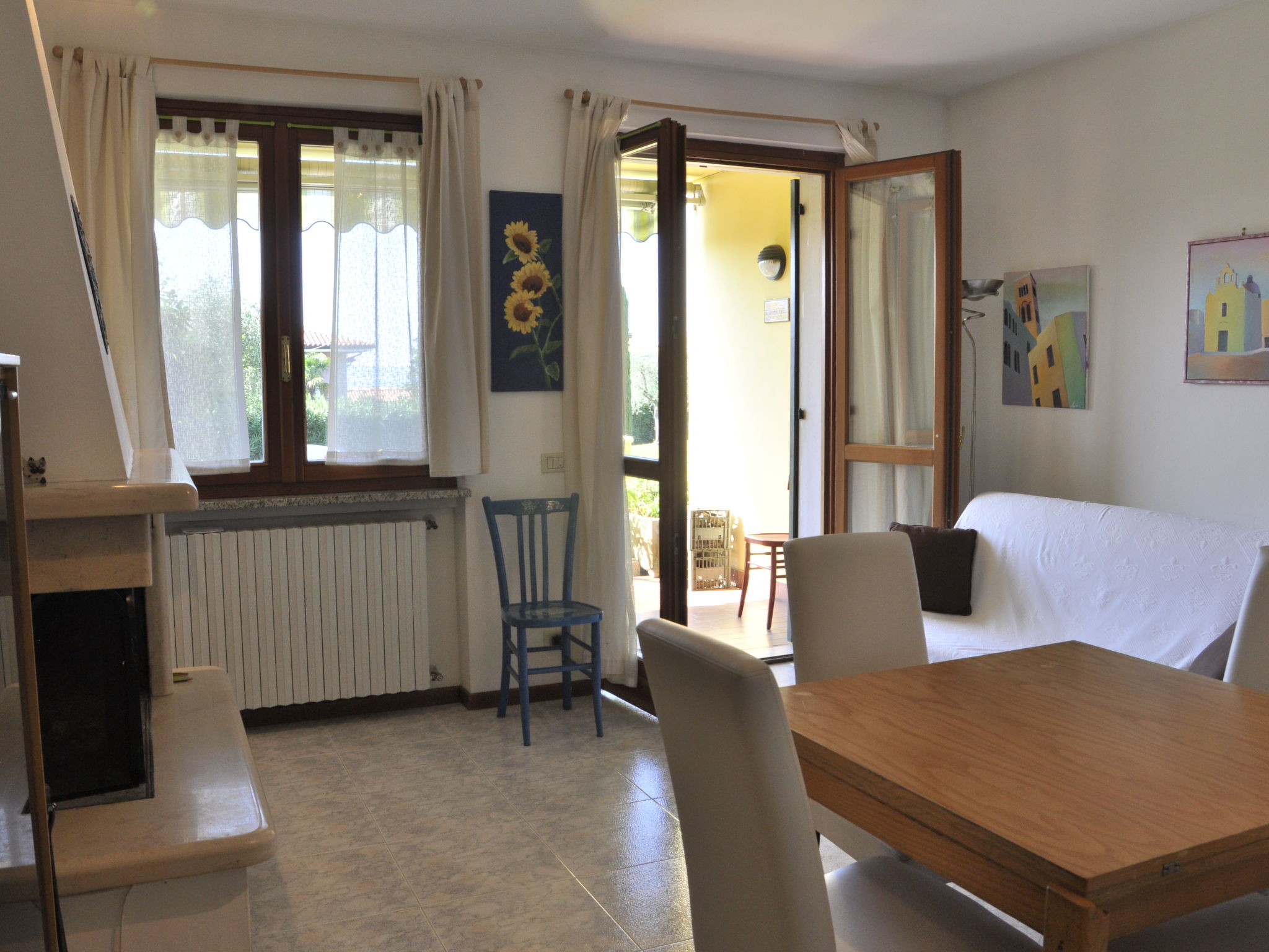 2-Zimmer-Wohnung, Erdgeschoss, ca. 50 m². Wohn-/Schlafraum mit Doppelbettcouch, Kamin (nur Dekoration), Essplatz, Küchenzeile (4 Flammen, Mikrowelle, Kühl-/Gefrierkombination), Terrassenausgang. Doppelzimmer. Dusche/WC. CIR:M0230430040