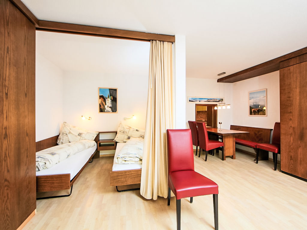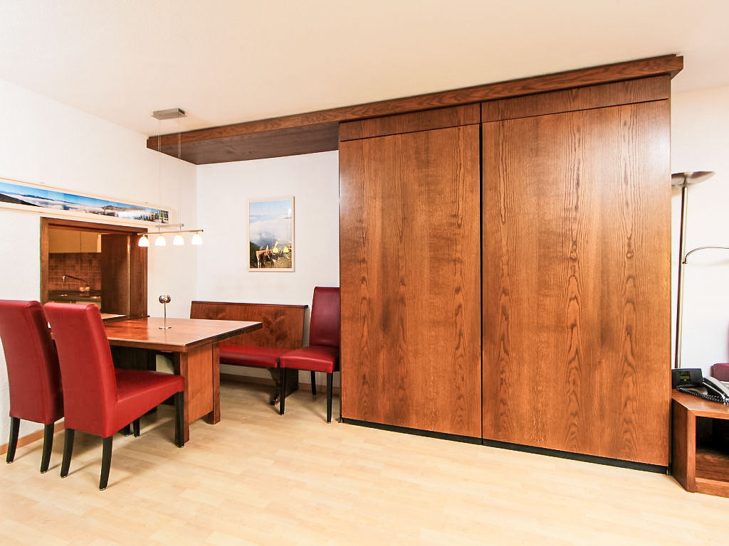 1-Zimmer-Wohnung 50 m2 im 2. Stock. Zweckmässig eingerichtet: Wohn-/Esszimmer mit 2 Wandschrankbetten, Kabel-TV und Radio. Schlafnische mit Vorhang mit 2 Betten. Küche (Backofen, elektrische Kaffeemaschine, Kapseln für die Kaffeemaschine (Nespresso) extra). Bad/WC. Balkon. Terrassenmöbel. Sicht auf die Berge und das Tal. Zur Verfügung: Telefon. Internet (Wireless LAN, gratis). Bitte beachten: Nichtraucher-Unterkunft.