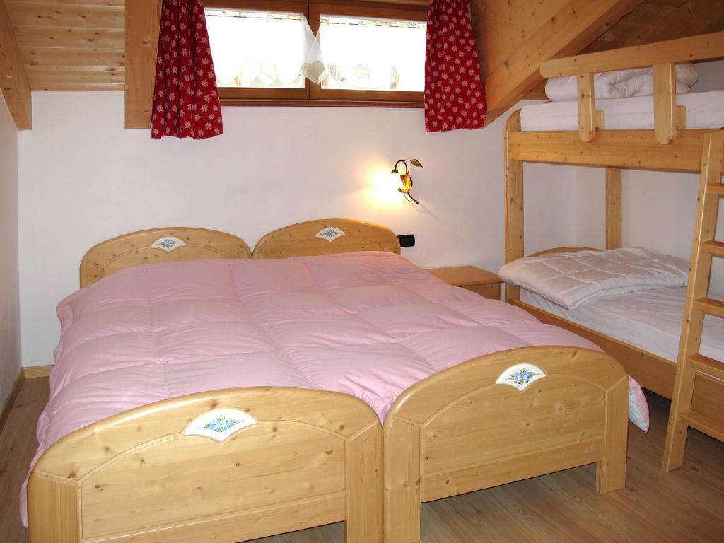 5-Zimmer-Wohnung, Dachgeschoss (Dachschräge, teils eingeschränkte Stehhöhe), ca. 130 m². Wohn-/Schlafraum mit Doppelbettcouch und Essplatz (Eckbank), offen zu kleiner Küche (4 Induktionsfelder, Backofen, Mikrowelle, Geschirrspüler, Kühl-/Gefrierkombination, Wasserkocher). Schlafzimmer mit franz. Bett (1,60 m breit), Einzelbett (0,80 m breit) und Balkonausgang. Schlafzimmer mit Doppelbett, Einzelbett (0,80 m breit) und Balkonausgang. Zweibettzimmer (Betten 0,80 m breit). Schlafzimmer mit 2 Einzelbetten (0,80 m breit) und Etagenbett (0,80 m breit). 2x Bad/Dusche/WC.