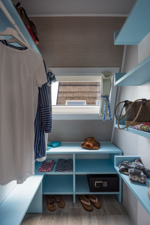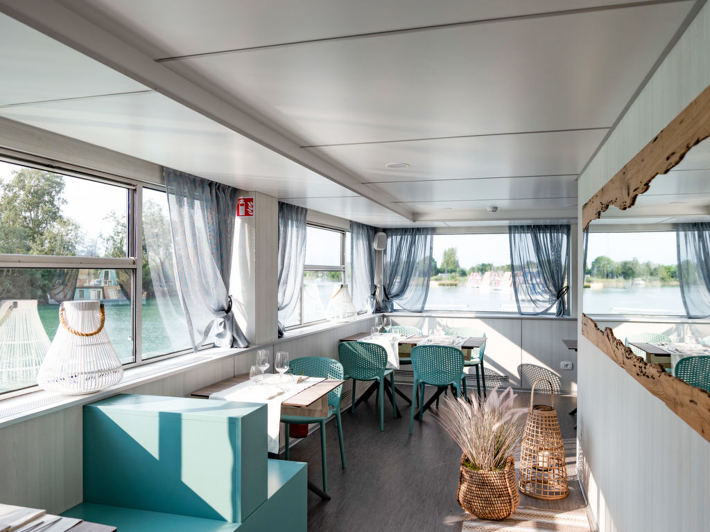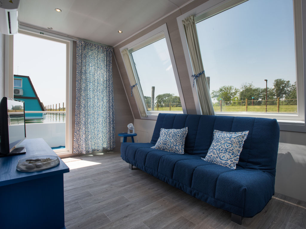 4-Zimmer-Hausboot 'Lagoon', 2 Etagen, ca. 65 m². Erdgeschoss: Wohn-/Schlafraum mit Doppelbettcouch, Terrassenausgang. Doppelzimmer mit begehbarem Kleiderschrank. Zweibettzimmer. Dusche/WC. Kleiner Abstellraum. Obergeschoss: Wohnraum mit Essplatz und Küchenzeile (2 Induktionsfelder, Kühlschrank, Kaffeemaschine), Terrassenausgang.
