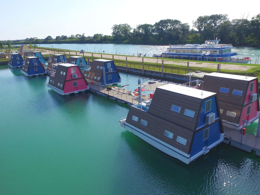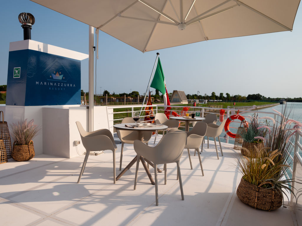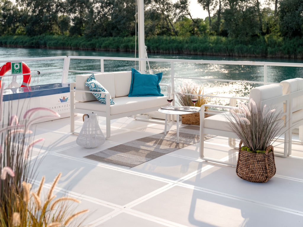 Das neue MARINA AZZURRA RESORT liegt 3 km außerhalb von Lignano-Riviera, auf einem ca. 12 ha großen, zur Landseite hin komplett abgeschlossenen Grundstück. Es umfasst 12 Hausboote an Land (LIG220), ein Hafenbecken mit 29 Hausbooten (LIG221) sowie weiteren 59 Hausbooten, die entlang des Flusses Tagliamento sicher verankert sind und durch Holzstege erreichbar sind (LIG222). Zum Strand von Lignano-Riviera 3,5 km (auch über Radweg erreichbar). Nächste Einkaufsmöglichkeiten in Lignano (5 km, in der Hauptsaison auch in Lignano-Riviera, 3,5 km) und Bibione (6 km). In der Anlage: Poollandschaft (ca. 450 m² Gesamtfläche, gesamte Saison geöffnet) mit Pool, Kinderbecken und Wellness-Bereich mit Sprudelbad und Wasserliegen, Bocciabahn, Beachvolleyfeld, Multifunktionsfeld, Kinderspielplatz. Clubhaus-Schiff mit Restaurant (geöffnet ca. 04.06.2022-10.09.2022, auf Wunsch und Bezahlung am Ort, Frühstück und Abendessen, für Kinder Ermäßigung), Take-Away-Service und Lounge-Bar auf dem offenen Oberdeck. An Land schöne Grünfläche mit 3 großen Außengrills und überdachten Sitzplätzen zur gemeinsamen Nutzung auf Anfrage und gegen Bezahlung (€ 25 inkl. Grill-Kit). Münz-Waschmaschinen und -Trockner. Parkmöglichkeit auf großem Parkplatz vor der Anlage. Fahrradverleih (€ 16 pro Woche/Rad). E-Bike-Verleih bei unserer Partner-Agentur (€ 25/Tag, Kaution € 50/Rad). Jedes Hausboot hat 2 Etagen und 2 Terrassen, davon die obere mit Mobiliar und Sonnensegel. Neue, ansprechende Einrichtung. Vinylboden. Fliegengitter. Gute Ausstattung mit Sat-TV (deutsche Programme), Internetzugang (WLAN, inklusive), Klimaanlage mit Kühl-/Heizfunktion. Zwischenreinigung jeden 2. Tag inklusive. Strandservice: Von ca. Anfang Mai bis ca. Mitte September sind jeweils 2 Sonnenliegen und 1 Sonnenschirm pro Wohnung im Mietpreis enthalten. Weinprobe: Von ca. April bis Oktober pro Hausboot 1 Weinprobe in Bibione inklusive. Hinweis: Aus Sicherheitsgründen können Kinder unter 2 Jahren im Resort nicht beherbergt werden.