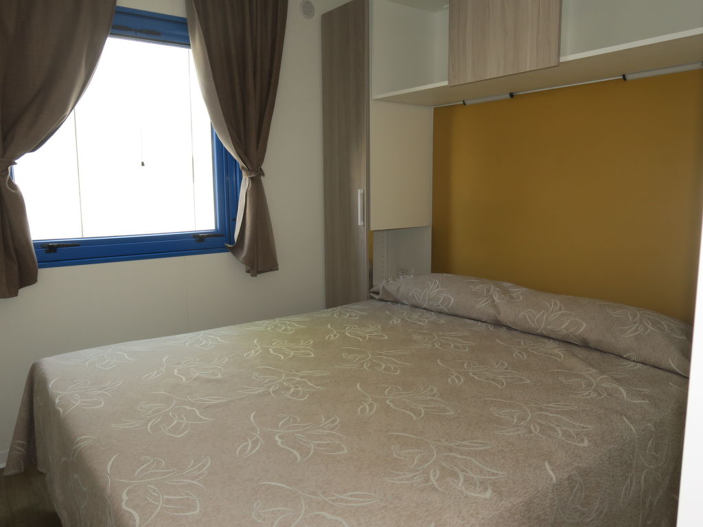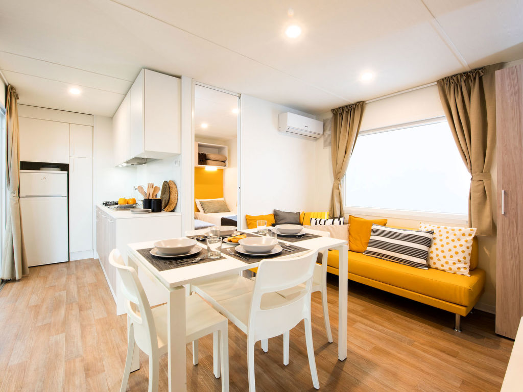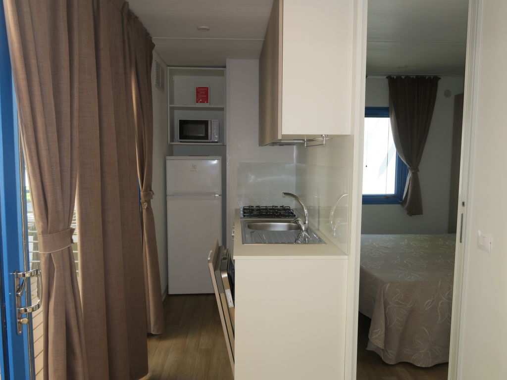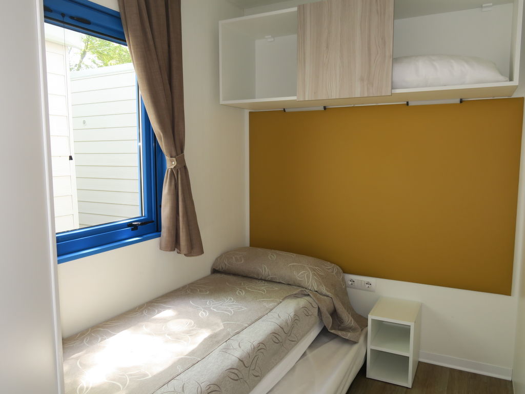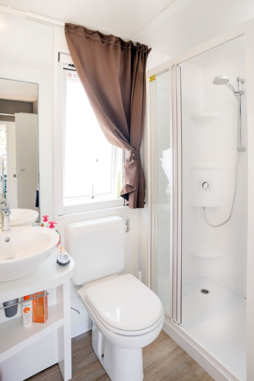 4-Zimmer-Mobilhome, ca. 34 m². Zugang über 3 Stufen und Terrasse. Wohn-/Schlafraum mit Bettcouch (als Zusatzbett gegen Bezahlung, siehe Nebenkosten), Essplatz und Küchenzeile (4 Flammen, Mikrowelle, Geschirrspüler, Kühl-/Gefrierkombination, Kaffeemaschine). Schlafzimmer mit franz. Bett (1,60 m breit) und Dusche/WC. Zweibettzimmer (Betten jeweils 0,75 m breit). Schlafzimmer mit Einzelbett (0,75 m breit) und Ausziehbett (0,70 m breit). Dusche/WC. Maximale Belegung: 6 Personen. Flexibilität bei der Bettenaufteilung: Es stehen mehr Schlafmöglichkeiten zur Verfügung als die maximal zugelassene Personenzahl, diese darf dennoch nicht überschritten werden.