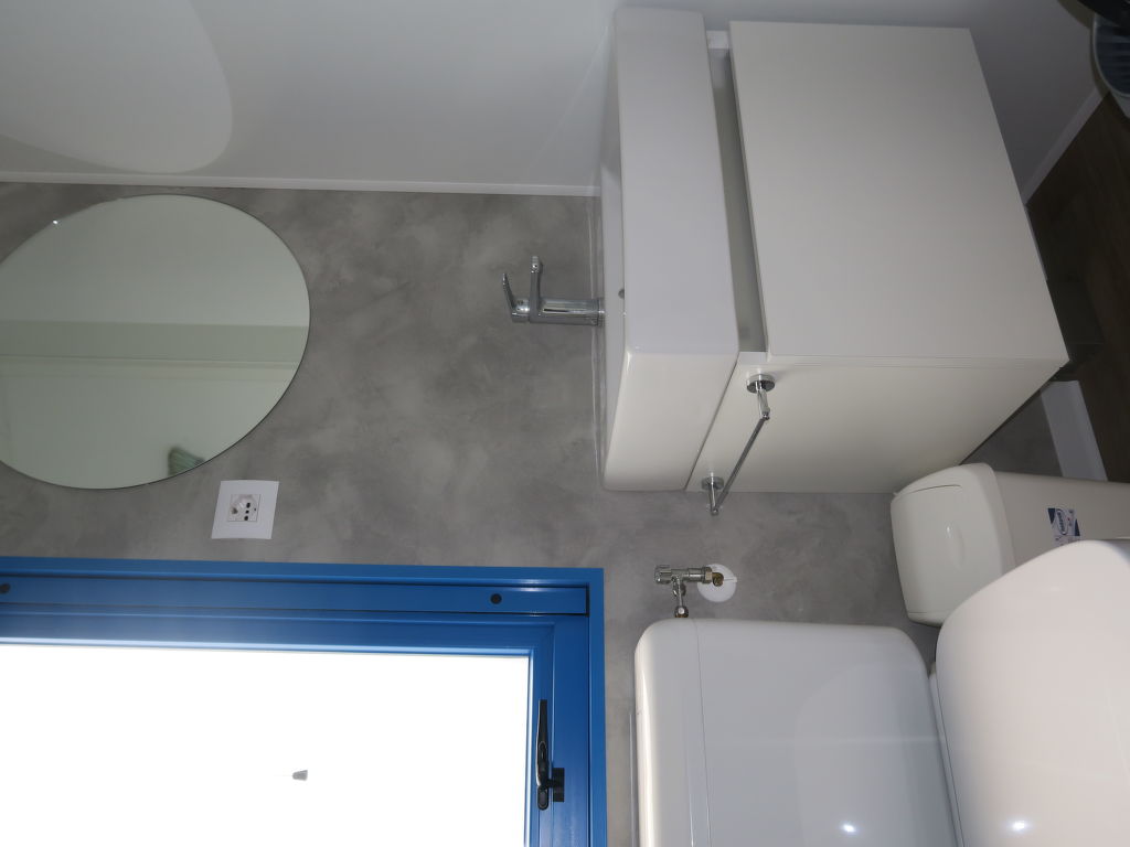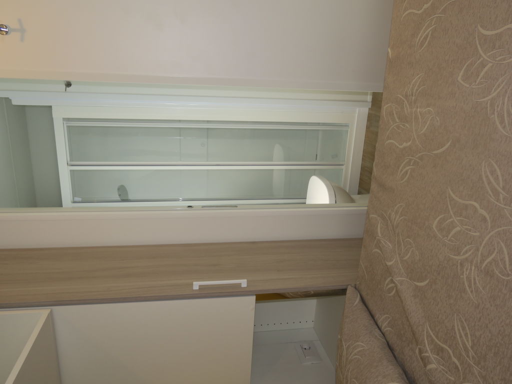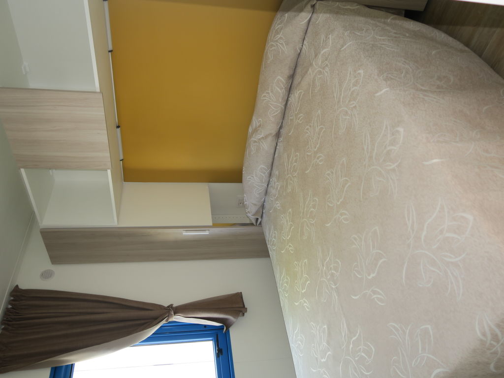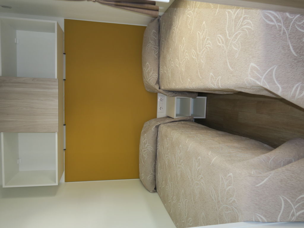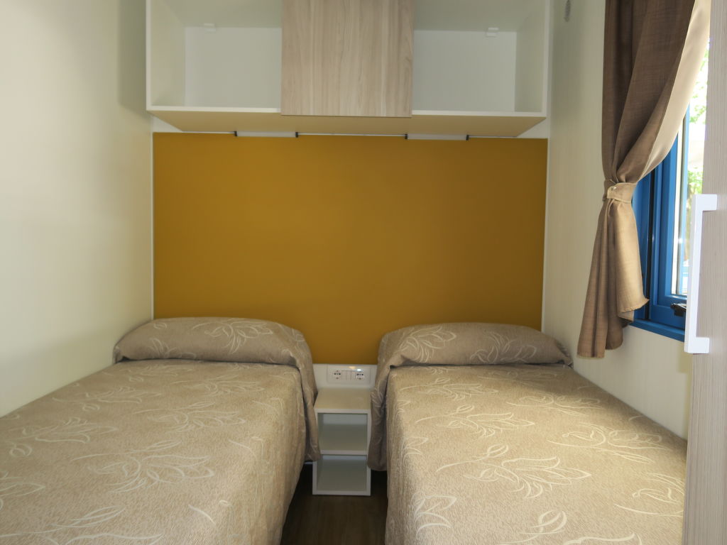 4-Zimmer-Mobilhome, ca. 34 m². Zugang über 3 Stufen und Terrasse. Wohn-/Schlafraum mit Bettcouch (als Zusatzbett gegen Bezahlung, siehe Nebenkosten), Essplatz und Küchenzeile (4 Flammen, Mikrowelle, Geschirrspüler, Kühl-/Gefrierkombination, Kaffeemaschine). Schlafzimmer mit franz. Bett (1,60 m breit) und Dusche/WC. Zweibettzimmer (Betten jeweils 0,75 m breit). Schlafzimmer mit Einzelbett (0,75 m breit) und Ausziehbett (0,70 m breit). Dusche/WC. Maximale Belegung: 6 Personen. Flexibilität bei der Bettenaufteilung: Es stehen mehr Schlafmöglichkeiten zur Verfügung als die maximal zugelassene Personenzahl, diese darf dennoch nicht überschritten werden.