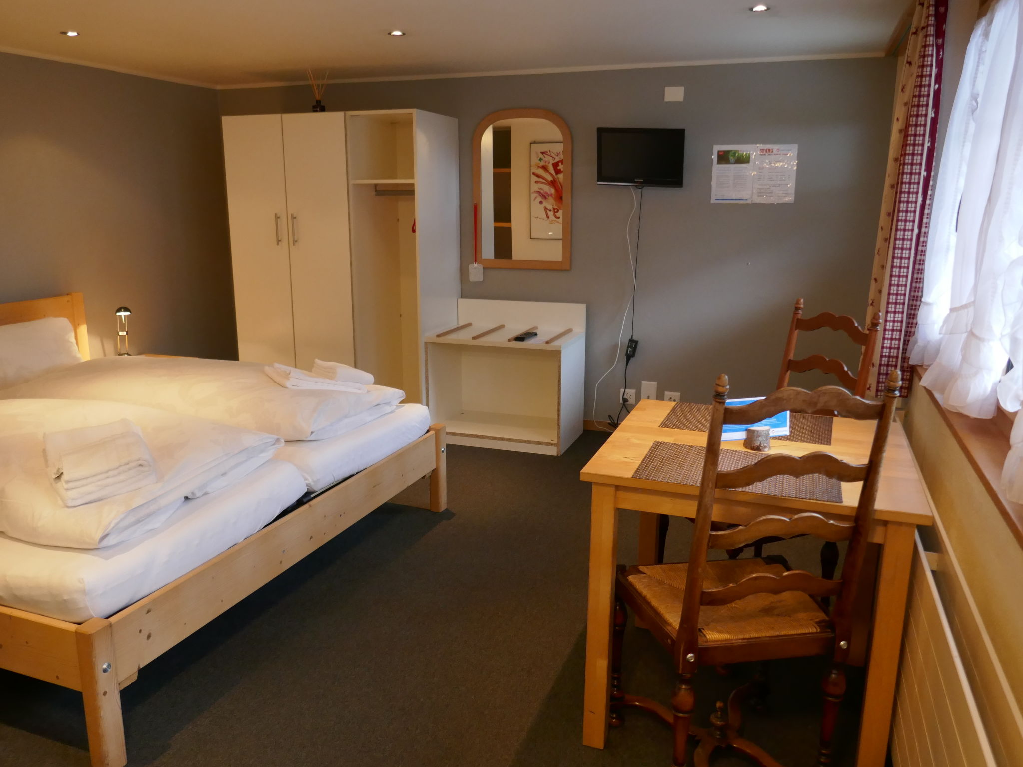 "Schwendihus", 1-Zimmer-Wohnung 25 m2, im Erdgeschoss, Südlage. Zweckmässig und gemütlich eingerichtet: Wohn-/Schlafzimmer mit 1 Doppelbett (2 x 90 cm, Länge 200 cm), Kabel-TV (Flachbildschirm). Ausgang zum Gartensitzplatz, Richtung Süden. Kochnische (2 Kochplatten, Toaster, Wasserkocher, elektrische Kaffeemaschine). Dusche/WC. Sicht auf die Berge. Zur Verfügung: Haartrockner. Internet (Wireless LAN, gratis). Parkplatz beim Haus. Bitte beachten: Wohnung auf Strassenseite. Maximal 1 Haustier/Hund erlaubt. Feuerlöscher.