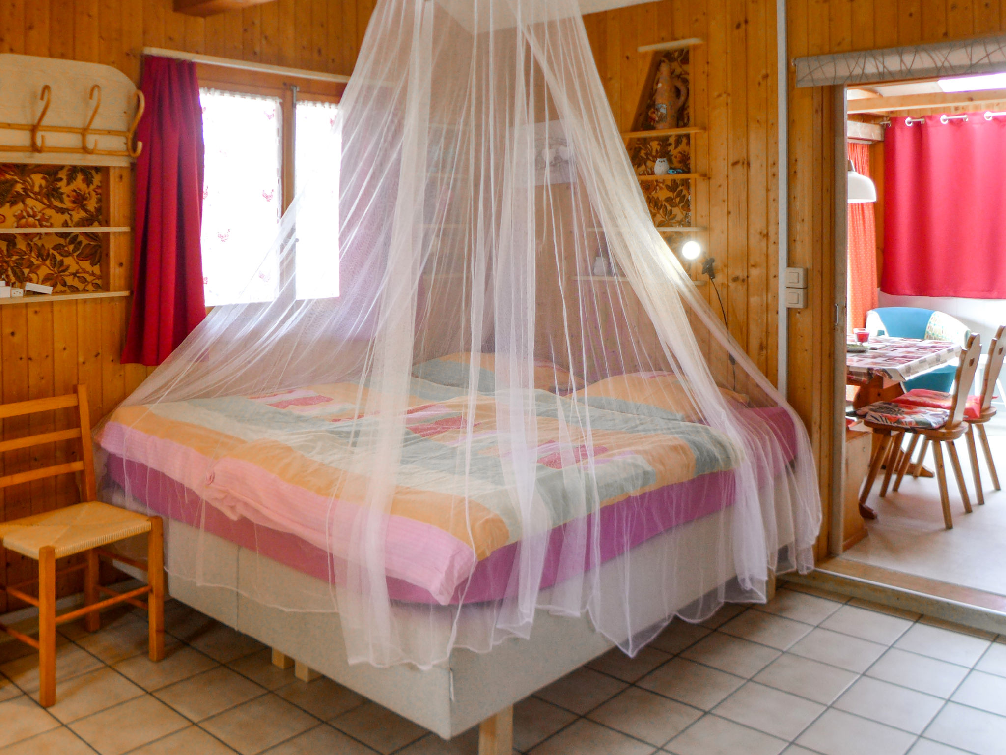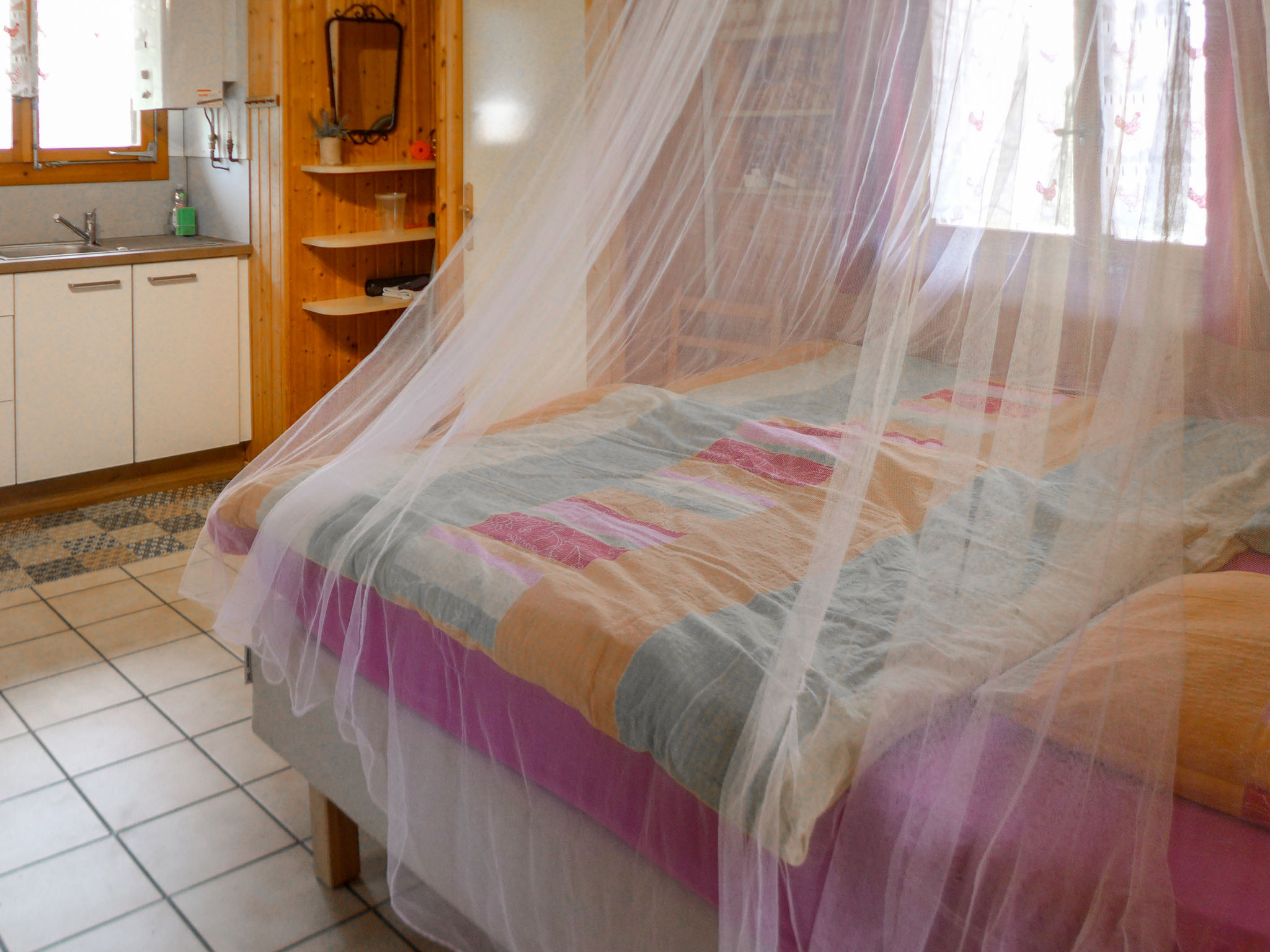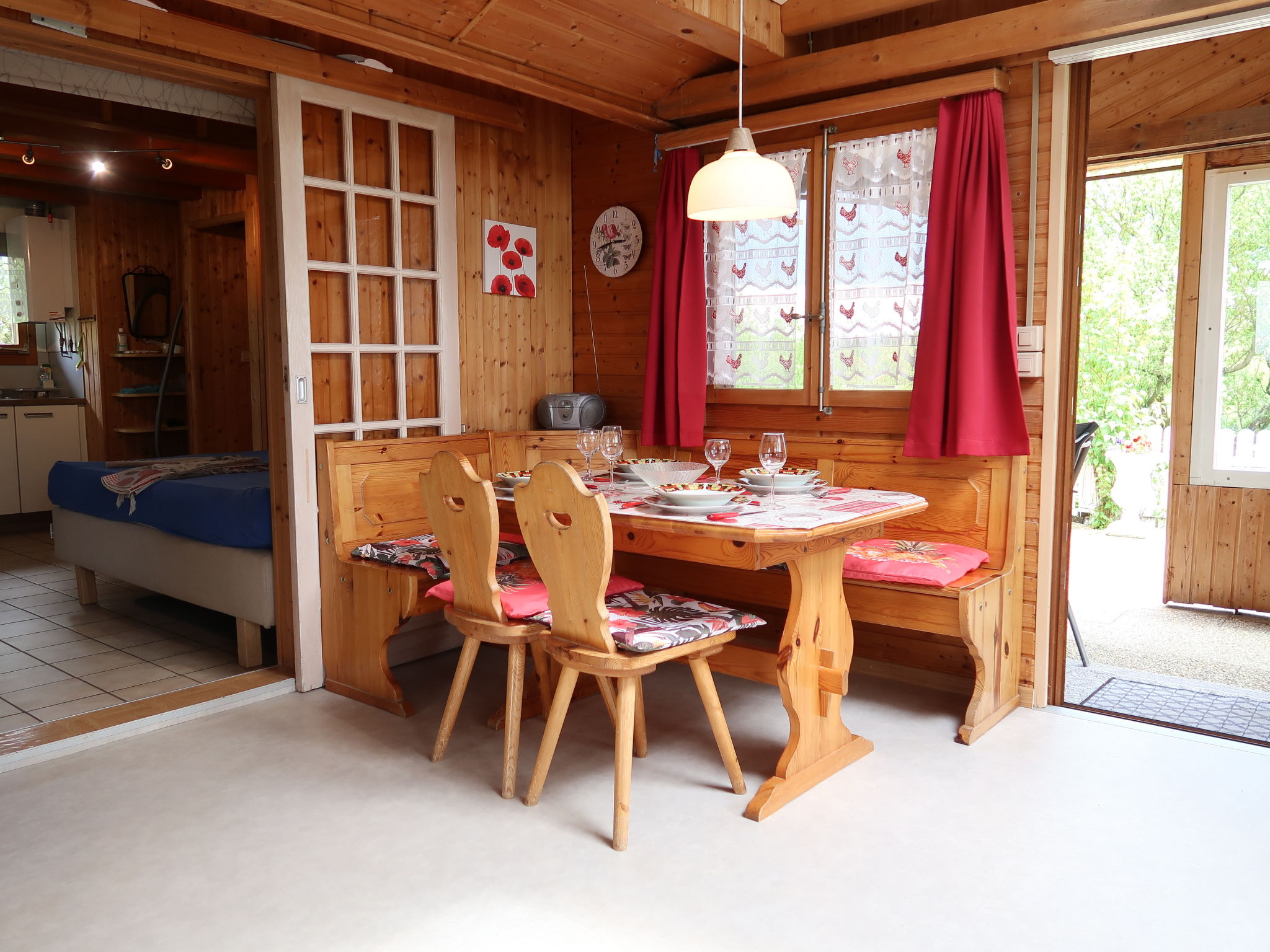 2-Zimmer-Chalet 45 m2. Objekt geeignet für 2 Erwachsene + 2 Kinder. Teilweise renoviert im Jahre 2020, geschmackvoll und gemütlich eingerichtet: Wohn-/Schlafzimmer mit 1 Ausziehbett (2 Pers. 2 x 90 cm, Länge 200 cm), Essecke, Sat-TV und Flachbildschirm. Ausgang zur Terrasse. Offene Küche (Backofen, 4 Glaskeramikherd Platten, Mikrowelle, Grill, elektrische Kaffeemaschine, Kapseln für die Kaffeemaschine (Delizio), Racletteofen, Fondue Set (Käse)) mit 2 Betten (90 cm, Länge 200 cm), Schwedenofen. Dusche/WC. Holzheizung, Boiler. Terrasse 50 m2. Terrassenmöbel, Liegestühle (2). Sehr schöne Sicht auf die Landschaft. Zur Verfügung: Fliegengitter, Haartrockner, Holz (extra). Parkplatz beim Haus. Bitte beachten: Nichtraucher-Unterkunft. Maximal 2 Haustiere/Hunde erlaubt.