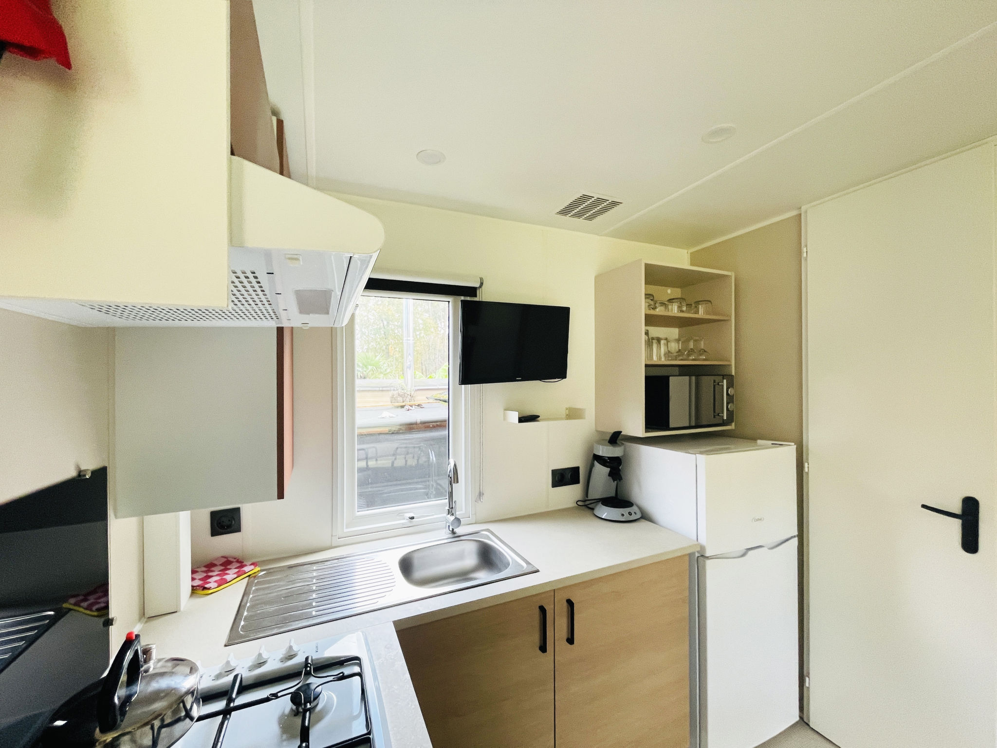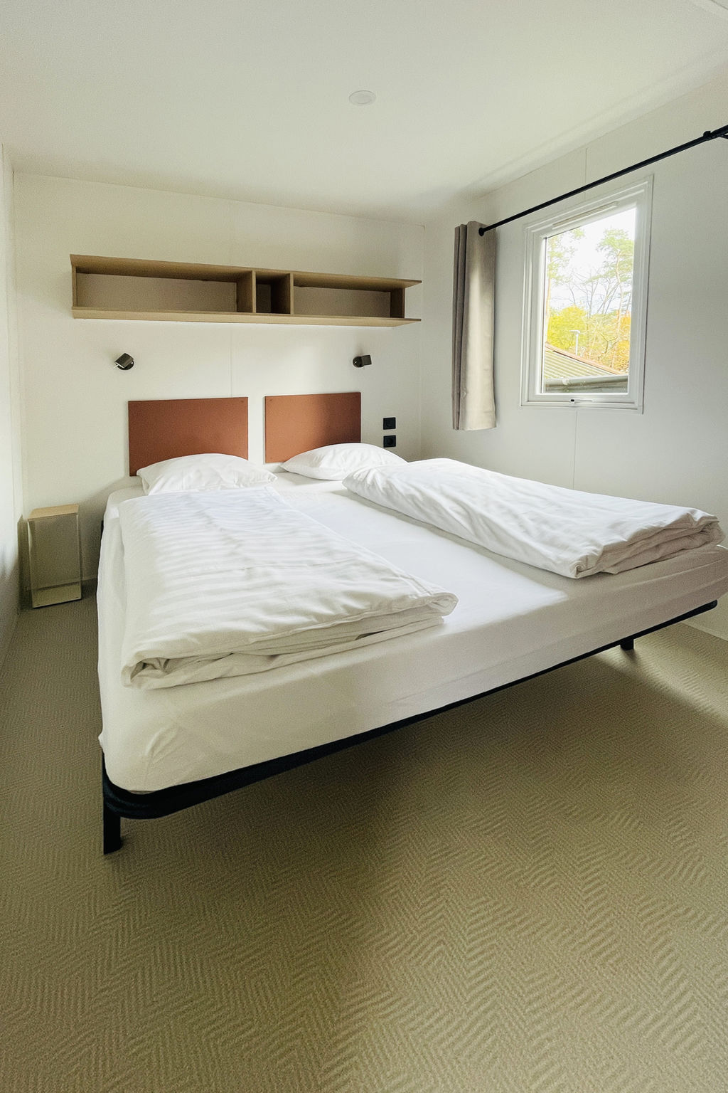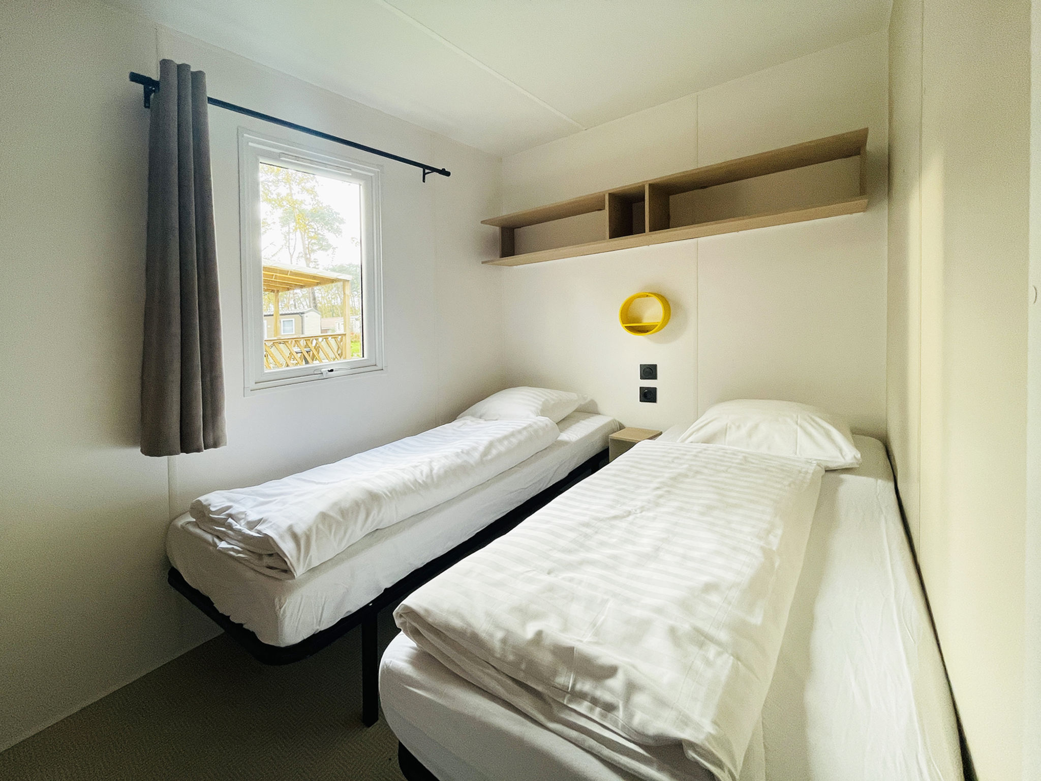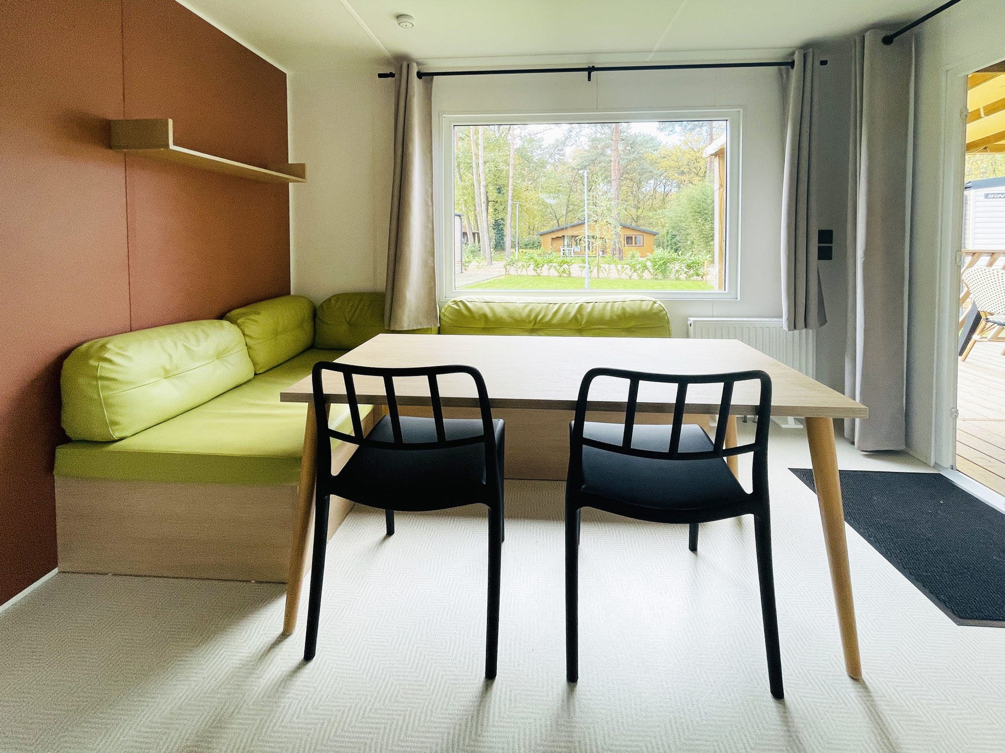 "4 persoons", 3-Zimmer-Mobilheim 30 m2. Zweckmässig eingerichtet: Eingang mit sep. WC. Wohn-/Esszimmer mit Esstisch und Flachbildschirm. Ausgang zur Terrasse. 1 Doppelzimmer mit 1 Doppelbett. 1 Doppelzimmer mit 2 Betten. Offene Küche (4 Flammen, Wasserkocher, Mikrowelle, elektrische Kaffeemaschine). Dusche. Heizung. Terrasse. Terrassenmöbel. Zur Verfügung: Internet (Wireless LAN, gratis). Parkplatz (1 Auto) beim Haus. Bitte beachten: Nichtraucher-Haus.