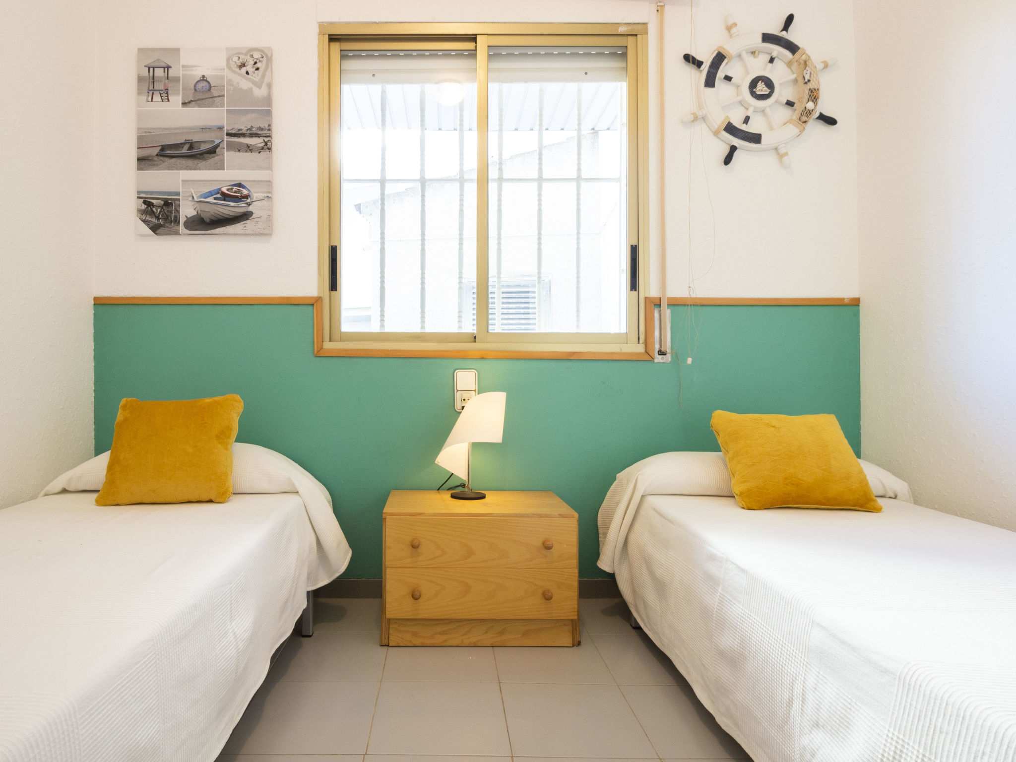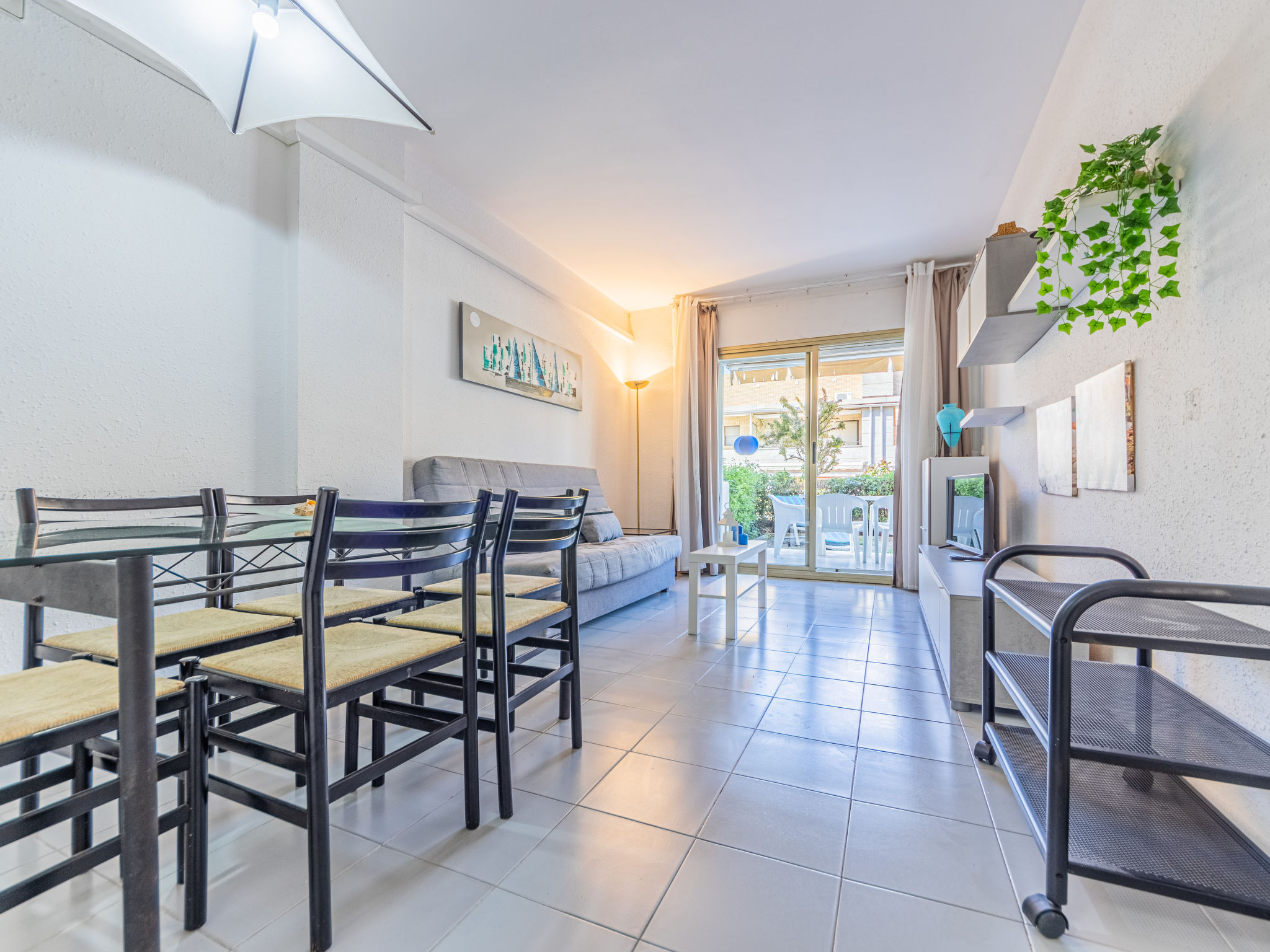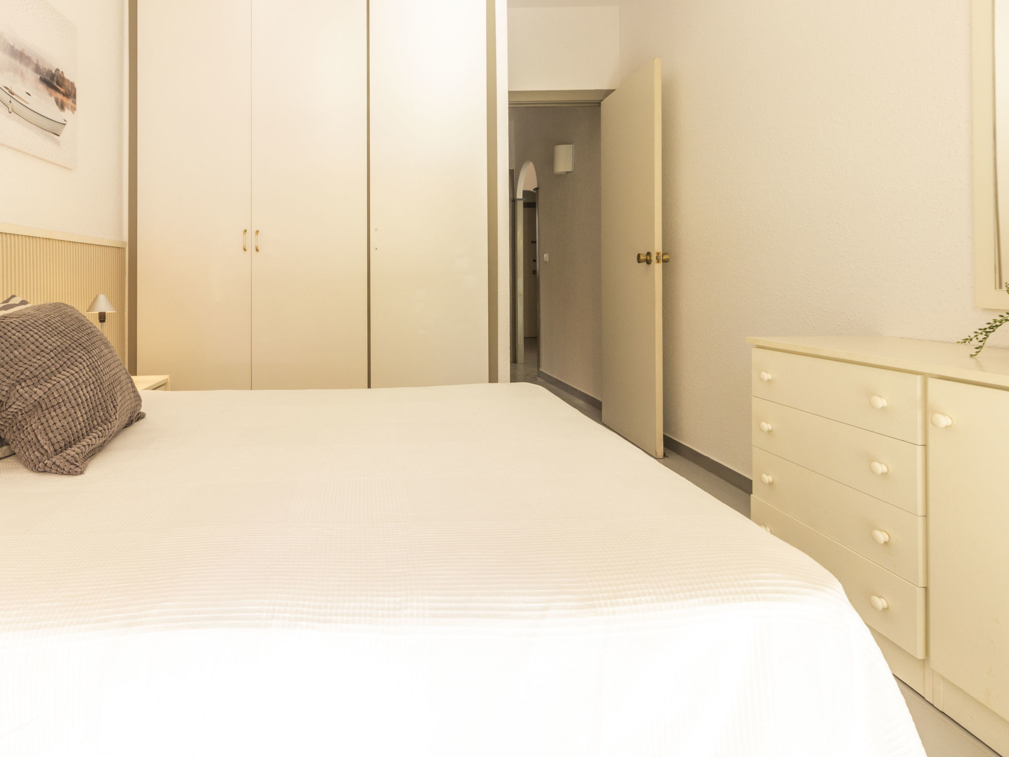 "Golf Sant Jordi", 3-Zimmer-Wohnung 51 m2, im Erdgeschoss. Zweckmässig und gemütlich eingerichtet: Wohn-/Esszimmer mit 1 Diwanbett, Digital-TV, Klimaanlage und Warmluftheizung. Ausgang zur Terrasse. 1 Zimmer mit 1 franz. Bett (150 cm, Länge 190 cm). 1 Zimmer mit 2 Betten (90 cm, Länge 190 cm). Offene Küche (Backofen, 3 Glaskeramikplatten, Toaster, Wasserkocher, Mikrowelle, elektrische Kaffeemaschine). Bad/WC. Keine Heizmöglichkeit. Terrasse. Terrassenmöbel, Liegestühle. Seitliche Sicht auf das Meer. Zur Verfügung: Waschmaschine, Bügeleisen, Haartrockner. Bitte beachten: Nichtraucher-Unterkunft. HUTT044435 // Reg. Nr.: ESFCTU000043031000188110000000000000000000HUTT0444353