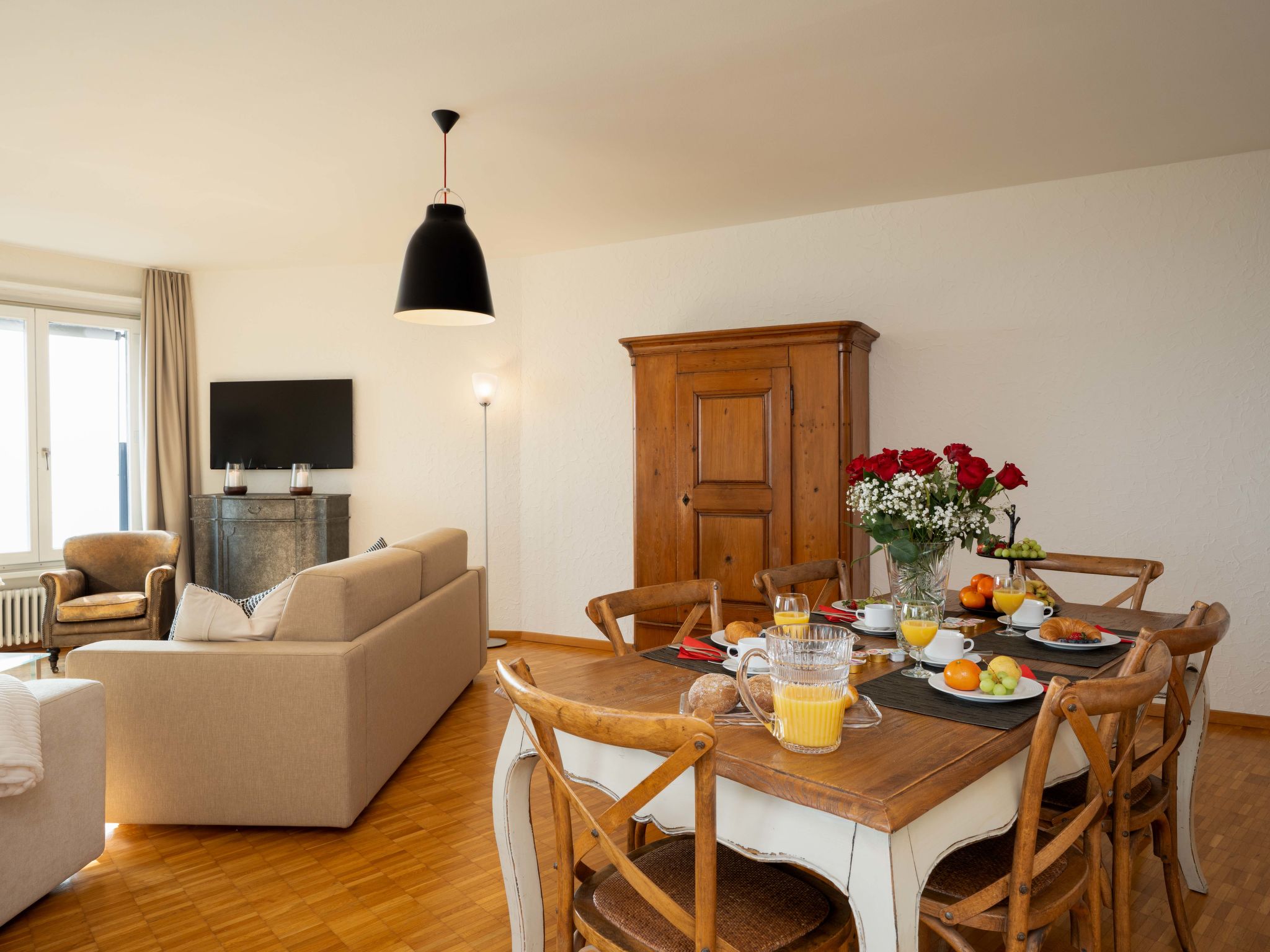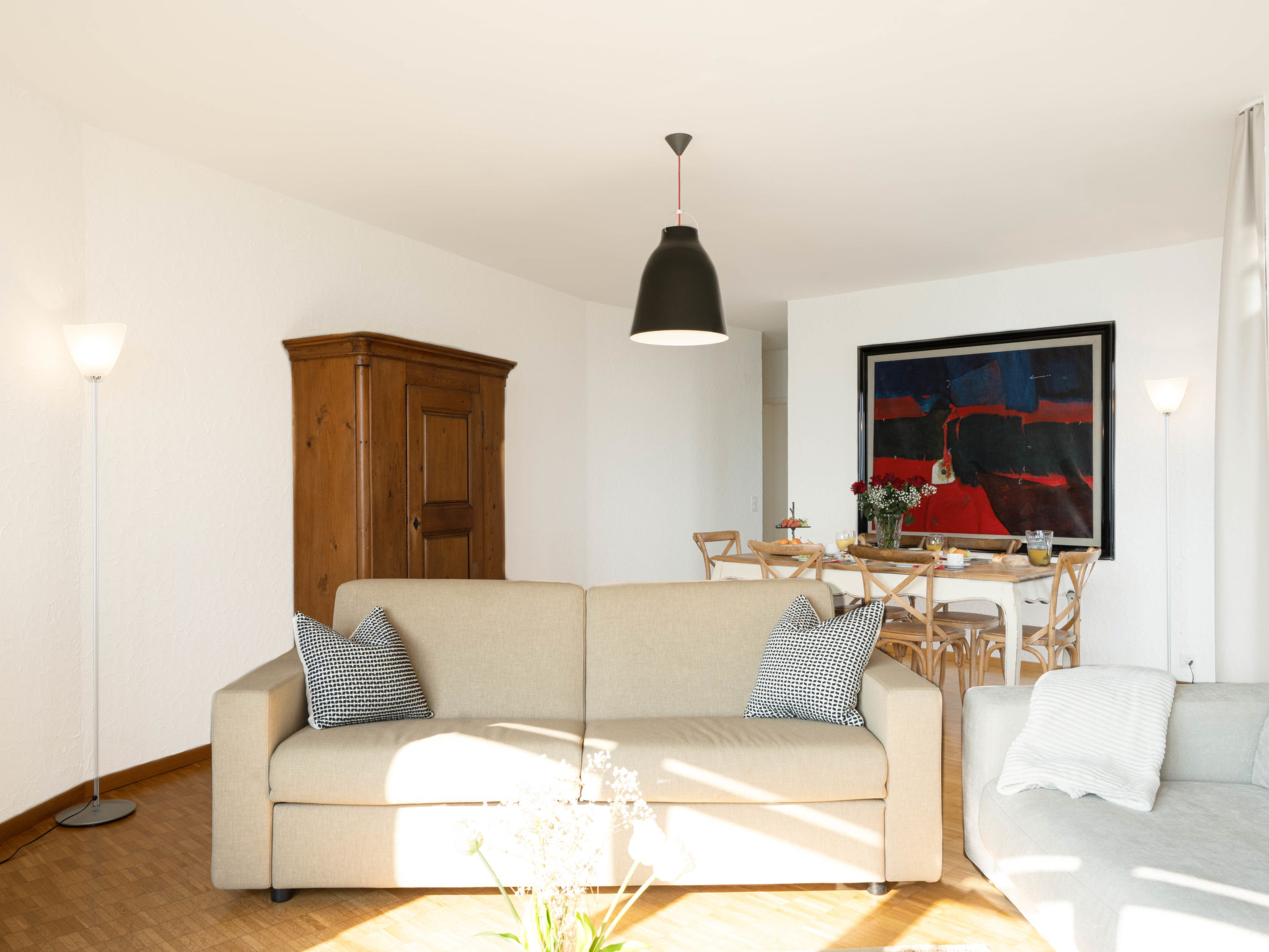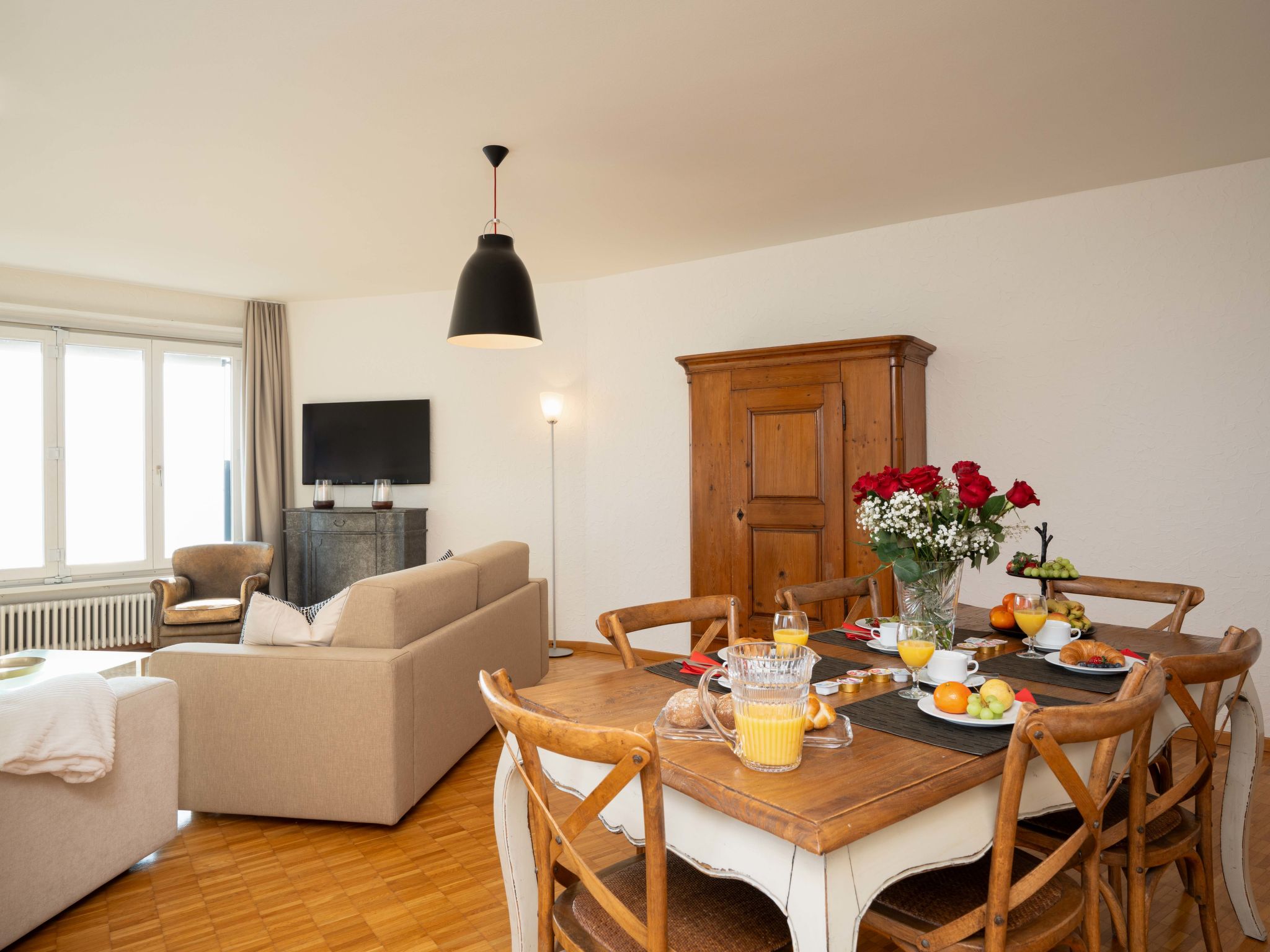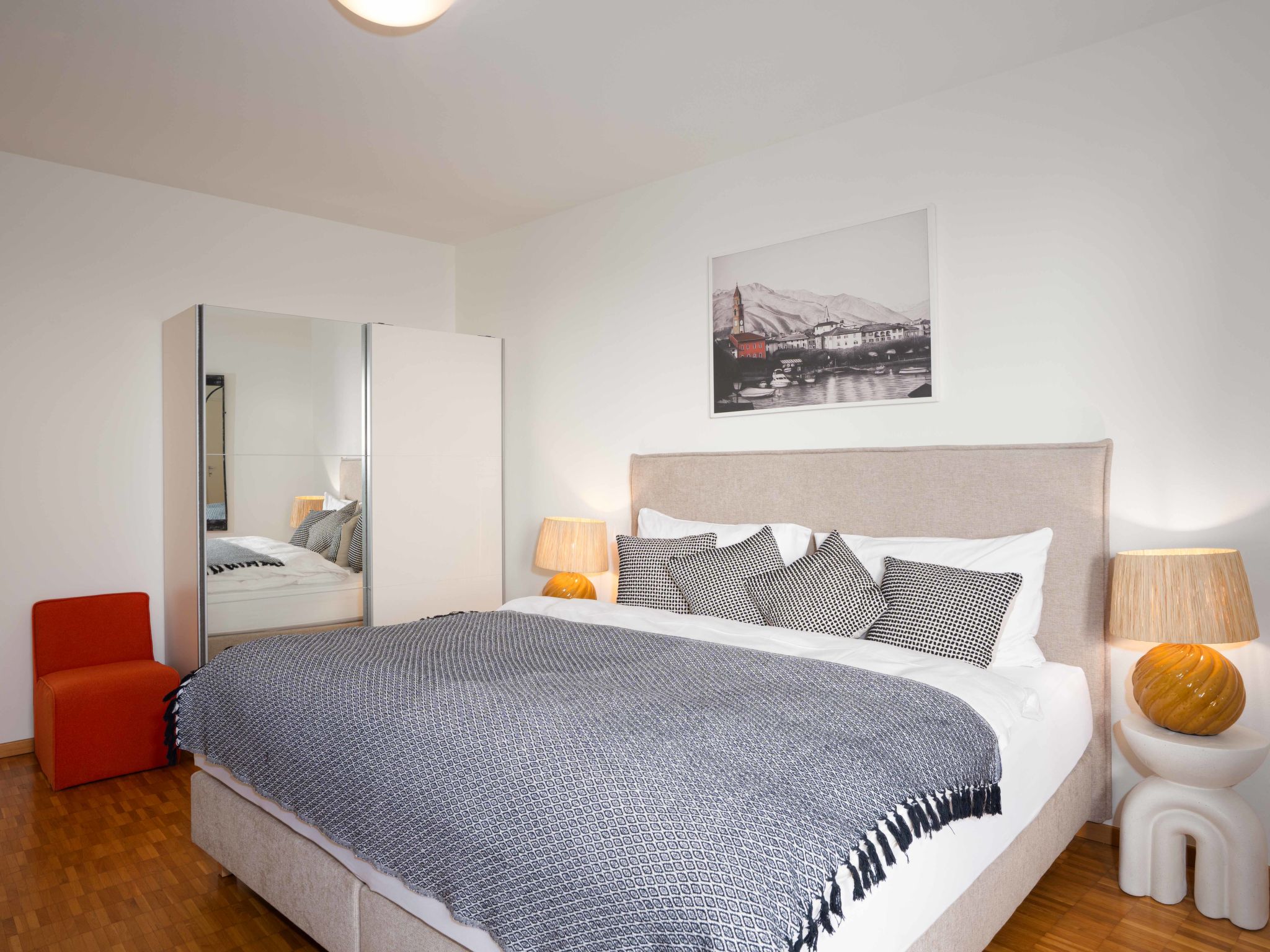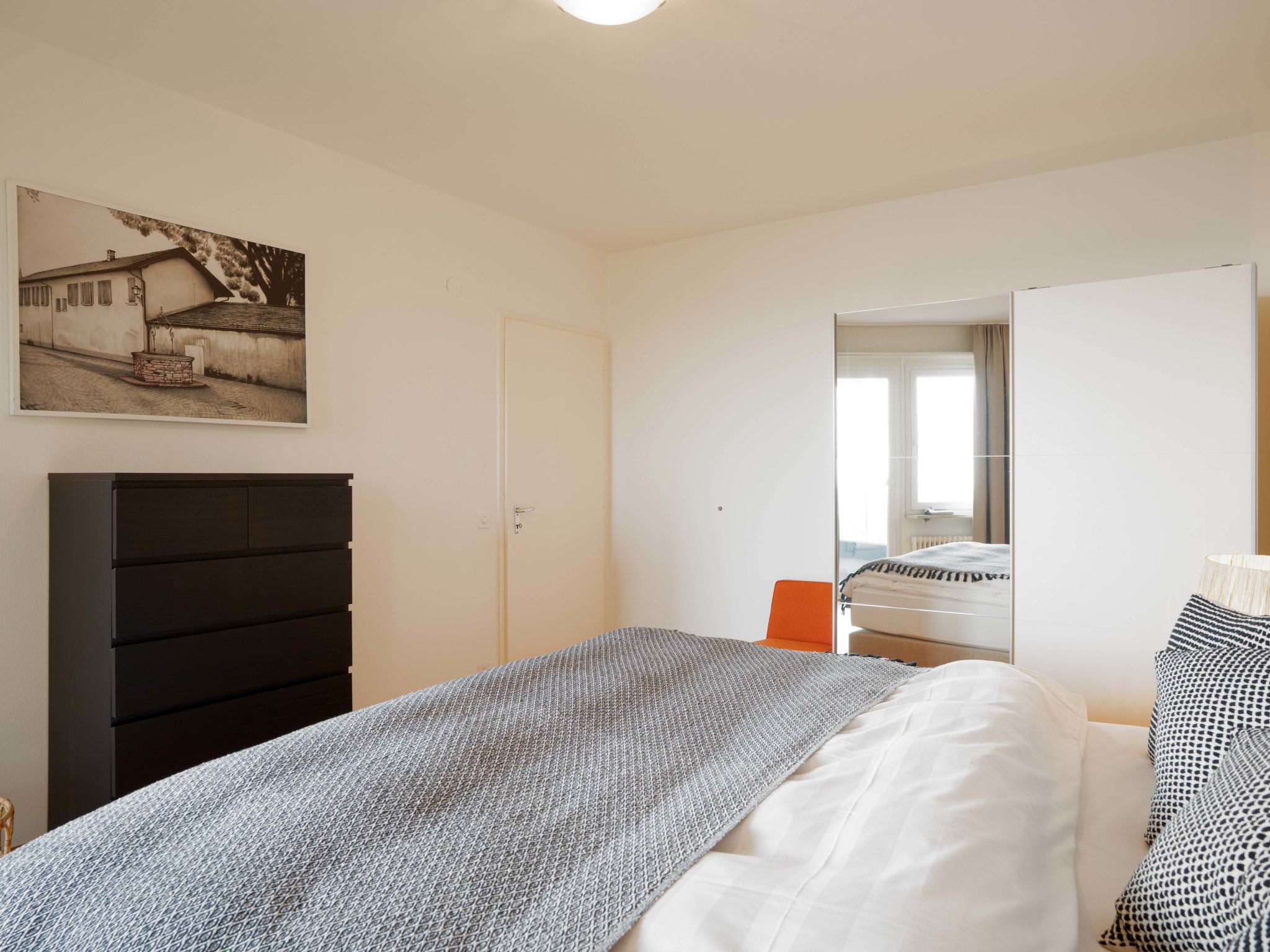 "Suite Modern", 2-Zimmer-Wohnung 90 m2 im 3. Stock, Südostlage. Renoviert: Wohn-/Esszimmer mit 1 Doppeldiwanbett, Sat-TV und Radio. 1 grosses Zimmer mit 2 Betten. Küche (Backofen, Geschirrspüler, elektrische Kaffeemaschine, Kapseln für die Kaffeemaschine (Nespresso) extra). Bad/WC. Balkon, Ostlage, kleiner Balkon. Herrliche Sicht auf den See, die Berge und die Ortschaft. Zur Verfügung: Internet (Wireless LAN, gratis). Bitte beachten: Nichtraucher-Unterkunft, Nichtraucher-Haus. Maximal 1 Haustier/Hund erlaubt.