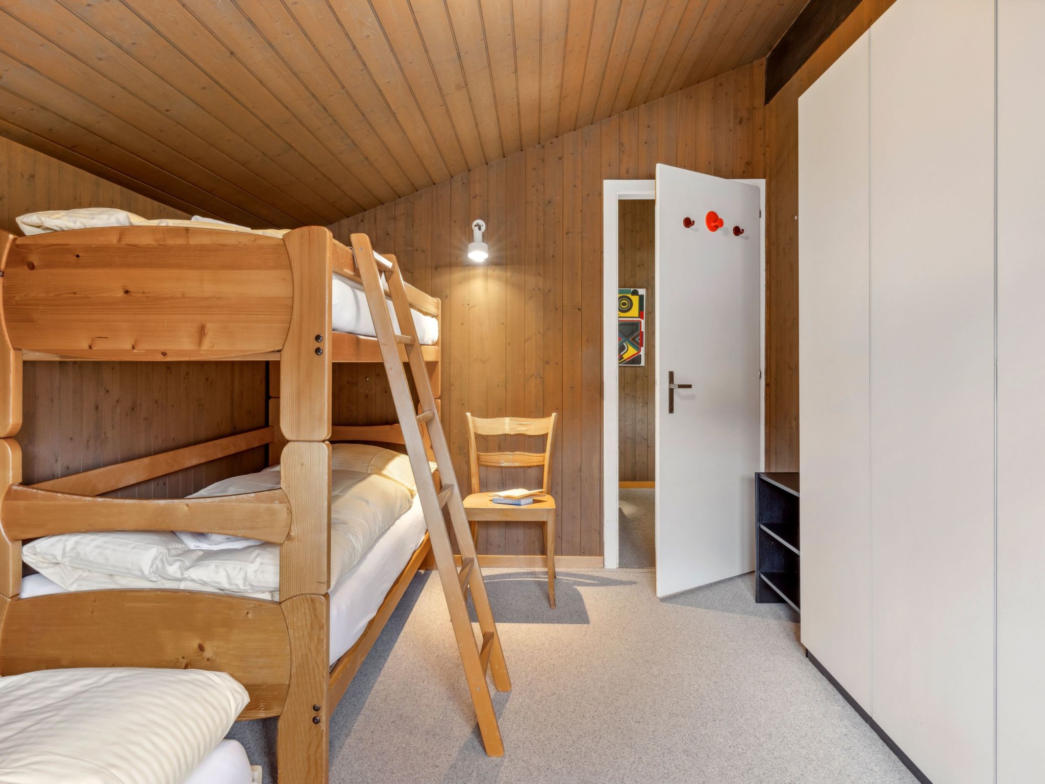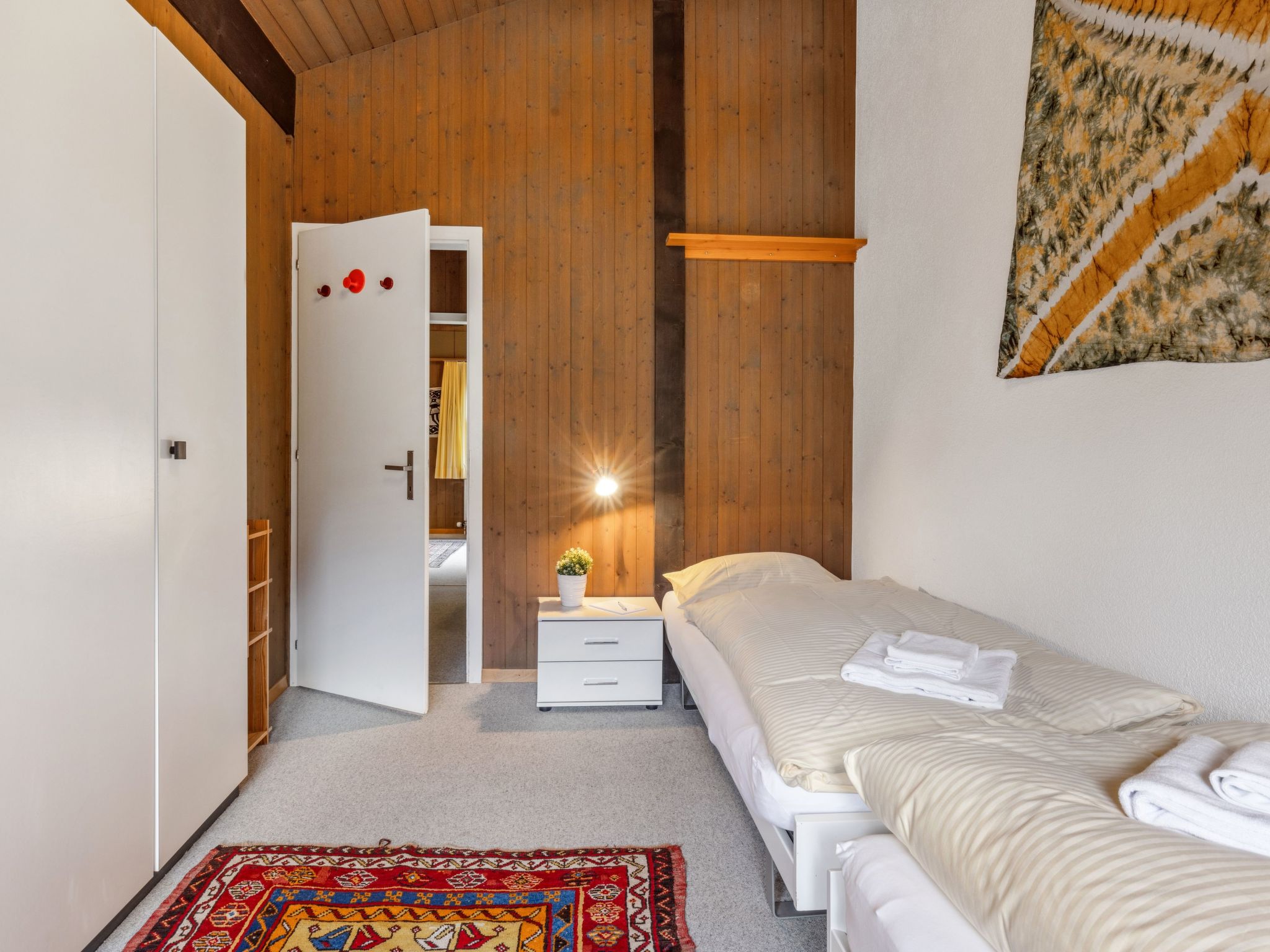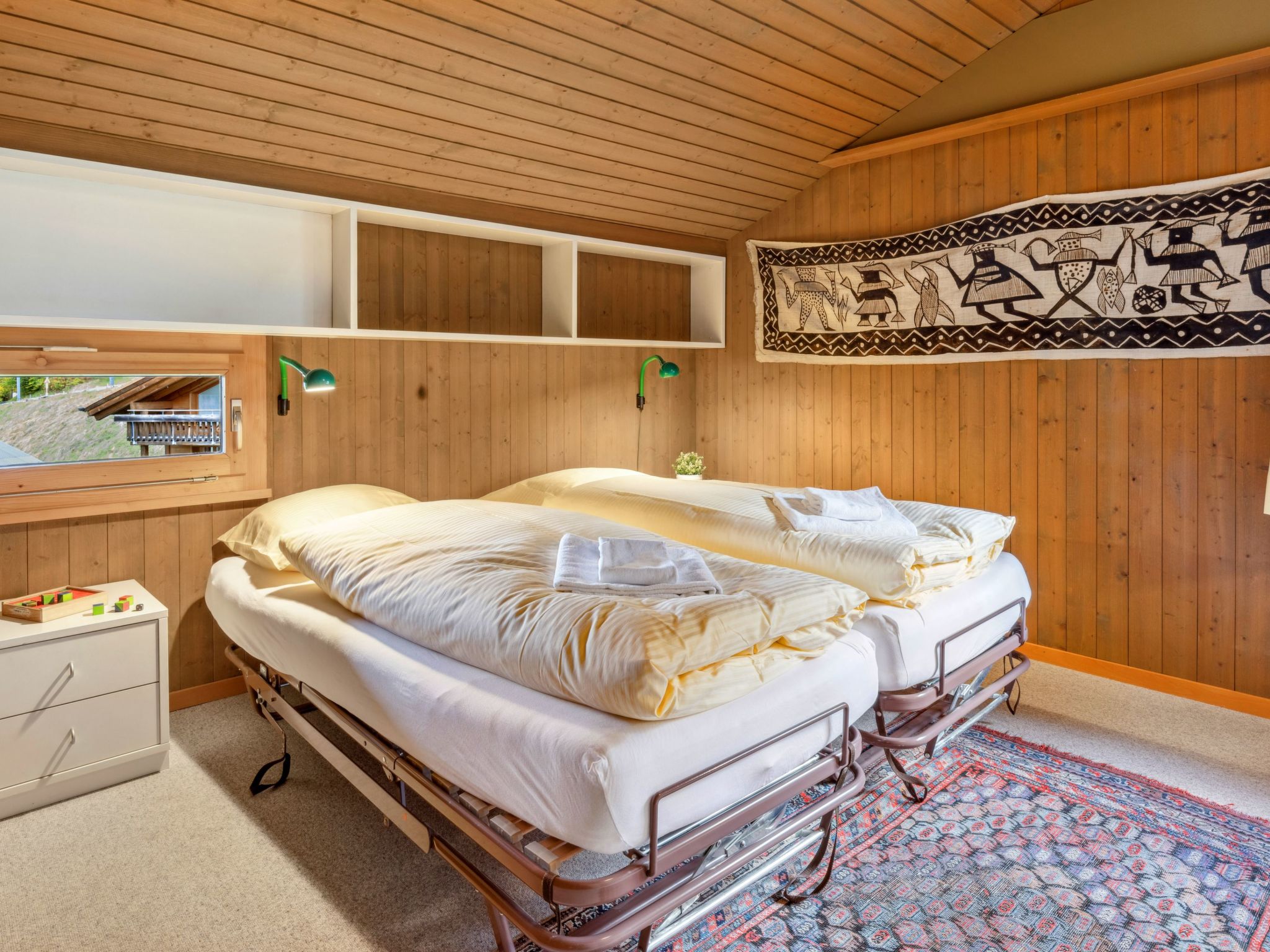 4-Zimmer-Wohnung 90 m2 auf 2 Stockwerken. Geräumig und hell, teilweise abgeschrägt, komfortabel und gemütlich eingerichtet: Wohnzimmer mit offenem Kamin, Kabel-TV, Radio, CD und DVD. Wohnküche (Backofen, Geschirrspüler, 4 Glaskeramikherd Platten, Toaster, Wasserkocher, Mikrowelle, elektrische Kaffeemaschine, Kapseln für die Kaffeemaschine (Nespresso) extra, Racletteofen, Fondue Set (Käse)). Sep. WC. Obergeschoss: 1 Zimmer mit 1 Doppelbett (2 x 90 cm, Länge 200 cm). 1 Zimmer mit 2 Betten (90 cm, Länge 200 cm). 1 Zimmer mit 1 Bett (90 cm, Länge 190 cm), 1 x 2 Etagenbetten (90 cm, Länge 190 cm). Bad/WC. Grosser Gartensitzplatz. Terrassenmöbel. Sehr schöne Sicht auf die Berge. Zur Verfügung: Haartrockner, Holz (extra). Internet (Wireless LAN). Bitte beachten: geeignet für Familien. Nichtraucher-Unterkunft. 1 Haustier/Hund erlaubt.