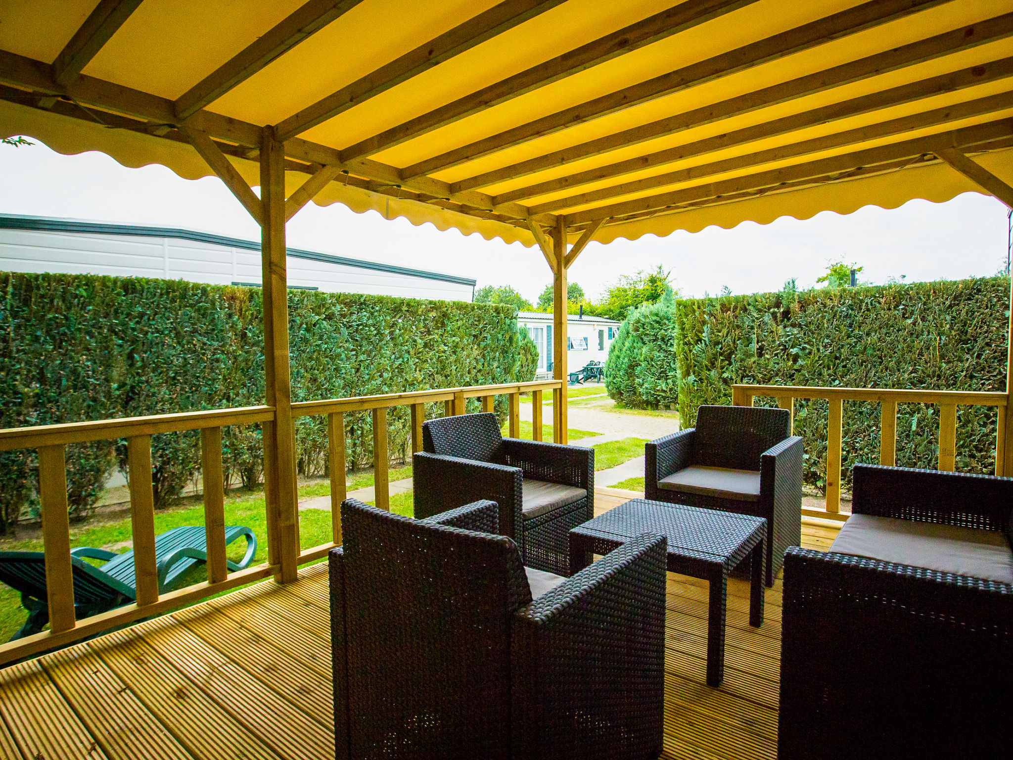 "Veranda 5", 3-Zimmer-Chalet 36 m2. Zweckmässig eingerichtet: offenes Wohn-/Esszimmer mit TV und G-Heizofen. Ausgang zur Terrasse. 1 Doppelzimmer mit 2 Betten. 1 Zimmer mit 1 Bett und 1 x 2 Etagenbetten. Offene Küche (4 Kochplatten, Wasserkocher, Mikrowelle, elektrische Kaffeemaschine). Dusche/WC. Terrasse. Terrassenmöbel. Zur Verfügung: Internet (Wireless LAN, gratis). Parkplatz (1 Auto) beim Haus. Bitte beachten: Nichtraucher-Haus.
