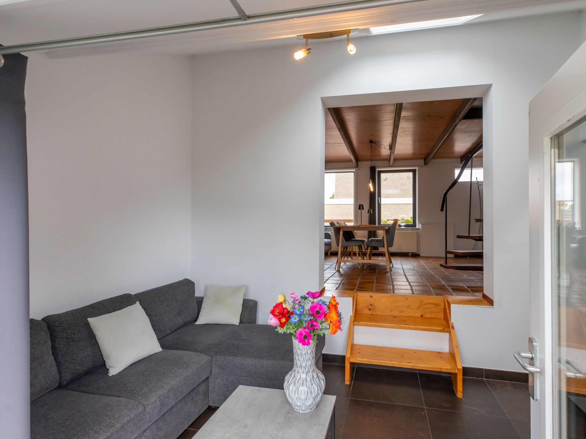 4-Zimmer-Haus, 3 Ebenen, ca. 80 m². Erdgeschoss: Wohn-/Schlafraum mit Sitzgruppe/Doppelbettcouch, Ausgang in den Garten und zur Terrasse. Über 2 Stufen hinauf zu großem Esszimmer mit Kachelofen (nur Dekoration). Küche (4 Flammen, Backofen, Mikrowelle, Geschirrspüler, Kühlschrank, Kaffeemaschine, Wasserkocher, Toaster, Sandwich-Maker, Raclette-Set). Dusche/WC. Vom Esszimmer Wendeltreppe ins Dachgeschoss (eingeschränkte Stehhöhe): Flur. Schlafzimmer mit Doppelbett, Einzelbett. Schlafzimmer mit franz. Bett (1,60 m breit), Einzelbett. Flexibilität bei der Bettenaufteilung: Es stehen mehr Schlafmöglichkeiten zur Verfügung als die maximal zugelassene Personenzahl, diese darf dennoch nicht überschritten werden.