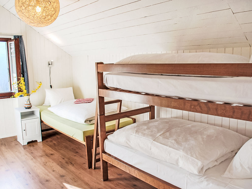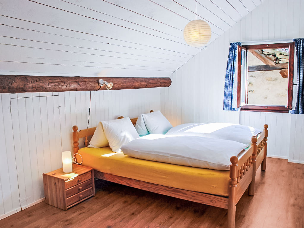 "Marianne Plus", 3-Zimmer-Haus 100 m2 auf 2 Stockwerken, Südlage. Teilweise abgeschrägt, teilweise renoviert im Jahre 2017, komfortabel und gemütlich eingerichtet: offenes Wohn-/Esszimmer mit 1 Diwanbett (140 cm, Länge 190 cm), offenem Kamin, Sat-TV, Flachbildschirm und Radio. Ausgang zum Gartensitzplatz. Offene Küche (Backofen, Geschirrspüler, 4 Glaskeramikherd Platten, elektrische Kaffeemaschine, Kapseln für die Kaffeemaschine (Dolce Gusto) extra, Racletteofen, Fondue Set (Käse)). Ausgang zur Terrasse. Obergeschoss: (steile Treppe) 1 abgeschrägtes Doppelzimmer mit 2 Betten (90 cm, Länge 200 cm). 1 abgeschrägtes Zimmer mit 1 Bett (90 cm, Länge 200 cm), 1 x 2 Etagenbetten (90 cm, Länge 200 cm). Dusche/WC. E-Heizung. Natursteinböden. Kleiner Gartensitzplatz 10 m2, teilweise überdacht. Gartengrill, Sitzplatz. Eingeschränkte Sicht auf die Berge und die Landschaft. Zur Verfügung: Kinderhochstuhl, Babybett bis 3 Jahre (extra), Haartrockner, Holz (extra). Internet (Wireless LAN, extra). Bitte beachten: Nichtraucher-Haus. Maximal 3 Haustiere/Hunde erlaubt. Traumhaft in mitten der Natur, für Naturliebhaber und Ideal für lange Spaziergänge mit Hunden. Ruhe Pur! Entspannen und geniessen.