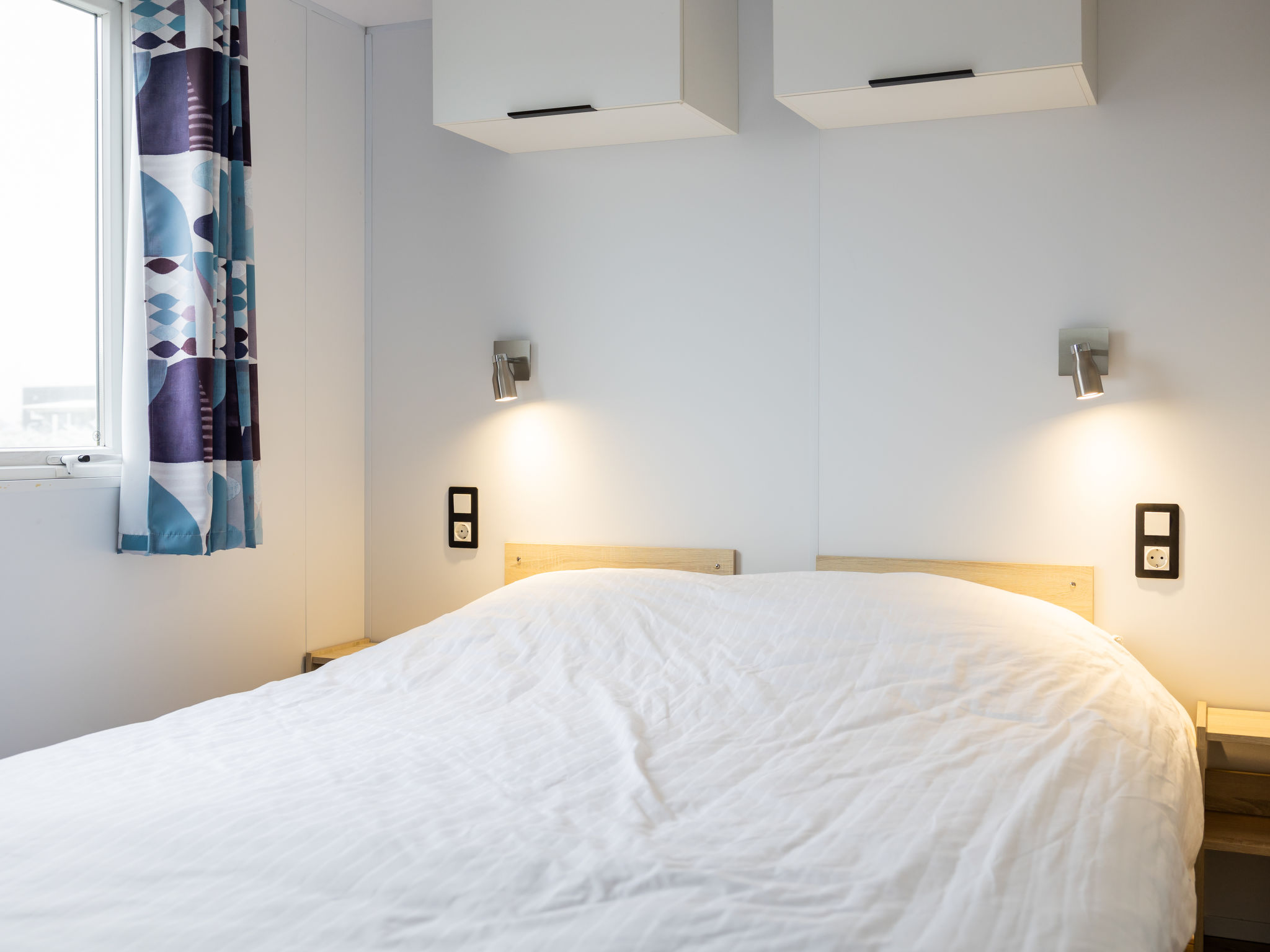 "4-persoons Hilda", 3-Zimmer-Mobilheim 27 m2. Komfortabel eingerichtet: Wohn-/Esszimmer mit Esstisch und Flachbildschirm. Ausgang zur Terrasse. 1 Zimmer mit 2 Betten. 1 Zimmer mit 1 Doppelbett (1 x 160 cm, Länge 190 cm). Offene Küche (4 Kochplatten, Geschirrspüler, Wasserkocher, Mikrowelle, elektrische Kaffeemaschine). Dusche, sep. WC. E-Heizung. Terrasse. Terrassenmöbel. Zur Verfügung: Internet (Wireless LAN, gratis). Bitte beachten: Nichtraucher-Unterkunft. 1 Haustier/Hund erlaubt.