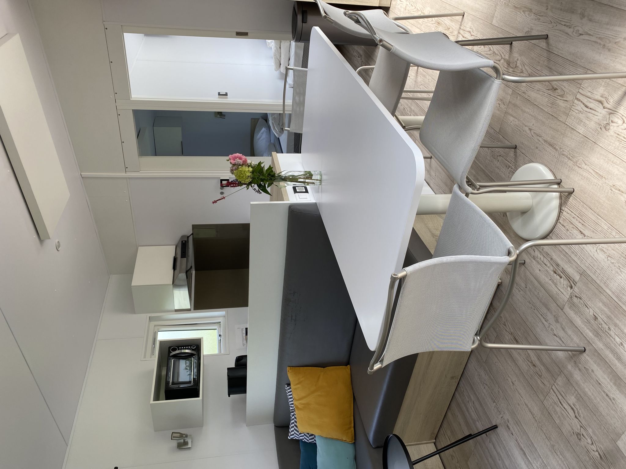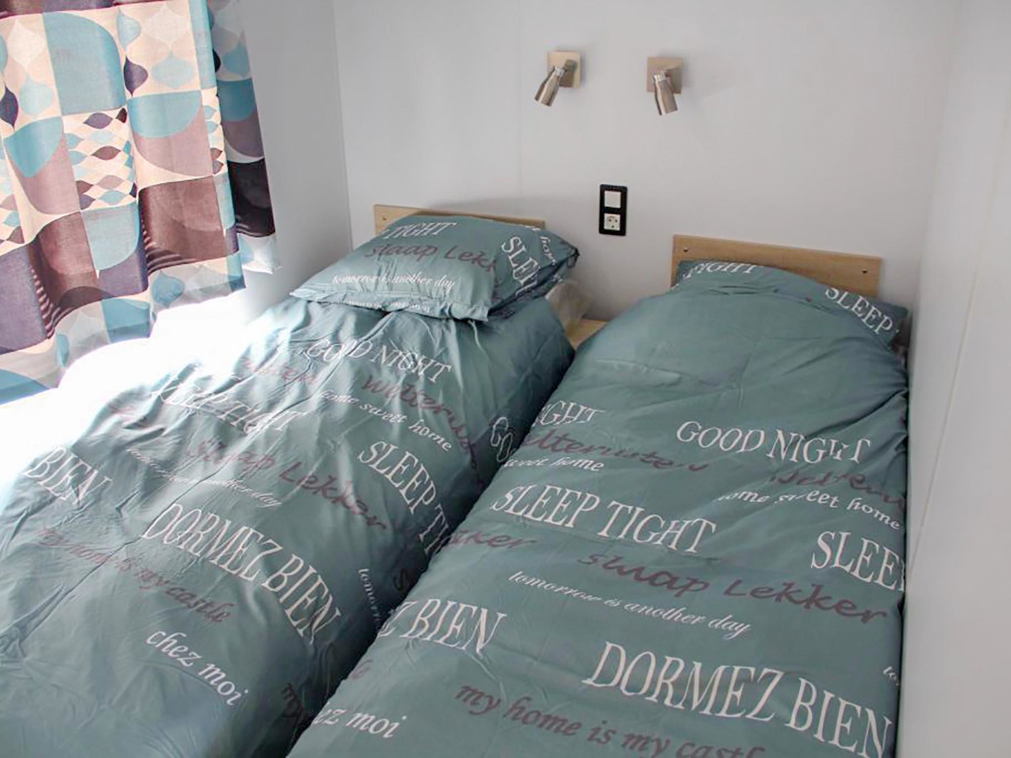 "6-persoons Jildau", 4-Zimmer-Mobilheim 40 m2. Komfortabel eingerichtet: Wohn-/Esszimmer mit Esstisch und Flachbildschirm. Ausgang zur Terrasse. 1 Zimmer mit 2 Betten. 1 Zimmer mit 1 Doppelbett. 1 Zimmer mit 1 x 2 Etagenbetten. Offene Küche (4 Kochplatten, Geschirrspüler, Wasserkocher, Mikrowelle, elektrische Kaffeemaschine). Dusche/WC. E-Heizung. Terrasse. Terrassenmöbel. Zur Verfügung: Internet (Wireless LAN, gratis). Bitte beachten: Nichtraucher-Unterkunft.