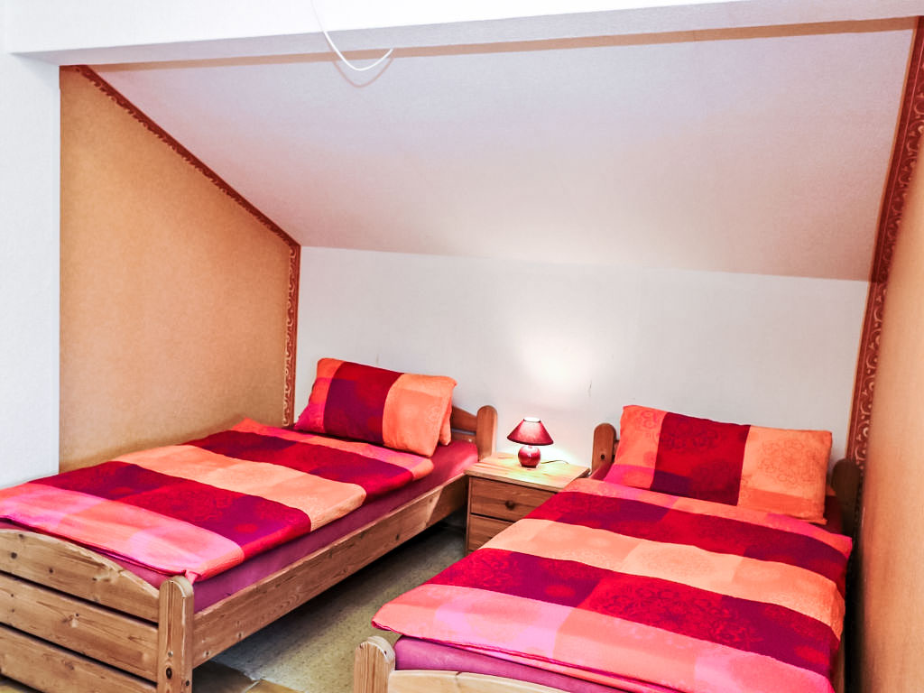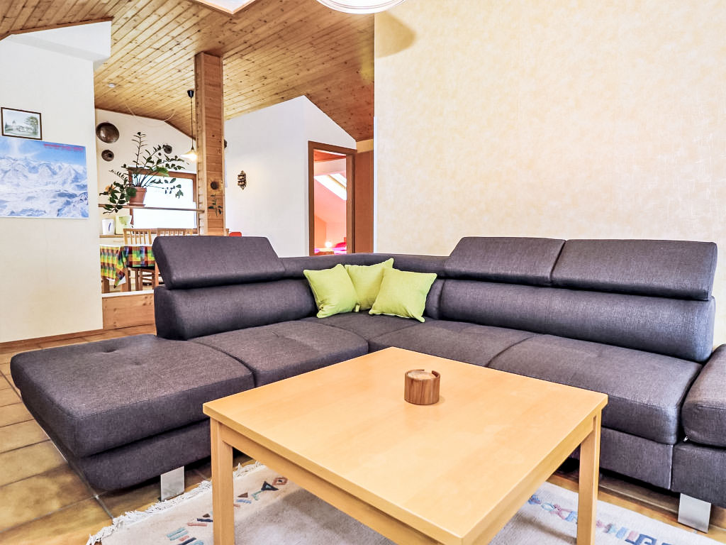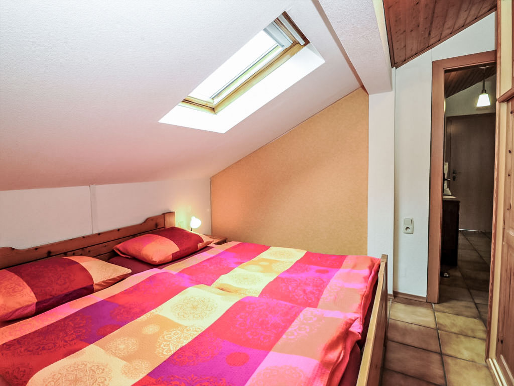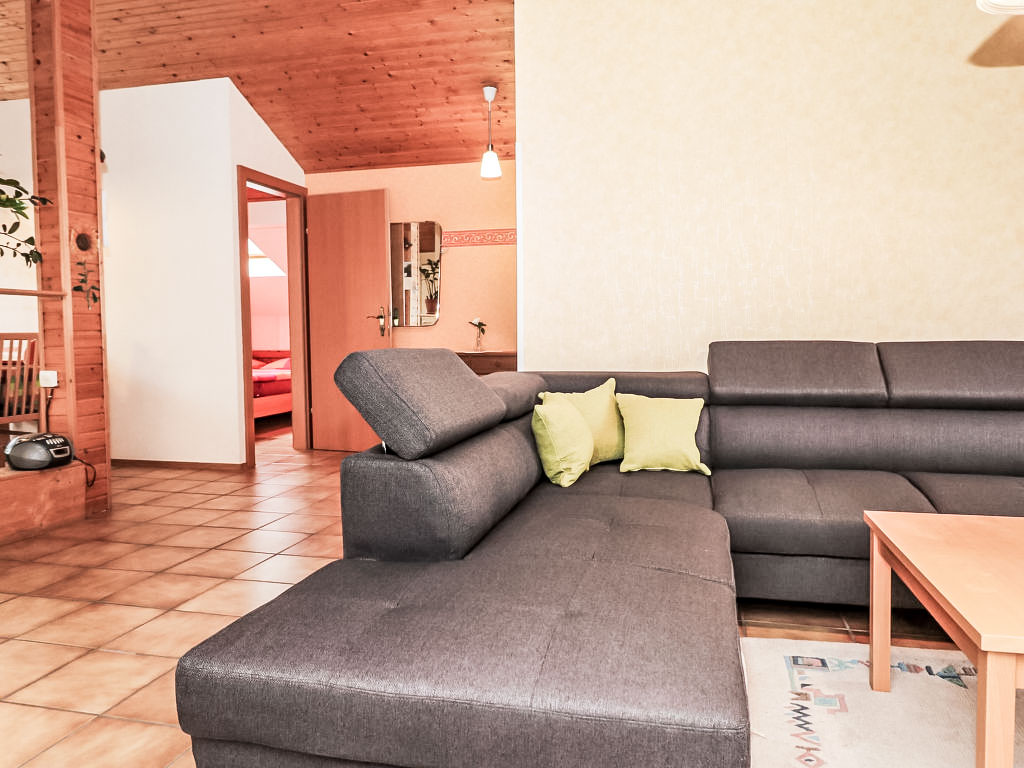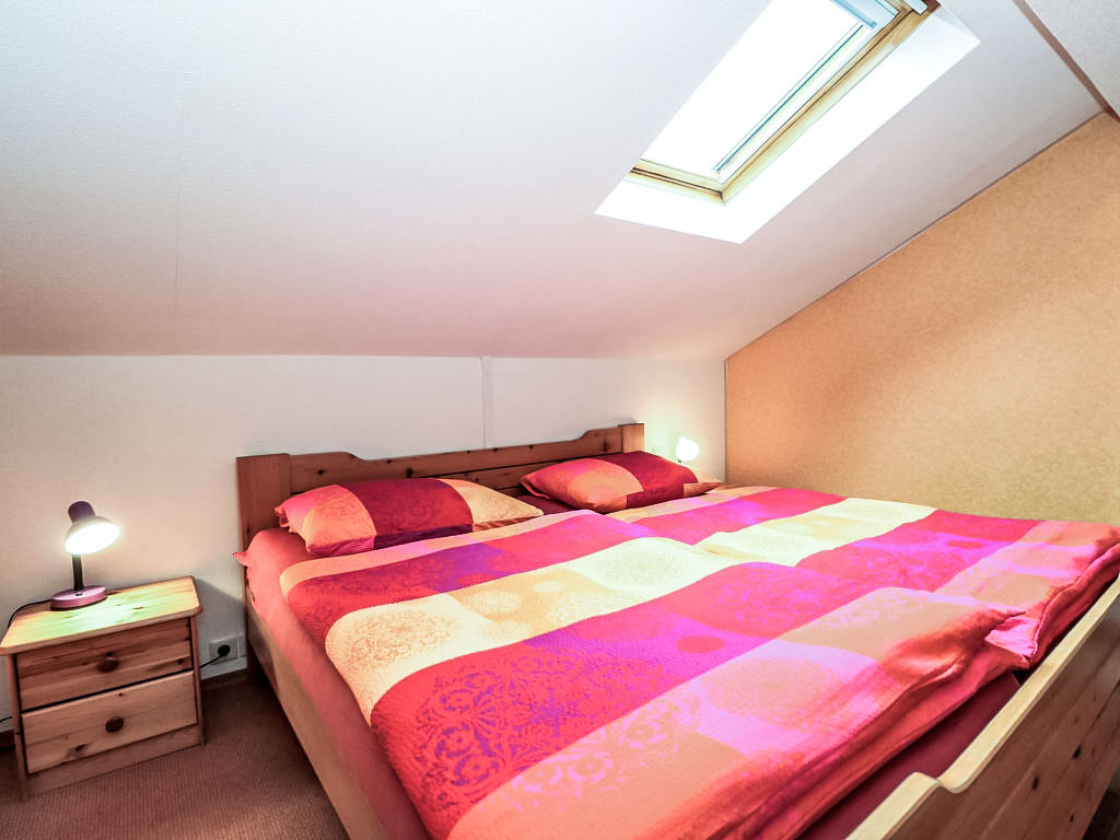 3-Zimmer-Wohnung 65 m2, im Dachgeschoss. Geräumig, abgeschrägt, einfach und zweckmässig eingerichtet: grosses Wohn-/Esszimmer 45 m2 mit Esstisch, Küchenblock und Sat-TV. 1 Doppelzimmer mit Dachfenster. 1 Zimmer mit 2 Betten. Offene Küche (4 Kochplatten, Backofen, Mikrowelle). Dusche/WC. Gartensitzplatz. Sehr schöne Sicht auf die Berge und die Landschaft. Zur Verfügung: Internet (Wireless LAN, gratis). Bitte beachten: Nichtraucher-Unterkunft. Maximal 1 Haustier/Hund erlaubt.