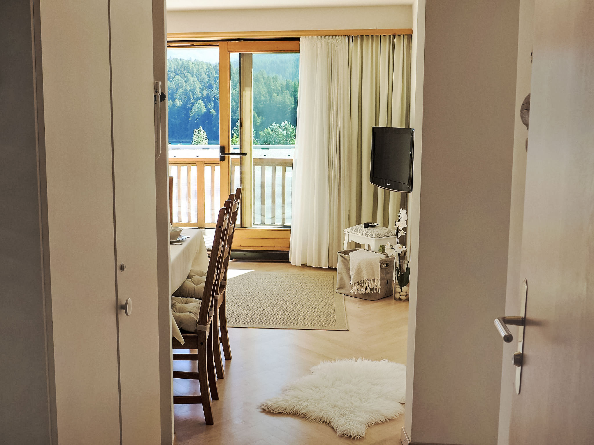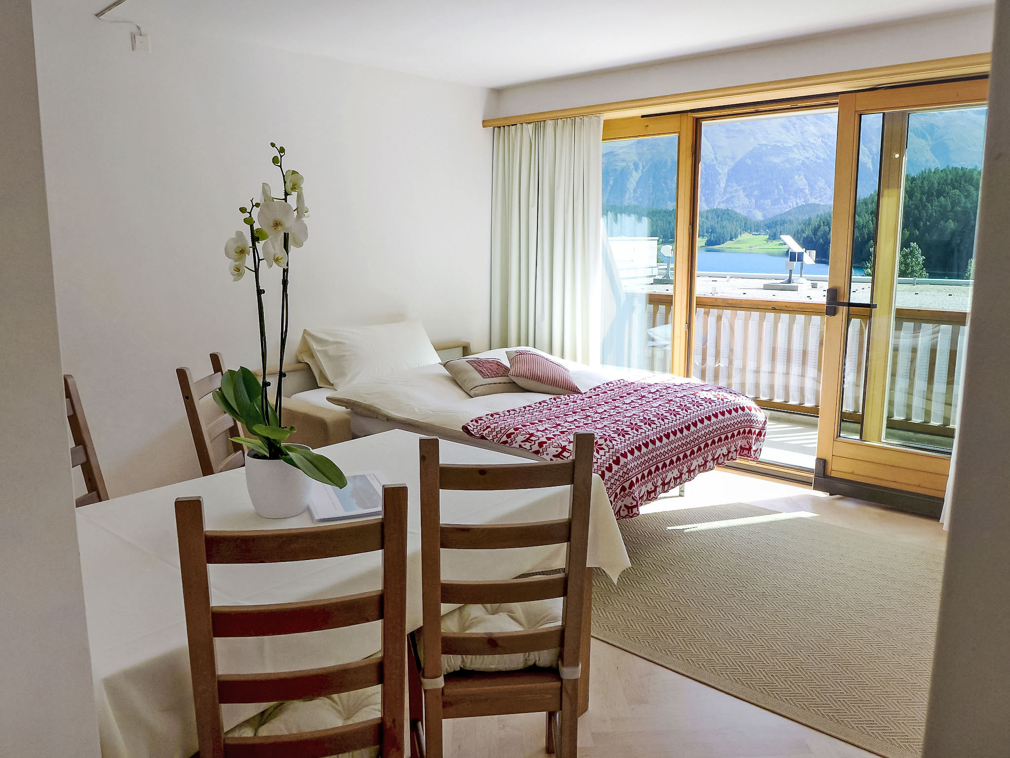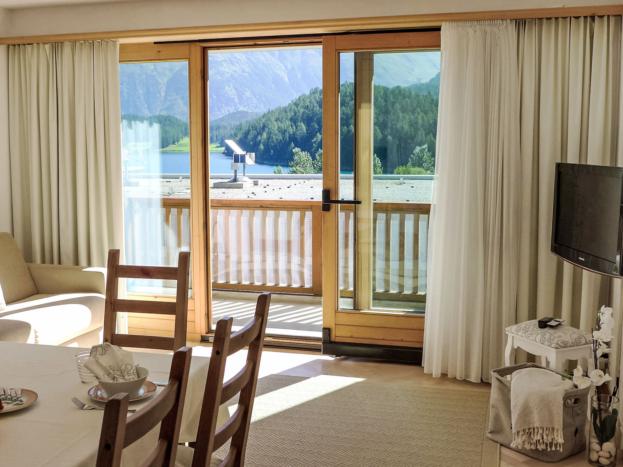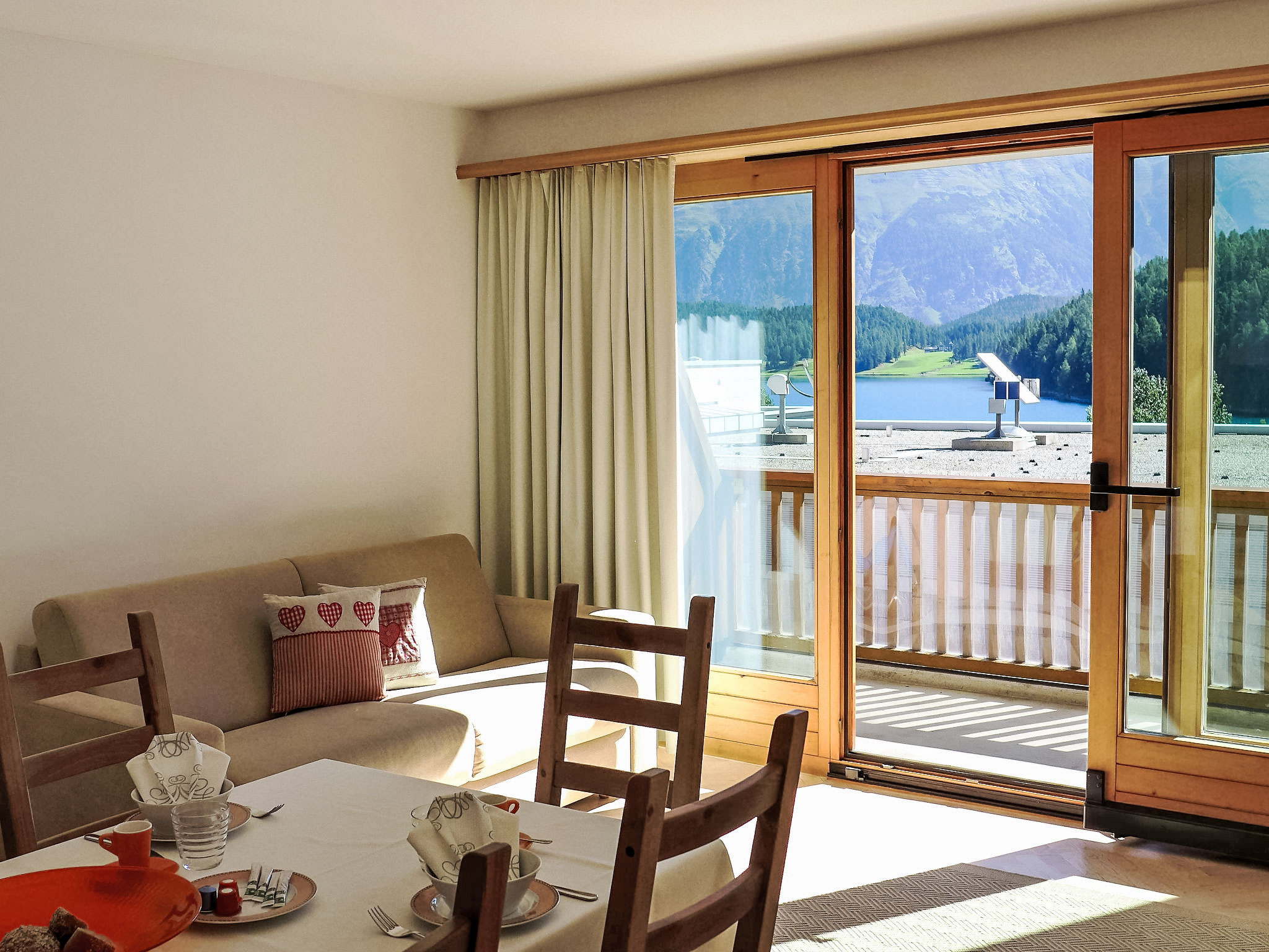 "Chesa Sur Ova 21", 2-Zimmer-Wohnung 65 m2 im 3. Stock. Hell, teilweise renoviert im Jahre 2017, komfortabel und modern eingerichtet: offenes Wohn-/Esszimmer mit 1 Klappbett (90 cm, Länge 200 cm), Esstisch und TV (Flachbildschirm). Ausgang zum Balkon, Richtung Osten. 1 Doppelzimmer mit 1 franz. Bett (1 x 160 cm, Länge 200 cm), Bad/WC. Ausgang zum Balkon. Offene Küche (Backofen, Geschirrspüler, 4 Glaskeramikherd Platten, Toaster, Wasserkocher, elektrische Kaffeemaschine, Kapseln für die Kaffeemaschine (Nespresso) extra). Dusche/WC. Parkettböden. Sicht auf den See, die Berge und die Ortschaft. Zur Verfügung: Haartrockner. Internet (Wireless LAN, gratis). Garage Nr. 5 auf dem Grundstück, Höhe 200 cm, Breite 230 cm. Bitte beachten: geeignet für Familien Wohnung auf Strassenseite. Nichtraucher-Unterkunft, Nichtraucher-Haus.