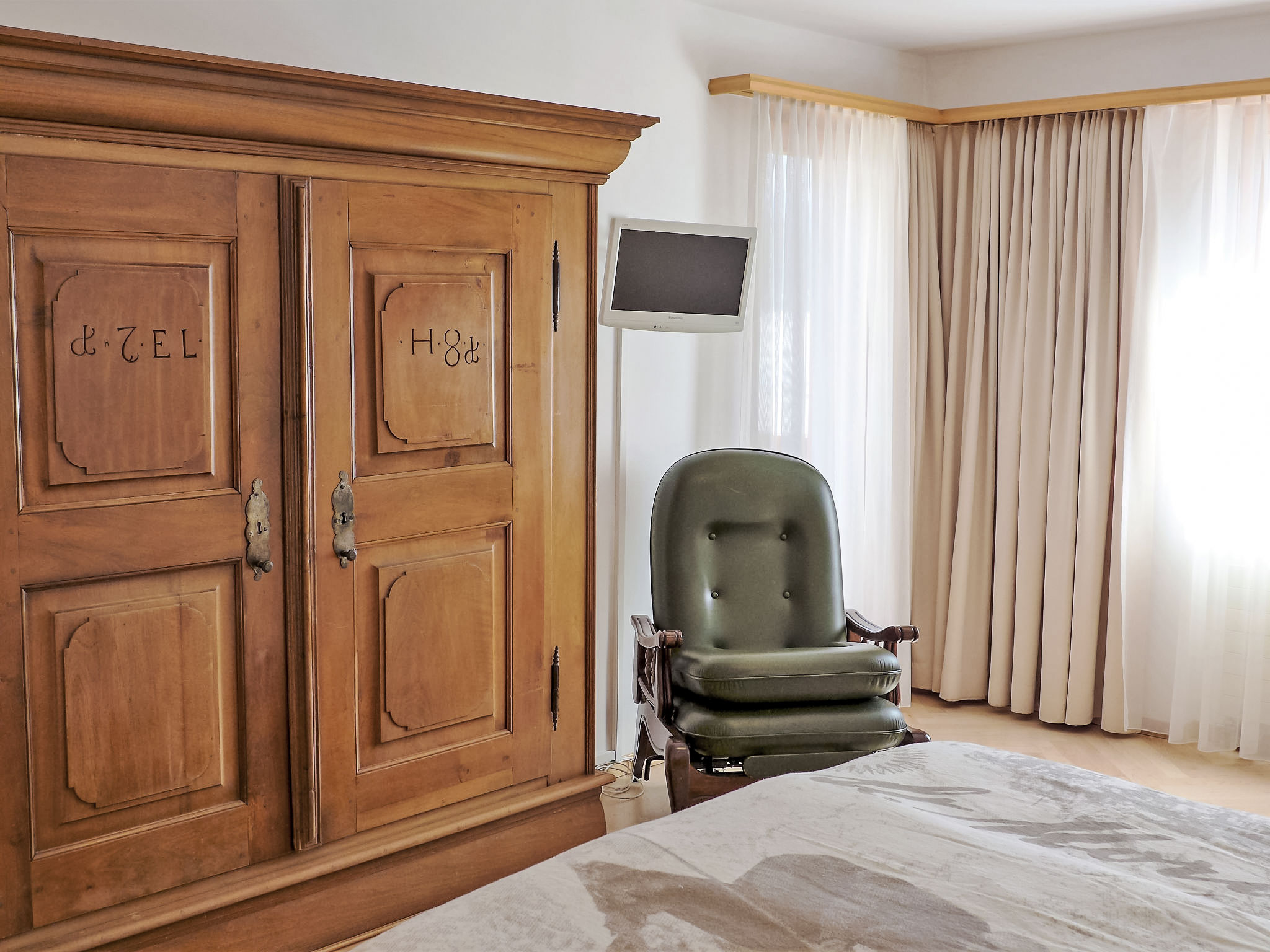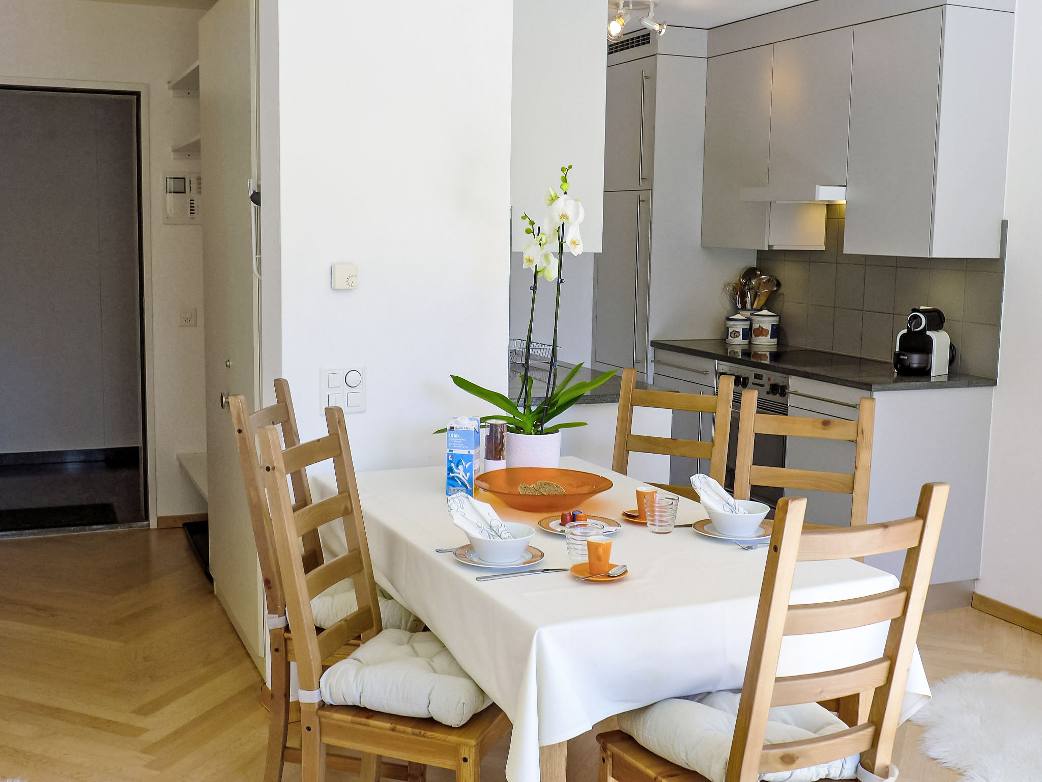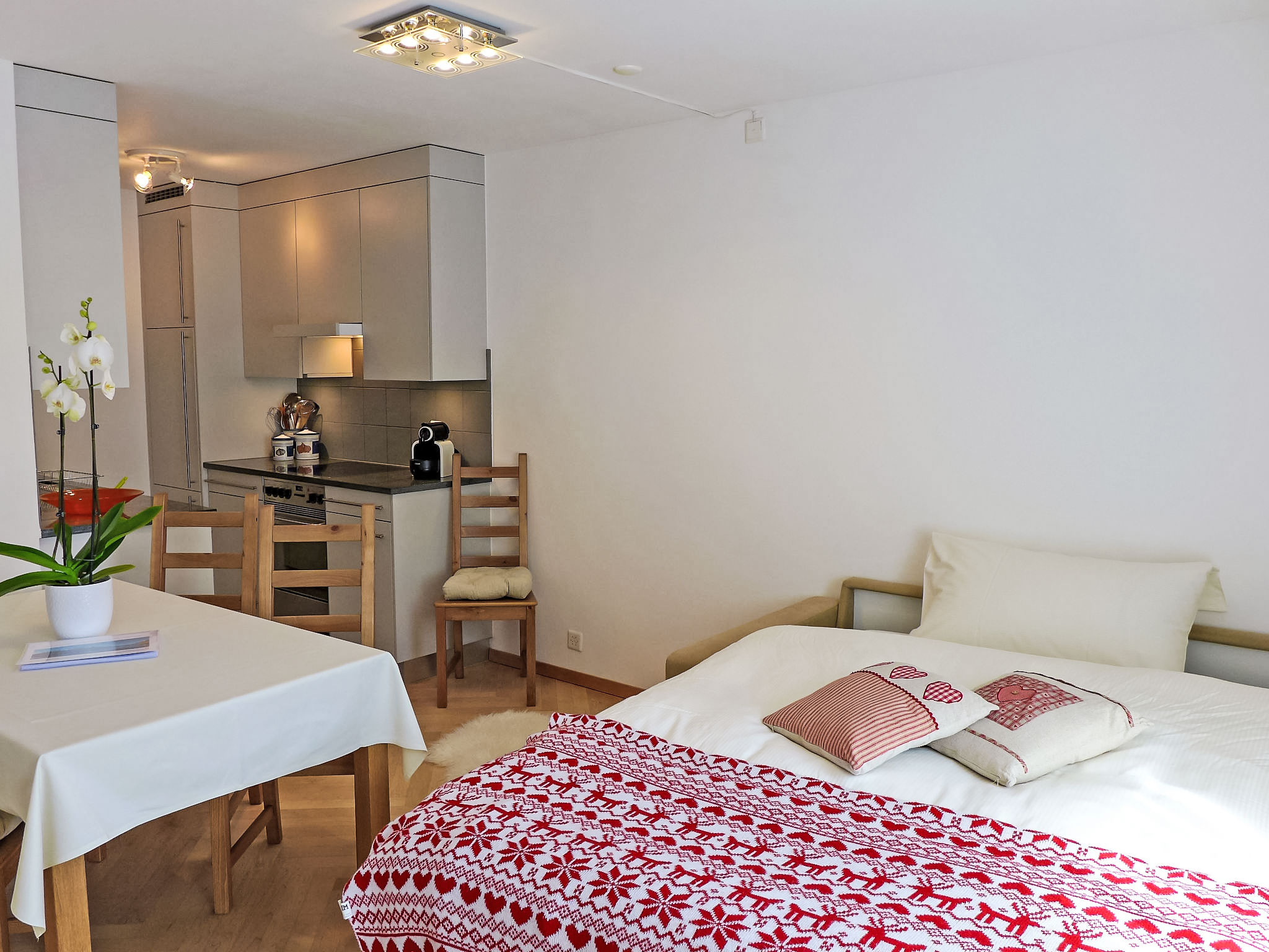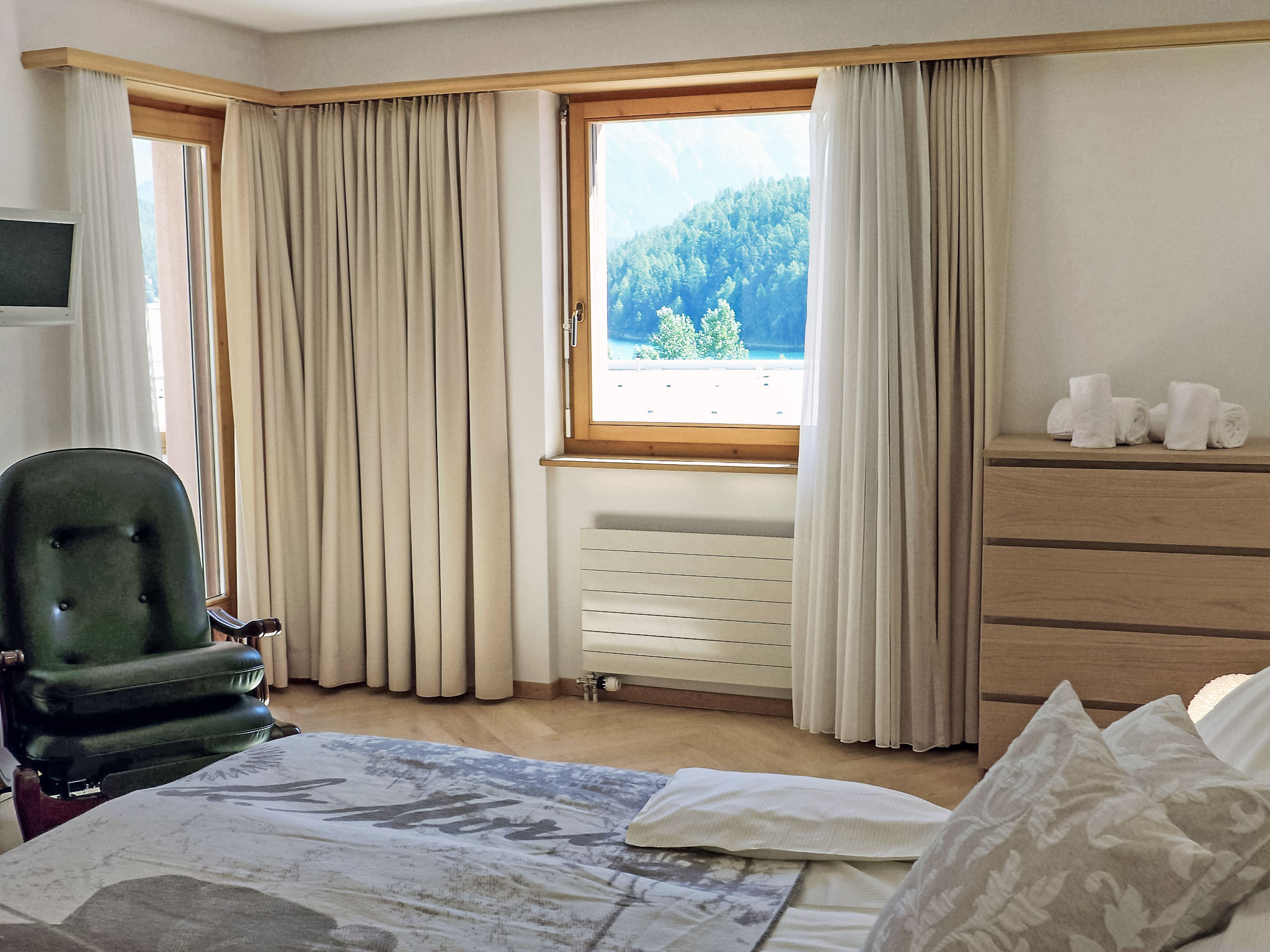 "Chesa Sur Ova 21", 2-Zimmer-Wohnung 65 m2 im 3. Stock. Hell, teilweise renoviert im Jahre 2017, komfortabel und modern eingerichtet: offenes Wohn-/Esszimmer mit 1 Klappbett (90 cm, Länge 200 cm), Esstisch und TV (Flachbildschirm). Ausgang zum Balkon, Richtung Osten. 1 Doppelzimmer mit 1 franz. Bett (1 x 160 cm, Länge 200 cm), Bad/WC. Ausgang zum Balkon. Offene Küche (Backofen, Geschirrspüler, 4 Glaskeramikherd Platten, Toaster, Wasserkocher, elektrische Kaffeemaschine, Kapseln für die Kaffeemaschine (Nespresso) extra). Dusche/WC. Parkettböden. Sicht auf den See, die Berge und die Ortschaft. Zur Verfügung: Haartrockner. Internet (Wireless LAN, gratis). Garage Nr. 5 auf dem Grundstück, Höhe 200 cm, Breite 230 cm. Bitte beachten: geeignet für Familien Wohnung auf Strassenseite. Nichtraucher-Unterkunft, Nichtraucher-Haus.