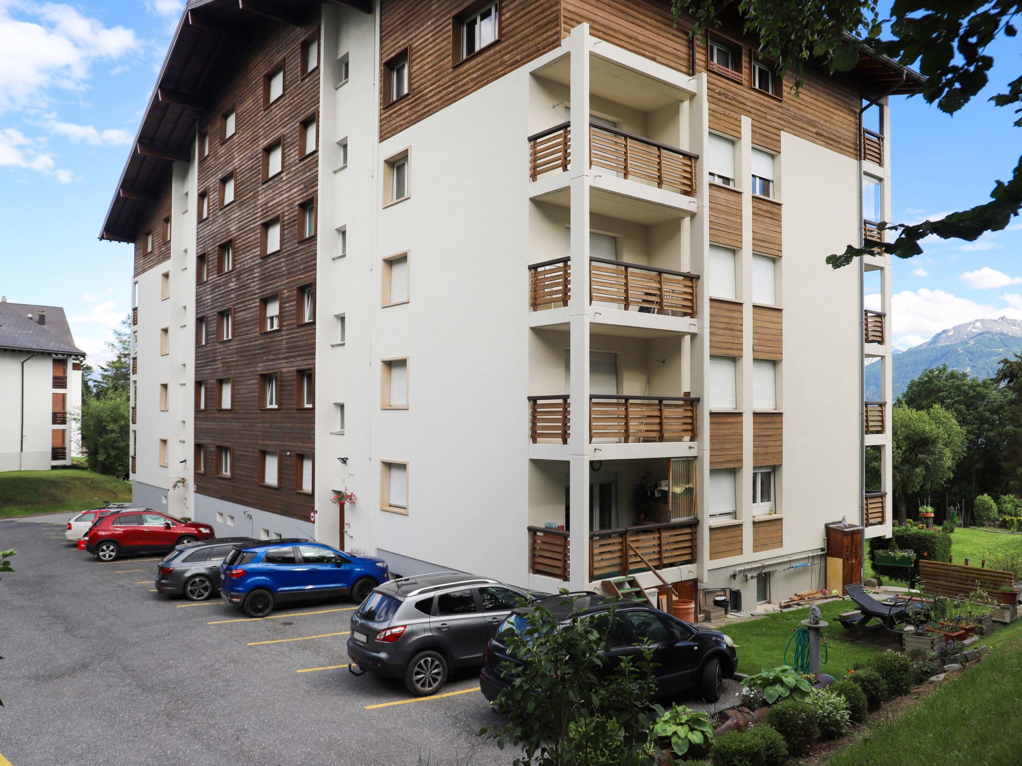 Mehrfamilienhaus "Belmont Est", auf 5 Stockwerken. Im Ortsteil la Combaz, am Ortsrand, 2 km vom Zentrum von Montana, ruhige, sonnige Lage, in einer Sackgasse. Im Hause: Fahrstuhl, Skiraum, Zentralheizung, Waschmaschine, Wäschetrockner (zur Mitbenutzung, extra). Parkplatz (beschränkte Anzahl) beim Haus. Restaurant 200 m, Bushaltestelle "Comba" 200 m. Skisportanlagen 1.1 km.