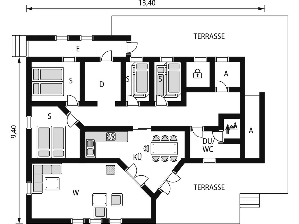 Wohnfläche 93 m². 4 Ceranfelder, Backofen, Mikrowelle, Geschirrspüler, Kühlschrank, Gefrierschrank (ca. 50 l), Kaffeemaschine, Wasserkocher, Toaster, Waschmaschine. Sat-TV, DVD, CD. Dusche/WC/Sauna. Elektroheizung, im Bad Fußbodenheizung, Kaminofen. Ferienhaus SOW 102 ca. 100 m entfernt. Maximale Belegung: 6 Personen. Flexibilität bei der Bettenaufteilung: Es stehen mehr Schlafmöglichkeiten zur Verfügung als die maximal zugelassene Personenzahl, diese darf dennoch nicht überschritten werden.