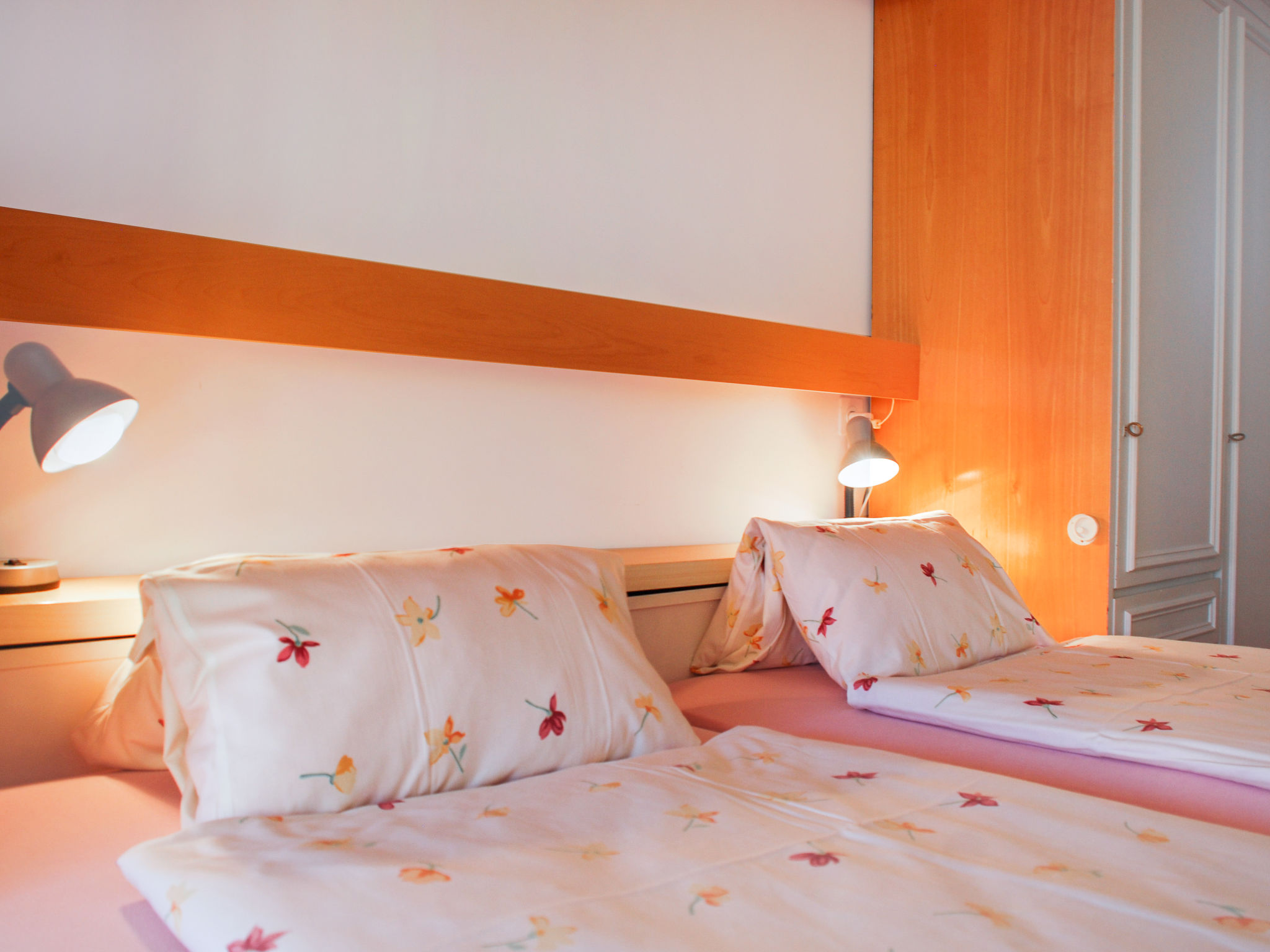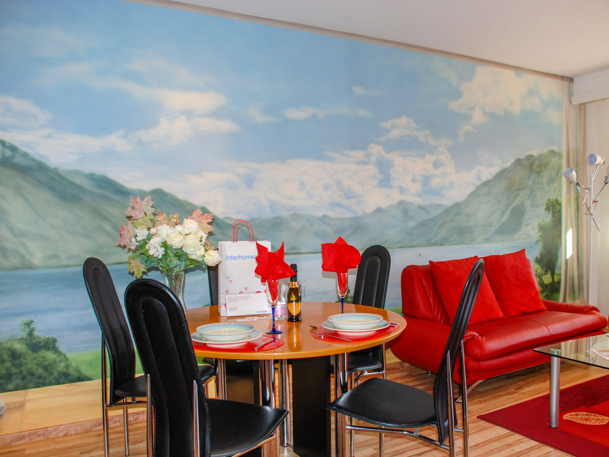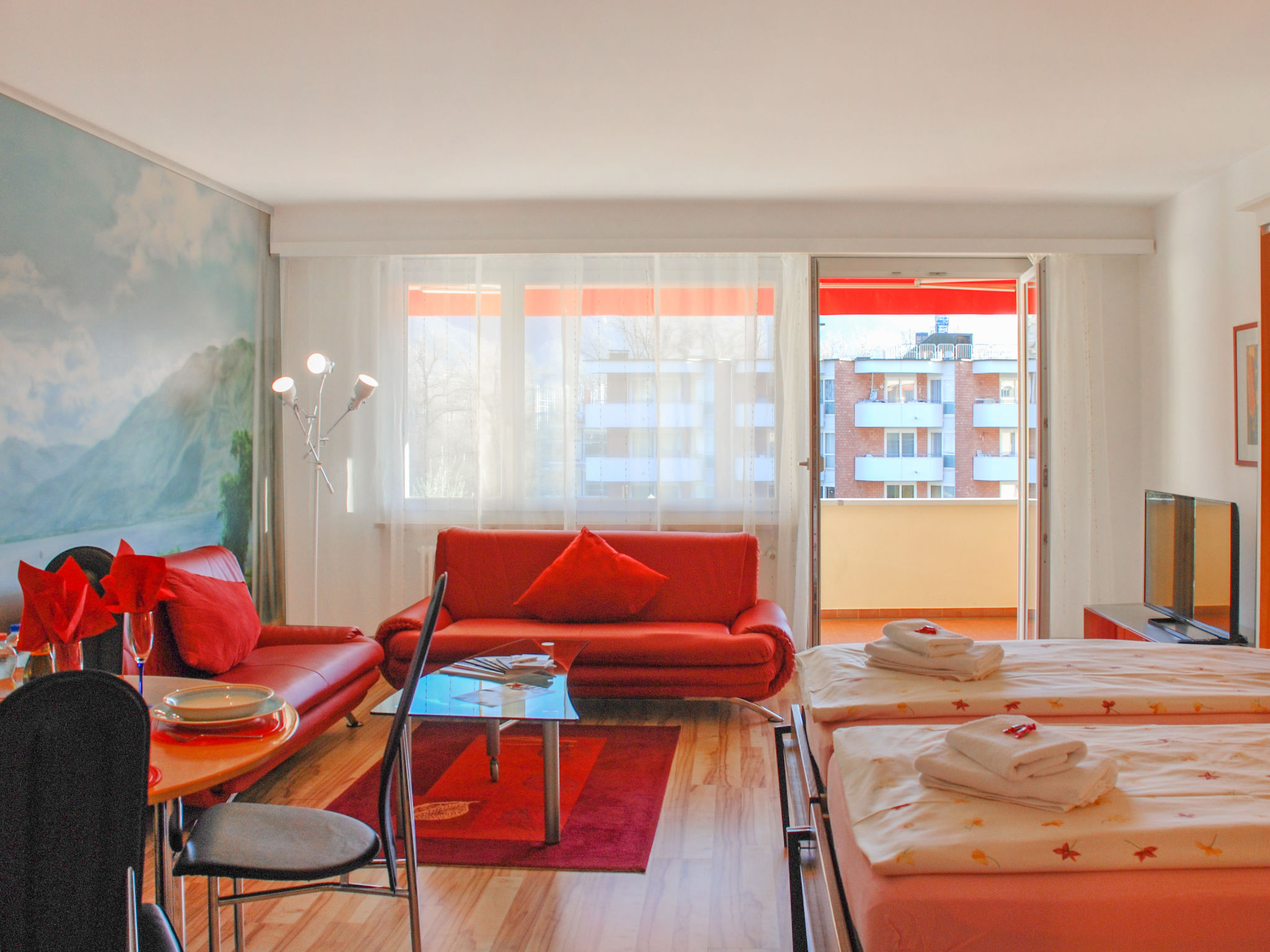 1-Zimmer-Wohnung 50 m2 im 5. Stock, Südwestlage. Geräumig und hell, modern und gemütlich eingerichtet: offenes Wohn-/Esszimmer mit 2 Wandschrankbetten (90 cm, Länge 200 cm), Esstisch und Kabel-TV (Flachbildschirm), Radio. Ausgang zum Balkon. Kleine Küche (3 Kochplatten, Backofen, Mikrowelle). Bad/WC. Balkon 11 m2, Westlage und Nordlage. Balkonmöbel, Liegestühle (2). Seitliche Sicht auf den See, die Berge und die Landschaft. Zur Verfügung: Haartrockner. Internet (Wireless LAN, gratis). Bitte beachten: Nichtraucher-Unterkunft.