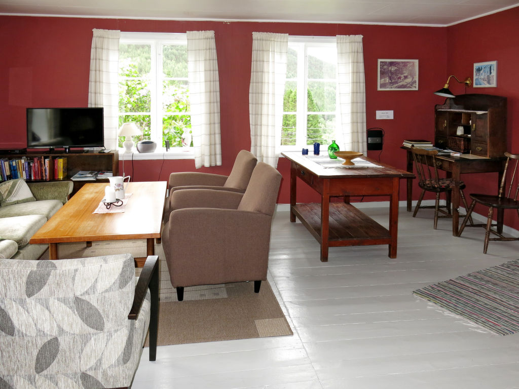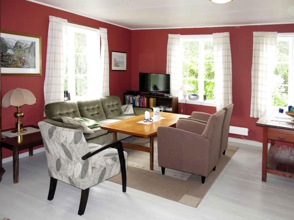 Das gemütliche Ferienhaus steht ca. 700 m oberhalb vom Sognefjord im Weiler Timberlid, mit Blick auf die Bucht von Kaupanger. Kaufmann in Kaupanger (4 km). Sogndal liegt 15 km nordwestlich. Schönes Wandergebiet, markierte Pfade beginnen in Hausnähe. Bade-und Angelmöglichkeiten im Fjord (1,5 km). 15-Fuß-Boot mit 6-PS-Motor (NOK 200 pro Tag) auf Bestellung zu mieten. Das Haus steht auf einem abfallenden Naturgrundstück. Volleyball- und Badmintonfeld zur gemeinsamen Nutzung mit den Ferienhäusern FJS 767 und FJS 771. Terrasse mit Fjordblick, Gartenmöbeln und transportablem Außengrill. Parken ca. 50 m, Pfad zum Haus.