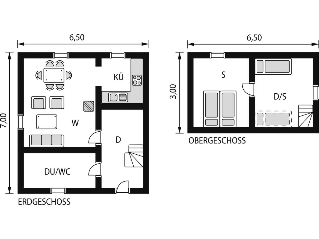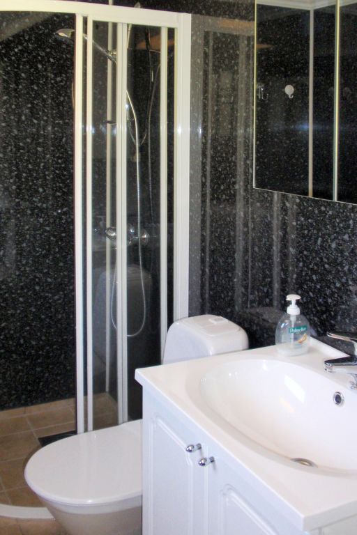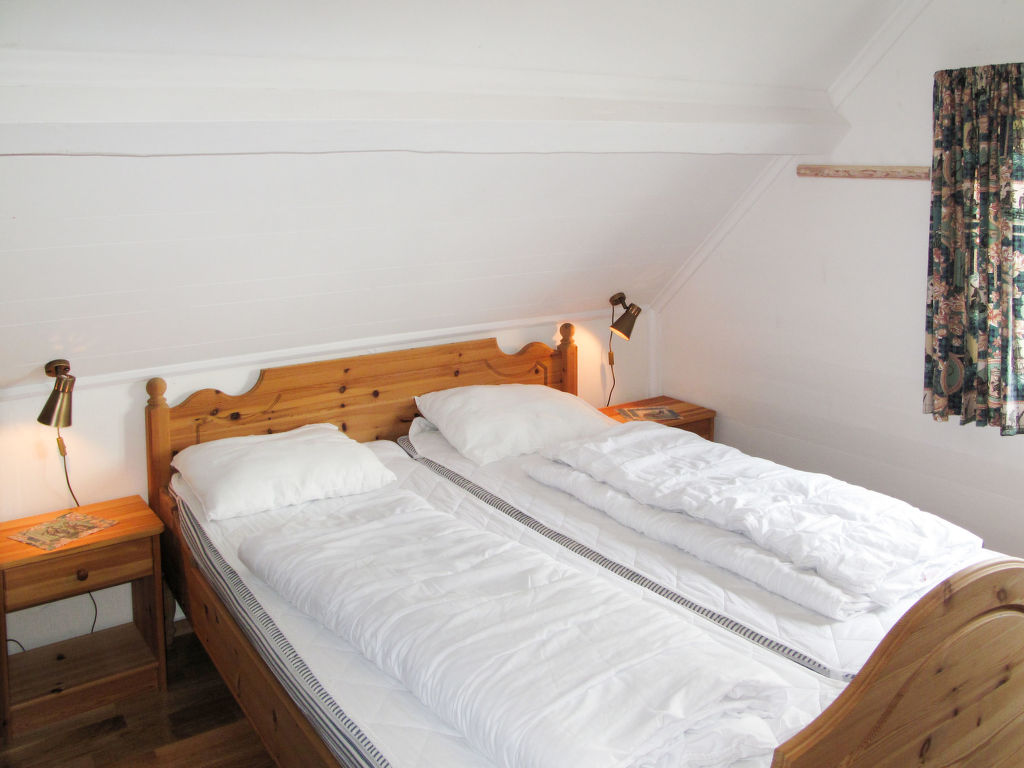 Wohnfläche 60 m². E-Herd 4 Platten, Backofen, Mikrowelle, Geschirrspüler, Kühlschrank, Gefriertruhe (ca. 80 l), Kaffeemaschine, Wasserkocher, Toaster, Waschmaschine. Sat-TV (deutsche Programme), Internetzugang (WLAN, inklusive). Dusche/WC. Elektroheizung, im Bad Fußbodenheizung, Holzofen (Holz inklusive). Eines der Betten ist ein Klappbett. Zwei Einzelbetten 0,75 m breit. Im Obergeschoss Dachschrägen. Maximale Belegung: 2 Erwachsene und 2 Kinder.