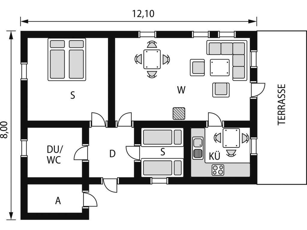 Wohnfläche 69 m². E-Herd 4 Platten, Backofen, Kühlschrank, Gefriertruhe (ca. 300 l), Kaffeemaschine, Wasserkocher, Toaster, Waschmaschine. Sat-TV (deutsche Programme), Internetzugang (WLAN, NOK 150 pro Woche). Dusche/WC. Elektroheizung, in Bad, Wohnzimmer und Küche Fußbodenheizung, Kaminofen.