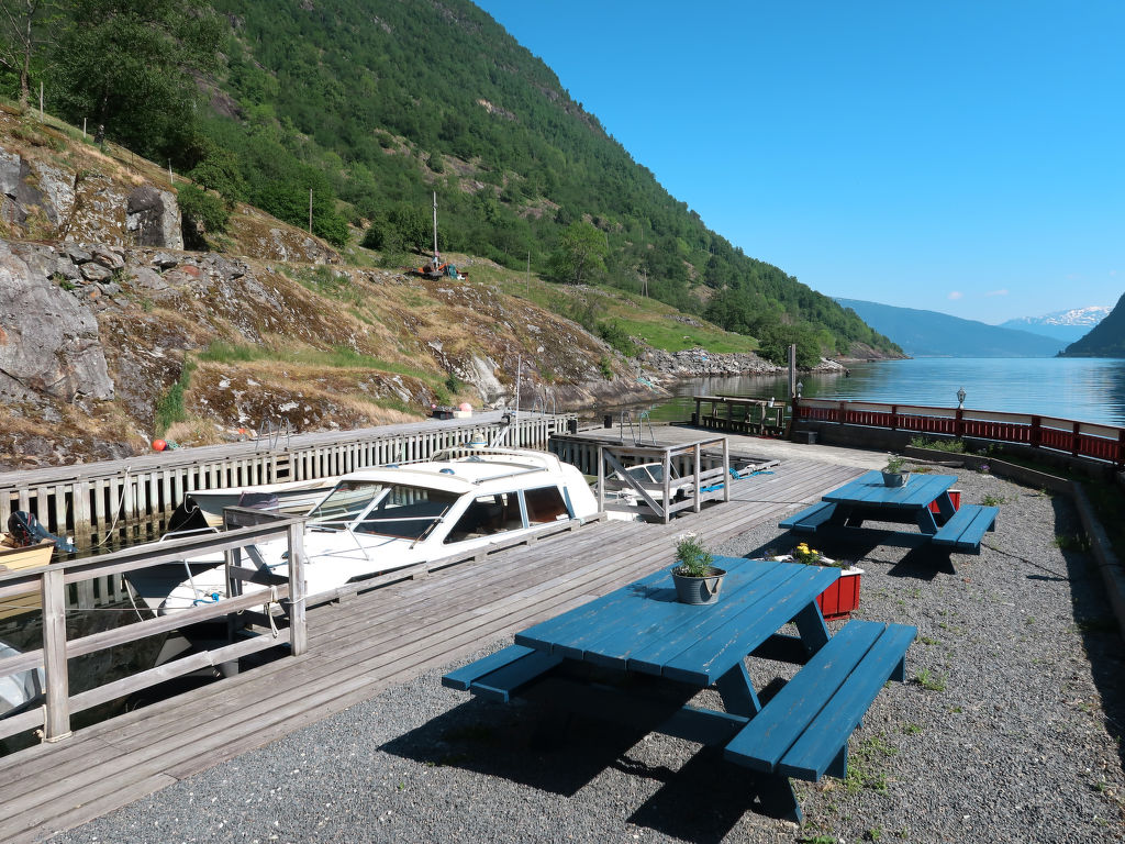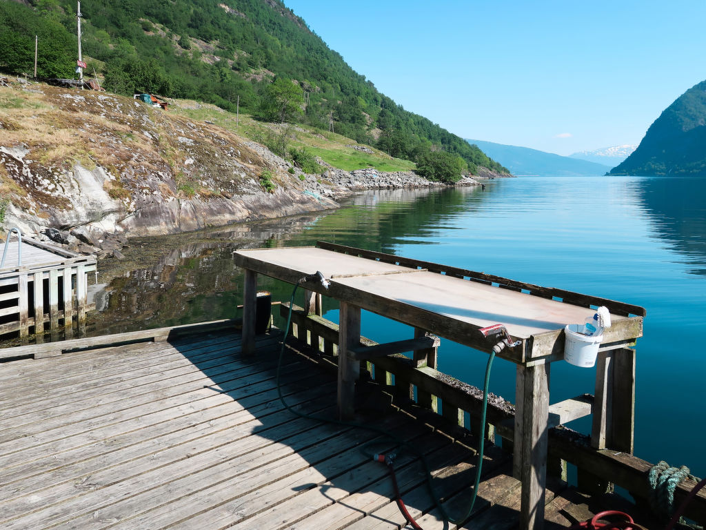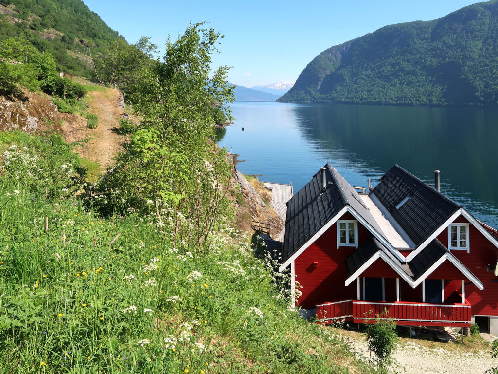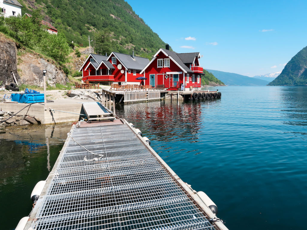 Direkt am Wasser, mit herrlichem Blick auf die fantastische Bergwelt und den Arnafjord, steht dieses gemütliche Ferienhaus, 4 km vom gleichnamigen Weiler. Kaufmann in Vik (14 km). Sogndal liegt 64 km (Fährverbindung) nordöstlich, Voss 84 km südlich. Dieser idyllische Ferienplatz befindet sich am Rande eines Naturschutzgebietes ohne Straßenanbindung, am Fuße des 1245 m hohen Berges Fagerdalsnipa. Anschluss an markierten Wanderpfad ins Hochgebirge (ca. 50 m). Bademöglichkeit vom Steg (zur gemeinsamen Nutzung) direkt am Haus. 17-Fuß-Boot mit 15-PS-Motor (NOK 1500/Woche) auf Bestellung zu mieten. 2 weitere 20-Fuß-Boote mit 50- bzw. 30-PS-Motor auf Anfrage zu mieten (NOK 3000 bzw. NOK 2500 pro Woche, Bestellung). Echolot nach Absprache vor Ort. Gute Angelmöglichkeiten (ZERTIFIZIERTES ANGELHAUS). Am Steg Fischverarbeitungsplatz mit Fließwasser. Das Haus steht zusammen mit dem angrenzenden Ferienhaus FJS 611 und den Ferienwohnungen FJS 609/610 auf einem Ufergrundstück. Freisitz (gemeinsame Nutzung) und eigene, kleine Fjordterrasse mit Gartenmöbeln und transportablem Außengrill. Die Gäste werden vom deutschsprechenden Besitzer mit seinem Boot auf der anderen Fjordseite am Parkplatz (1,2 km Luftlinie) abgeholt.
