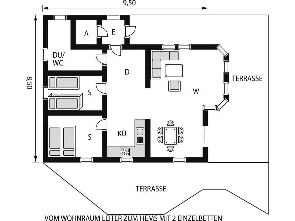 Wohnfläche 53 m². 4 Ceranfelder, Backofen, Mikrowelle, Geschirrspüler, Kühlschrank, Gefrierschrank (ca. 80 l), Kaffeemaschine, Wasserkocher, Toaster. Sat-TV (deutsche Programme), DVD. Dusche/WC. Wärmepumpenheizung, Kaminofen. Maximale Belegung: 6 Personen. Flexibilität bei der Bettenaufteilung: Es stehen mehr Schlafmöglichkeiten zur Verfügung als die maximal zugelassene Personenzahl, diese darf dennoch nicht überschritten werden.