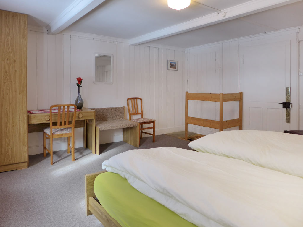 3-Zimmer-Wohnung 80 m2 auf 2 Stockwerken, im erhöhten Erdgeschoss. Geräumig, gemütlich und mit viel Holz eingerichtet: Deckenhöhe 185 - 200 cm. Wohn-/Schlafzimmer mit 2 Betten (90 cm, Länge 200 cm), 1 Diwanbett, Sat-TV, Flachbildschirm und Radio. Esszimmer mit Esstisch. Ausgang zum Balkon. Offene Küche (3 Kochplatten, Backofen, Geschirrspüler, Toaster, Wasserkocher, Mikrowelle, elektrische Kaffeemaschine, Racletteofen, Fondue Set (Käse)) mit Esstisch. Dusche/WC. Obergeschoss: (steile Treppe) 1 grosses Doppelzimmer mit 2 Betten (90 cm, Länge 200 cm). Kleiner Balkon. Balkonmöbel, Abstellkammer. Herrliche Sicht auf die Berge und die Ortschaft. Zur Verfügung: Waschmaschine, Babybett bis 2 Jahre (extra), Haartrockner. Internet (Wireless LAN, gratis). Parkplatz. Bitte beachten: Nichtraucher-Unterkunft.
