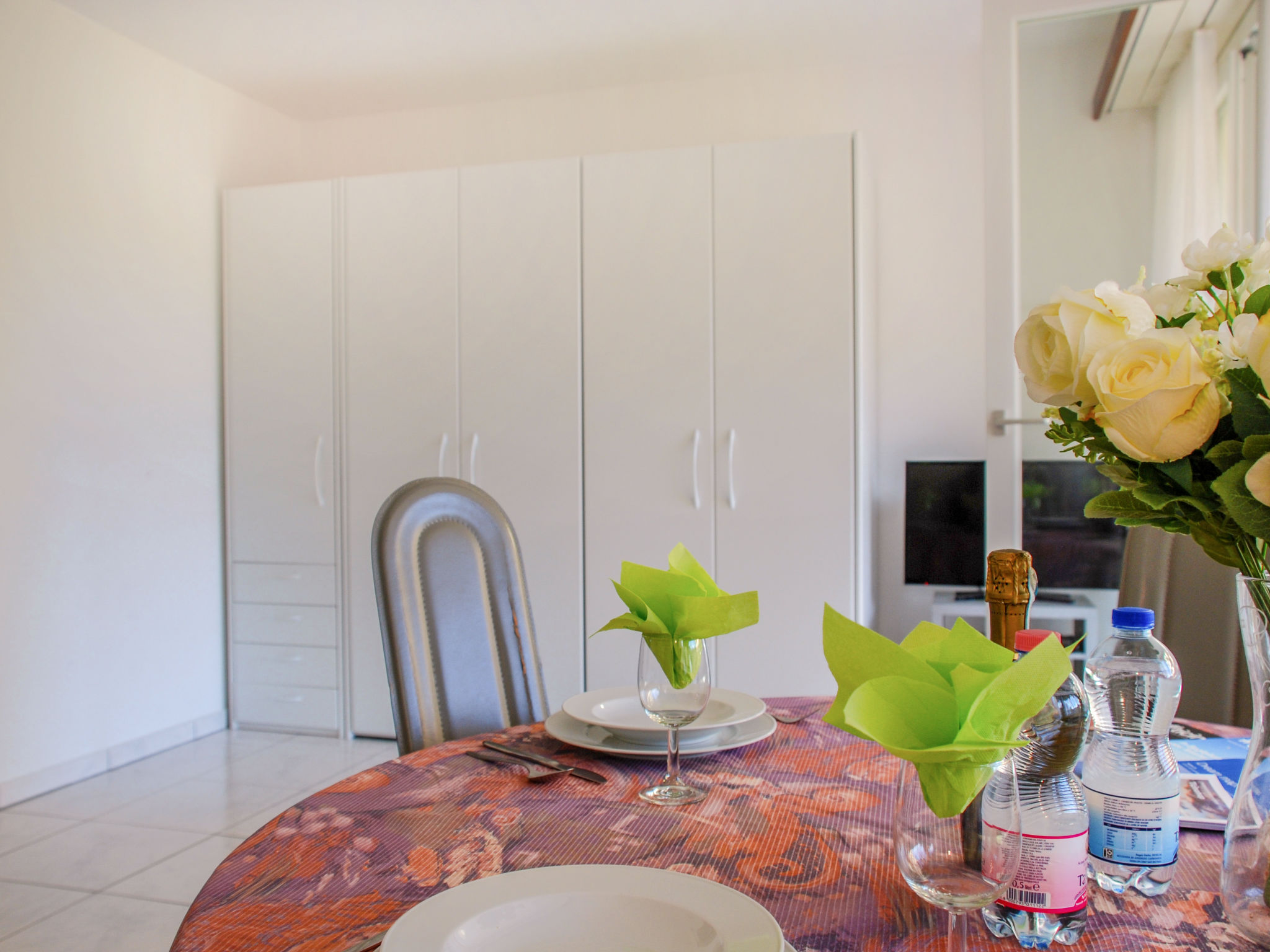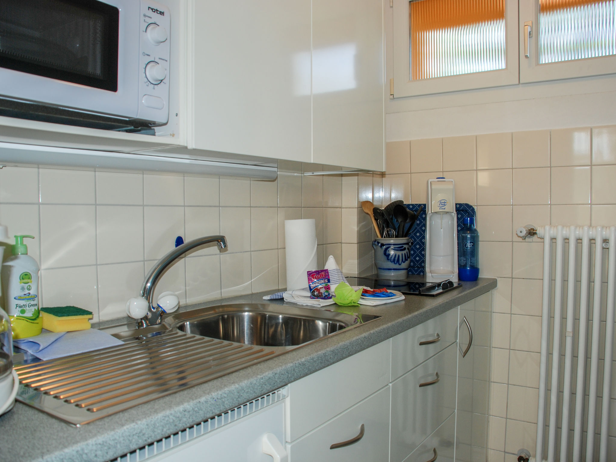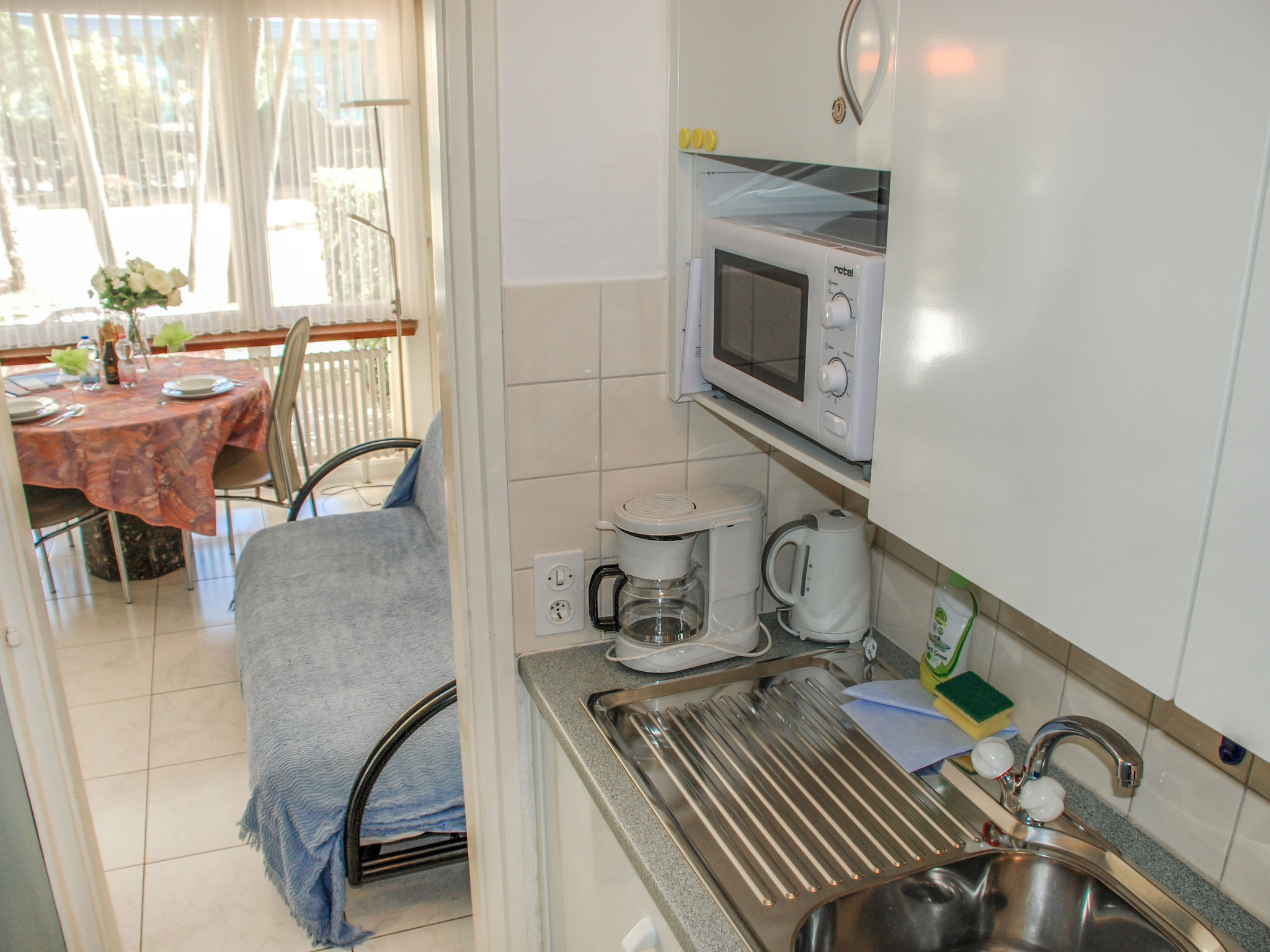 "Gartensitzplatz", 1-Zimmer-Wohnung 30 m2, im Erdgeschoss, Südwestlage. Hell, zweckmässig und gemütlich eingerichtet: offenes kleines Wohn-/Esszimmer mit 2 Wandschrankbetten (90 cm, Länge 200 cm), Esstisch und Kabel-TV (Flachbildschirm), Radio, CD und Stereoanlage. Ausgang zum Gartensitzplatz. Kleine Küche (2 Glaskeramikherd Platten, Mikrowelle, Racletteofen, Fondue Set (Käse)). Dusche/WC. Heizung. Gartensitzplatz teilweise überdacht. Terrassenmöbel, Liegestühle (1). Schöne Sicht auf den Garten. Bitte beachten: Nichtraucher-Unterkunft.