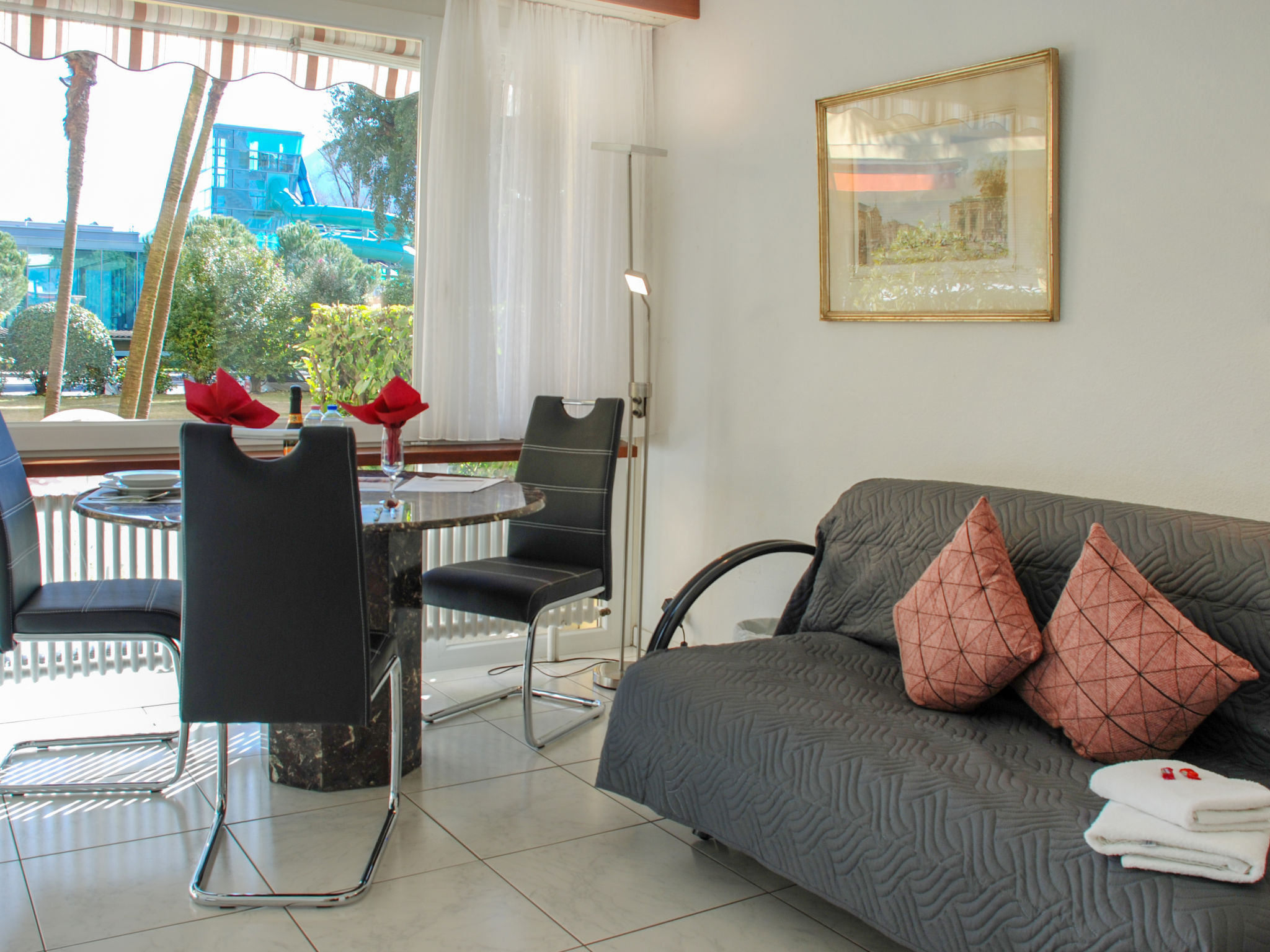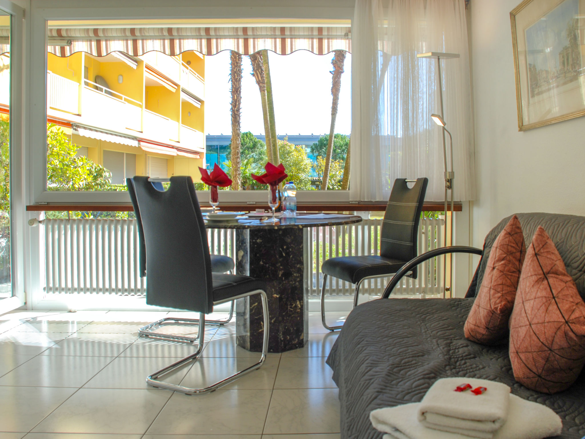 Locarno: Grosses, komfortables Appartementhaus "Residenza Lido", auf 6 Stockwerken, umgeben von Bäumen und Wiesen. Am Ortsrand, 1.8 km vom Zentrum von Piazza Grande, sonnige Lage, exzellente Lage: Absolut zentral und dennoch ruhig, 50 m vom See, im Grünen. Im Hause: Empfang, Aufenthaltsraum, Fahrstuhl, Dachterrasse, Zentralheizung. Zufahrt bis zum Haus. Parkplatz (beschränkte Anzahl, extra) beim Haus, öffentliche Parkplätze 100 m auf der Strasse extra. Einkaufsgeschäft 1.1 km, Lebensmittelgeschäft 1.1 km, Restaurant, Café 100 m, Zentrum zu Fuss in 15 Minuten erreichbar, Bushaltestelle "Linie 3 + 4" 50 m, Bahnstation "Locarno SBB-CFF" 3 km, Freibad, Hallenbad 50 m, Thermalbad "Termali & Salini" 80 m, Strandbad 50 m. Golfplatz (18 Loch) 6 km, Tennis 400 m, Minigolf 2 km, Wanderwege ab Haus 50 m. Bekannte Seen in der Umgebung sind gut erreichbar: Lago Maggiore, Lago di Lugano, Lago di Como. Wandergebiete: Cardada, Monte Verità, Centovalli, Vallemaggia, Valle Onsernone, Valle Verzasca. Bitte beachten: Für Kleinkinder nicht geeignet nicht geeignet für Kinder unter 14 Jahren. Ferienwohnung Ref. CH6600.410 befindet sich auf dem gleichen Grundstück. ,Achtung: Der Parkplatz muss mindestens 3 Tage vor Anreise gebucht werden damit dieser bestätigt und zugeteilt werden kann. CHF5.- /Tag Bitte beachten, dass ab 2020 die Kurtaxen nicht mehr im Preis inkludiert sind und vor Ort einkassiert werden. CHF 3,25 Tag/Person.