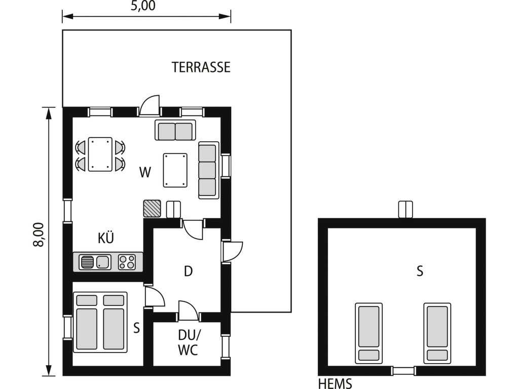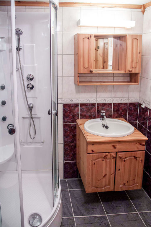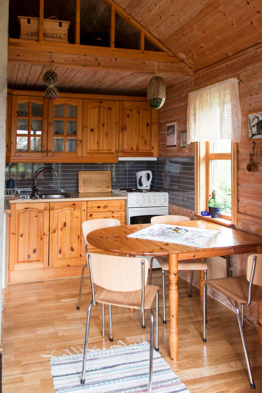 Wohnfläche 50 m². E-Herd 4 Platten, Backofen, Mikrowelle, Kühlschrank, Kaffeemaschine, Wasserkocher. TV. Dusche/WC. Elektroheizung, im Bad Fußbodenheizung, Kaminofen. Leiter ins Obergeschoss, dort eingeschränkte Stehhöhe.
