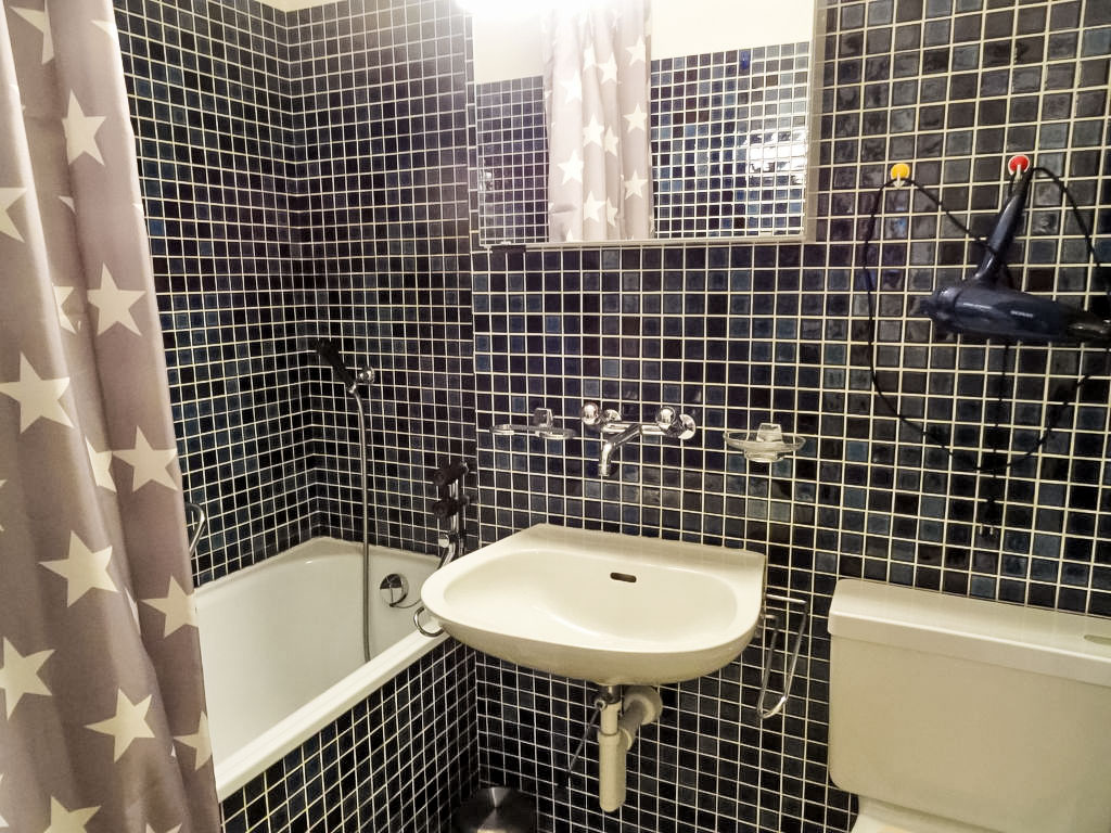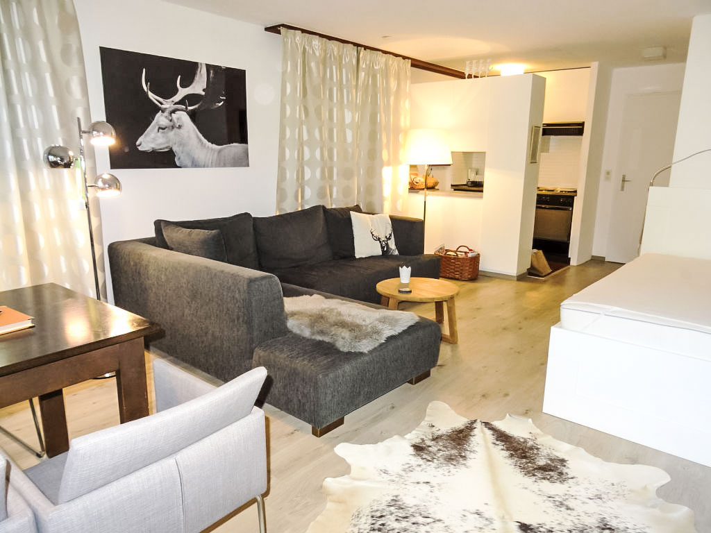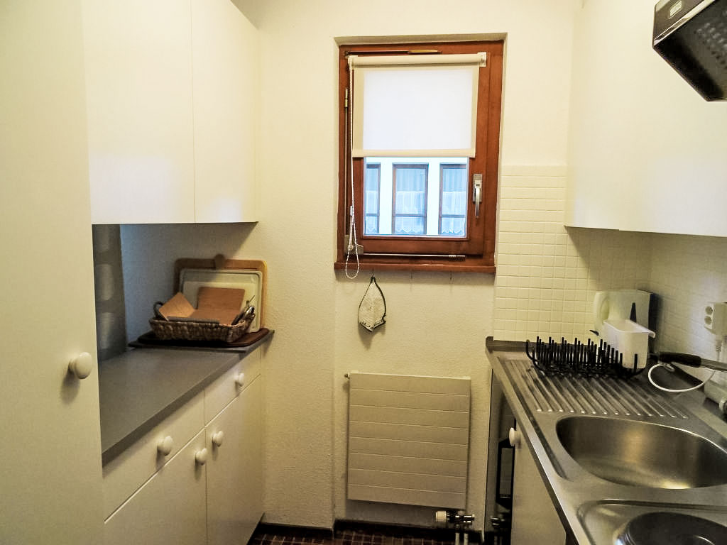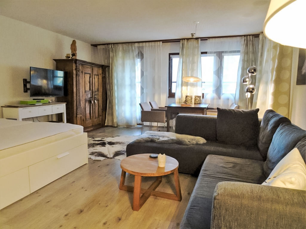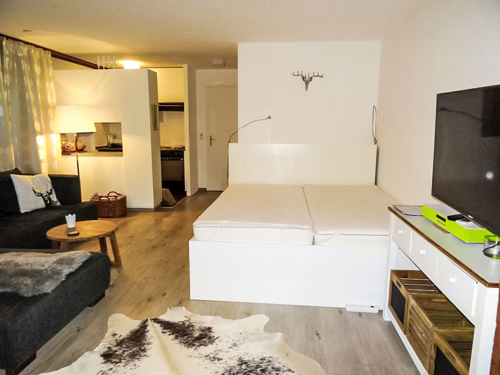 1-Zimmer-Wohnung 40 m2. Renoviert im Jahre 2013, geschmackvoll eingerichtet: Wohn-/Schlafzimmer mit 1 Doppelbett (180 cm), Kabel-TV (Flachbildschirm), Stereoanlage. Offene Küche (Backofen). Bad/WC. Parkettböden. Gartensitzplatz. Terrassenmöbel. Sicht auf die Berge. Zur Verfügung: Internet (Wireless LAN). Bitte beachten: Nichtraucher-Unterkunft.