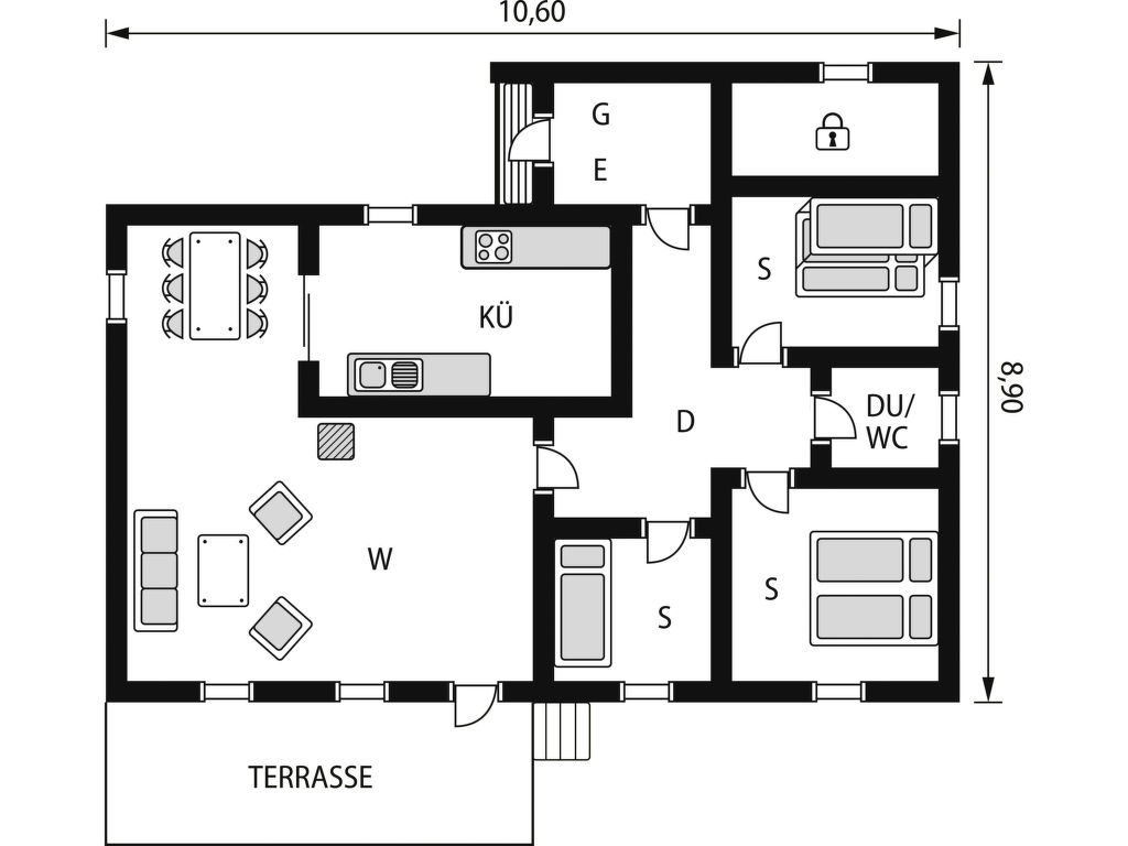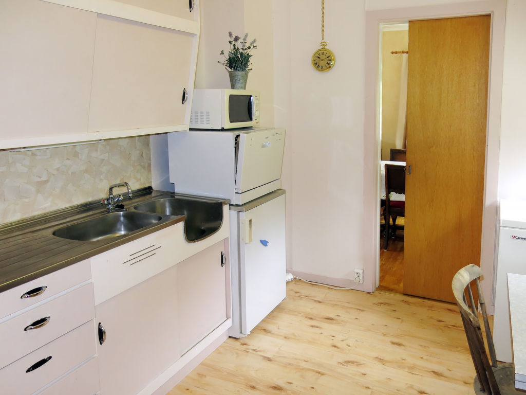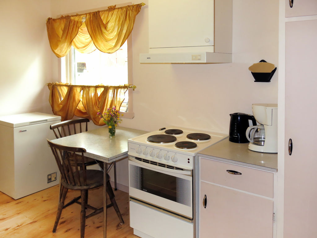 Wohnfläche 85 m². E-Herd 4 Platten, Backofen, Mikrowelle, Geschirrspüler, Kühlschrank, Gefriertruhe (ca. 60 l), Kaffeemaschine, Wasserkocher, Toaster, Waschmaschine. Sat-TV, DVD. Dusche/WC. Elektroheizung, im Bad Fußbodenheizung, Kaminofen.