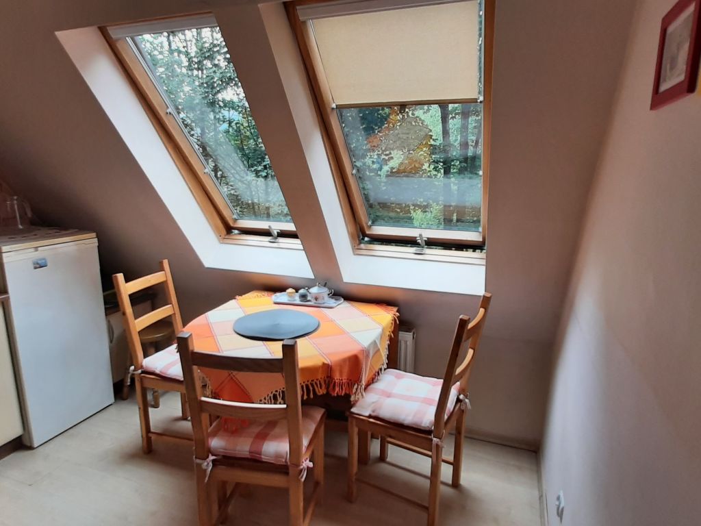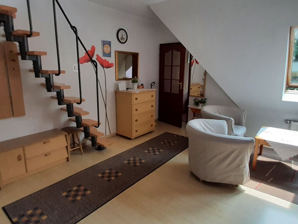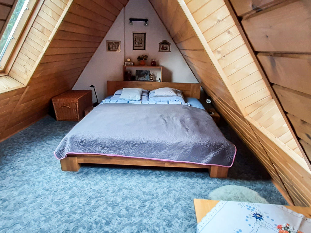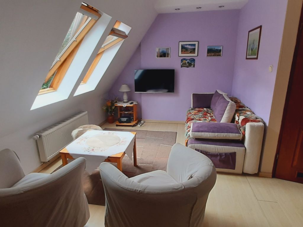 3-Zimmer-Wohnung 50 m2 auf 2 Stockwerken im 2. Stock. Hell, teilweise abgeschrägt, schön und gemütlich eingerichtet: abgeschrägtes, offenes Wohn-/Schlafzimmer mit Dachfenster mit 1 Doppeldiwanbett und TV (Flachbildschirm), Radio. 1 abgeschrägtes Zimmer mit 1 Bett. Kleine Küche (2 Kochplatten, Mikrowelle, elektrische Kaffeemaschine). Dusche/WC. Dachgeschoss: (steile Treppe) 1 abgeschrägtes, offenes Zimmer mit Dachfenster mit 2 Schlafmöglichkeiten. Sicht auf die Berge. Parkplatz beim Haus. Bitte beachten: Nichtraucher-Unterkunft. TV nur PL. Das Zimmer im Obergeschoss hat keine Tür.